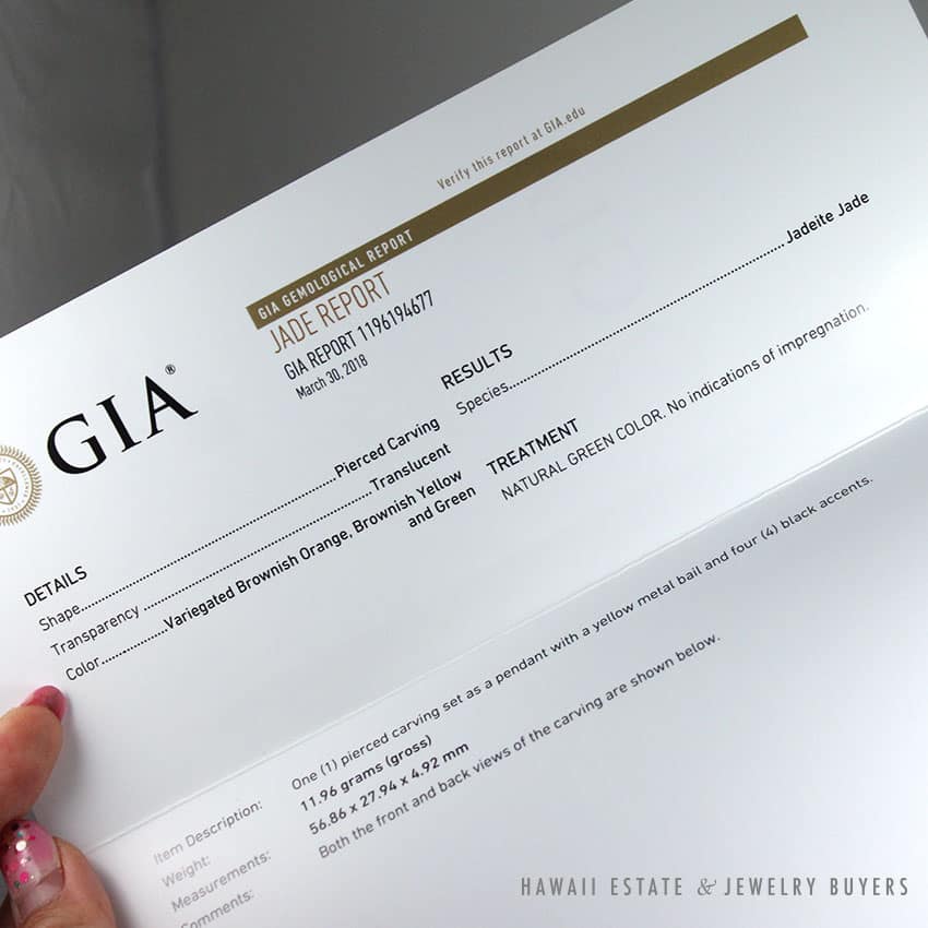 DescriptionPlease refer to incldued GIA report No. 1196194677: NATURAL GREEN COLOR. No indications of impregnation. $2,600.00Out of stockSKU: 0810-04Category: Pre-owned Vintage JewelryRelated StylesThick Certified Grade A Natural Jade Hinged Bangle$4,250.00Certified Grade A Mottled Green Graduated Bead Necklace$8,000.00Estate Large 18mm South Sea Pearl Necklace$18,000.00Certified White Nephrite Jade Pendant with Multicolored Stones$8,700.00
