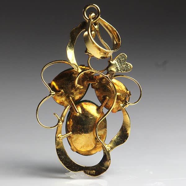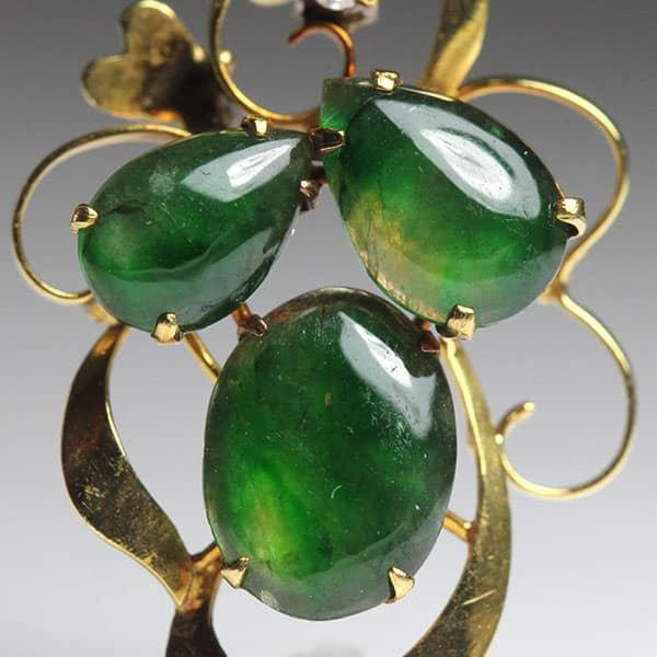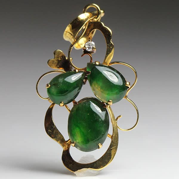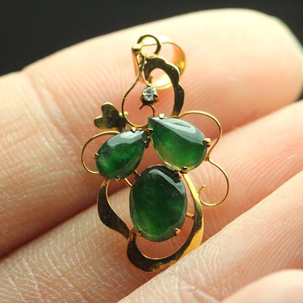 DescriptionSOLD – Please contact us if you are looking for a similar item.14K Yellow Gold JacketStamped 5853 translucent Deep Green Fine Imperial Jade CabochonsSKU: 0911-01$1,800.00Out of stockSKU: 0911-01Category: Pre-owned Vintage JewelryRelated StylesCertified Grade A Natural Jade Cabochon Ring$5,800.00Natural Grade A White Jade Archer Ring$3,800.00Antique Ceremonial Certified Nephrite Jade Flute$16,000.001.65ct Natural Pink Sapphire and Diamond Ring$6,500.00