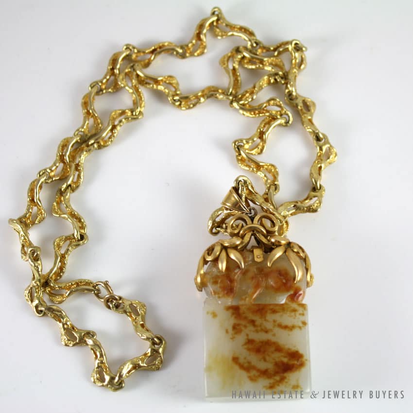 IMPORTANT 19C CHINESE MUTTON FAT WHITE JADE CARVED OX W/HEAVY 14K YELLOW GOLD CHAIN NECKLACE