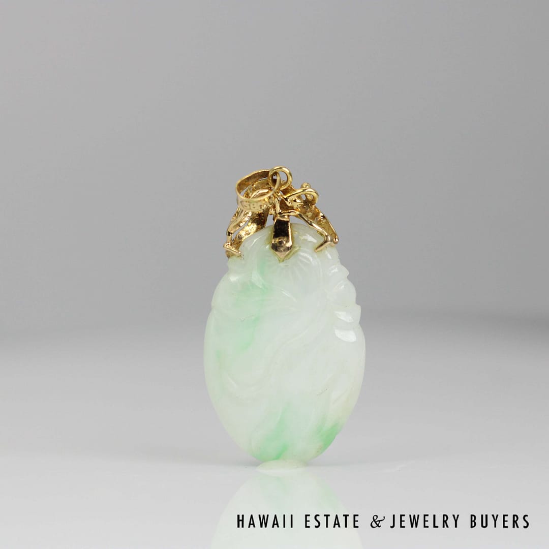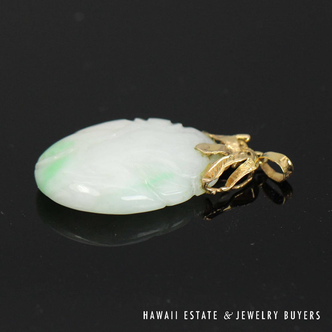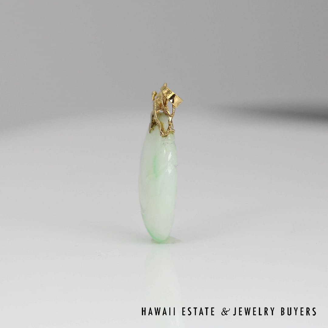 This striking pendant features a 'Moss in Snow' jade stone measuring 36 by 20 millimeters, set in elegant 14 karat yellow gold-a unique and natural statement of refined beauty.