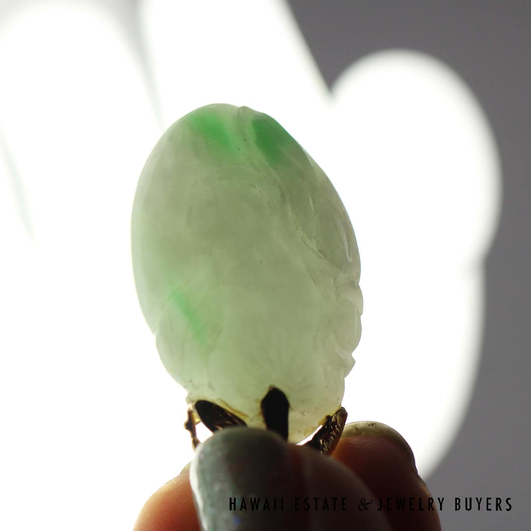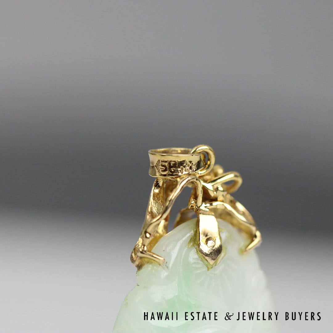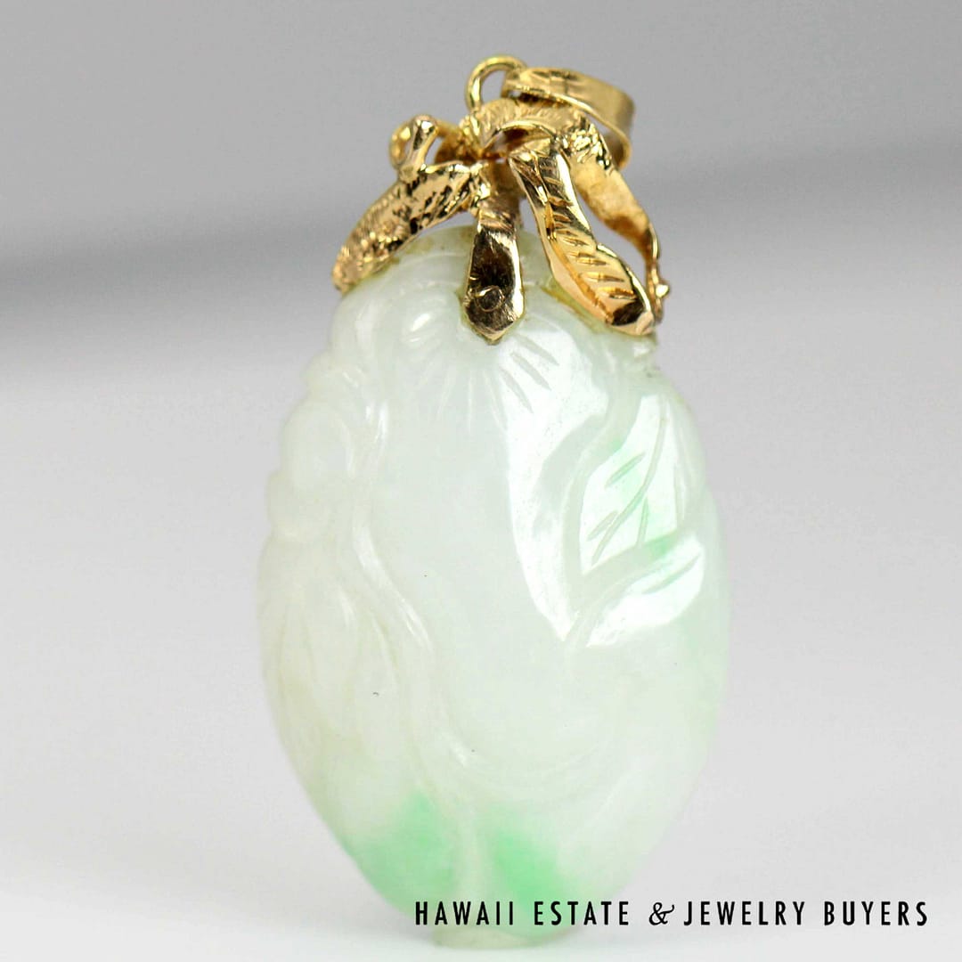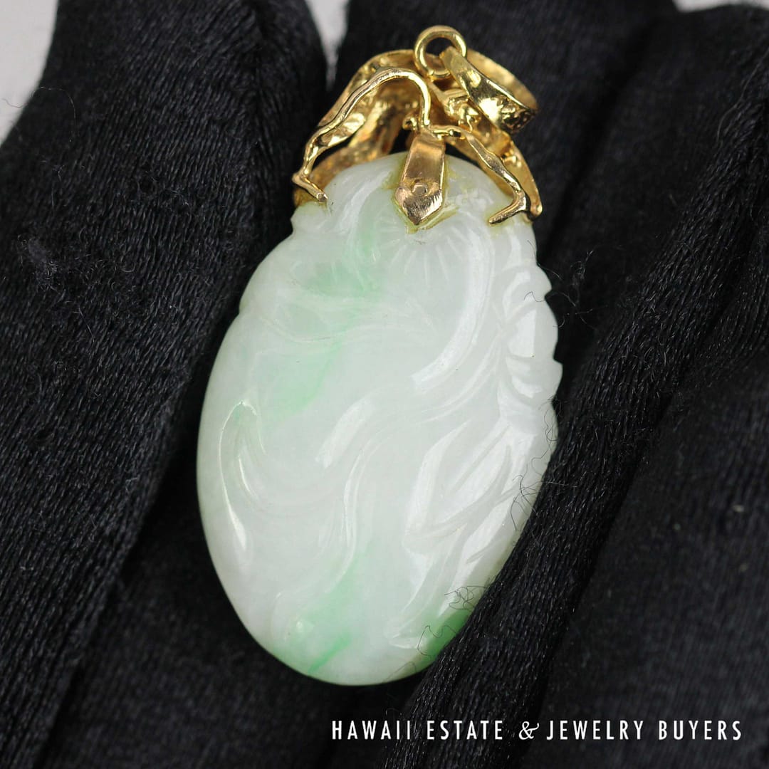 This striking pendant features a 'Moss in Snow' jade stone measuring 36 by 20 millimeters, set in elegant 14 karat yellow gold-a unique and natural statement of refined beauty.