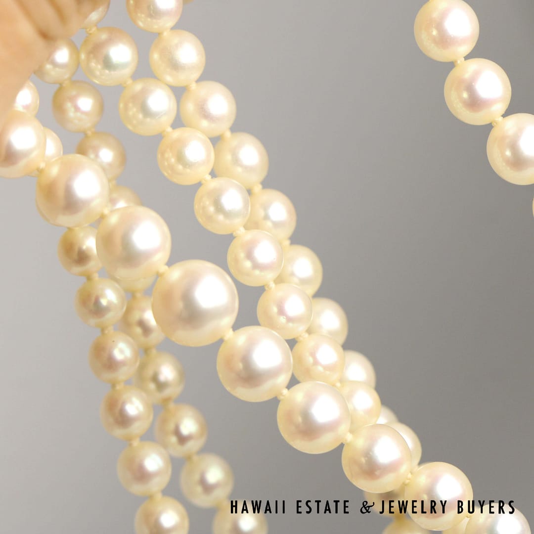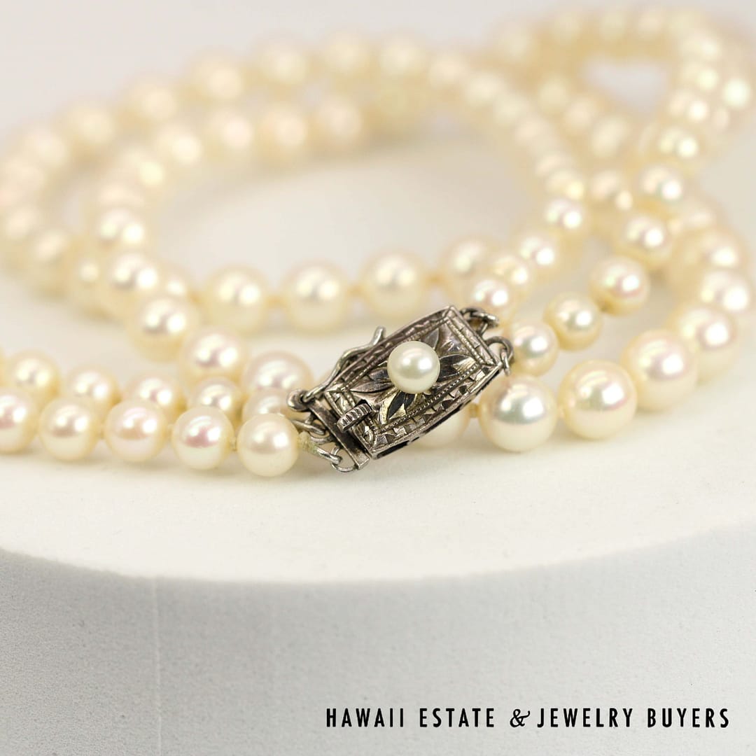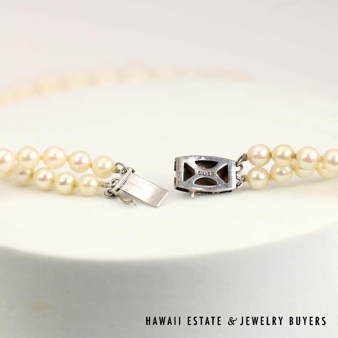DescriptionStunning 17/18 inch necklace featuring knotted graduated double strands of beaded cultured pearls.SILVER KNOTTED GRADUATED DOUBLE STRAND 4.4-7.8mm CULTURED PEARLS 17/18 INCH (123123-05)$800.001 in stockKnotted Graduated Double Strand 4.4-7.8mm Cultured Pearls 17/18 Inch w/Silver Clasp quantityAdd to cartBuy withMake OfferSKU: 123123-05Category: Pre-owned Pearl JewelryRelated Styles22K Yellow Gold Carved & Pierced Green Jade & Pearl Earrings$2,100.00Multi-Strand Pearl 14K Yellow Gold Necklace 22″ & Bracelet Set w/ Beehive Clasps$1,350.006.4g 14KYG 11.3mm PEARL with 0.05ctw DIAMONDS RING SIZE 6$1,600.00MING’S 14KYG 5-5.5mm CULTURED PEARL DOUBLE STRAND NECKLACE WITH CARVED GREEN JADE CLASP 16/17 INCH LENGTH$1,900.00