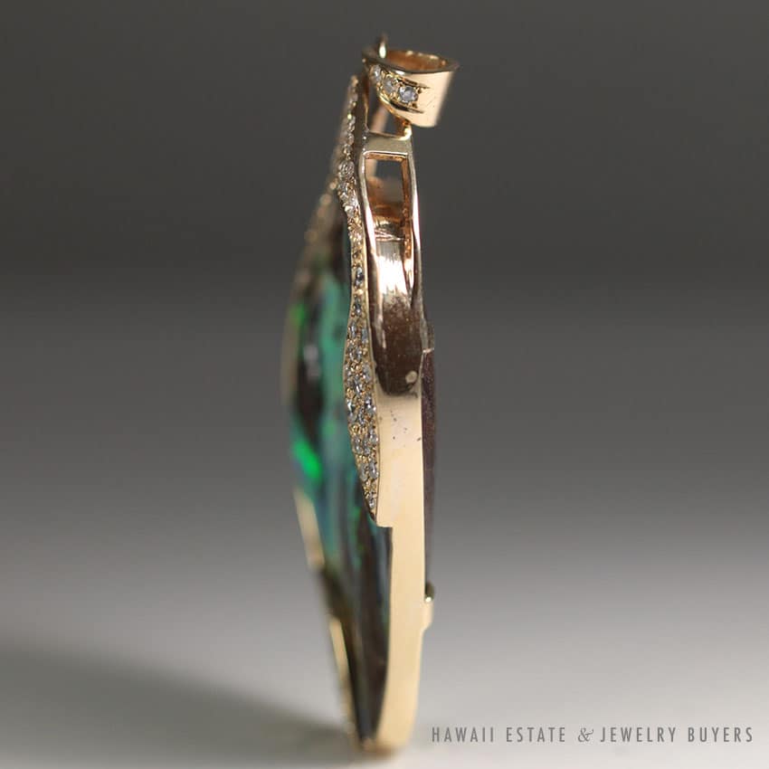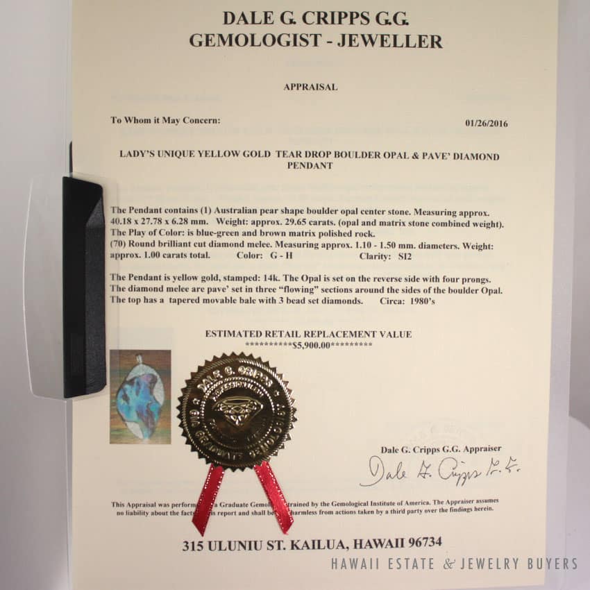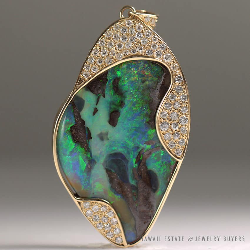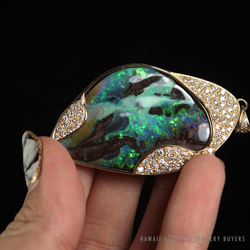 DescriptionMetal: 14K Yellow GoldOpal Weight: approx. 29.65 caratsDiamond Weight: approx. 1.0ctwColor: G – H Clarity: SI2SKU: 1760-03SOLD$6,900.00Out of stockSKU: 1760-03Category: Pre-owned Vintage JewelryRelated StylesNatural Grade A Jade Cabochon Ring$8,500.00Carved Pierced Bamboo Motif Jade 18K Yellow Gold Cufflinks$1,500.00Estate Large 18mm South Sea Pearl Necklace$18,000.00GIA CERTIFIED NATURAL GRADE A LAVENDER JADEITE JADE PENDANT W/ DIAMONDS$5,900.00
