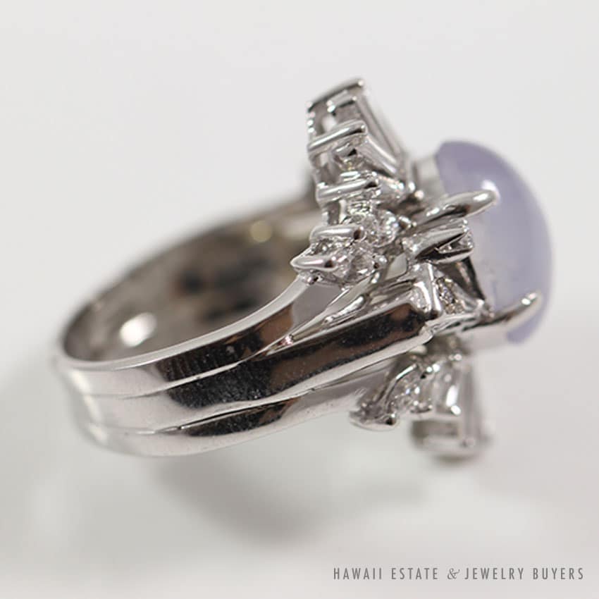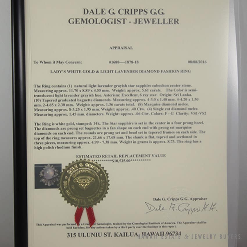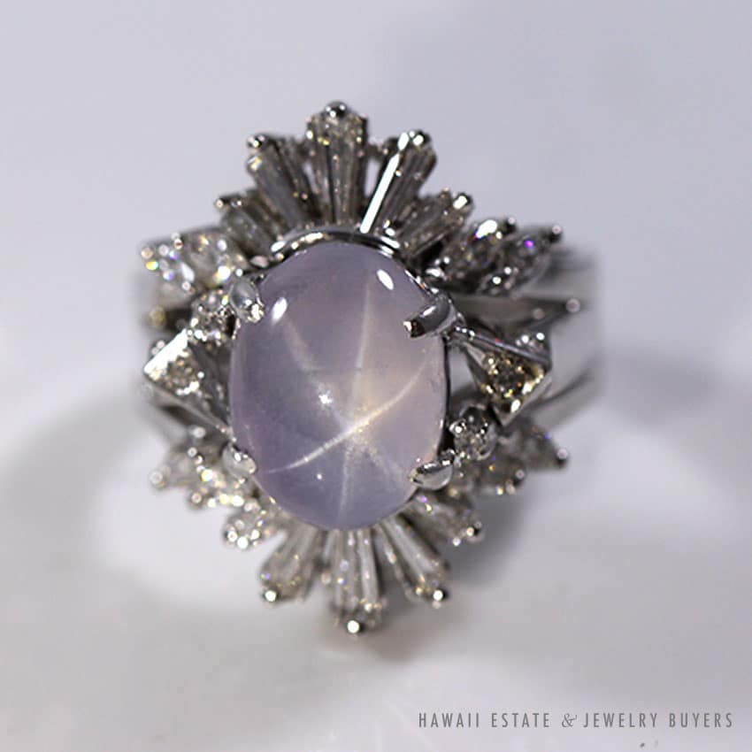 DescriptionNatural light lavender grayish Star Sapphire cabochon approx. 5.61ctDiamonds VS/FG approx. 1.36ctw14KSIZE: 6.25SKU: 1878-18ARCHIVED – EBAY CLEAN UP – 11/23 PER MOSHE SOLD OUT OF STATE$5,600.00Out of stockSKU: 1878-18Category: Pre-owned Vintage JewelryTags: estate jewelry, lavender, LAVENDER SAPPHIRE, sapphire, star sapphireRelated StylesThick Certified Grade A Natural Jade Hinged Bangle$4,250.00Certified Twisted White Nephrite Jade Bangle$6,000.00Estate Large 18mm South Sea Pearl Necklace$18,000.00GIA CERTIFIED NATURAL GRADE A LAVENDER JADEITE JADE PENDANT W/ DIAMONDS$5,900.00