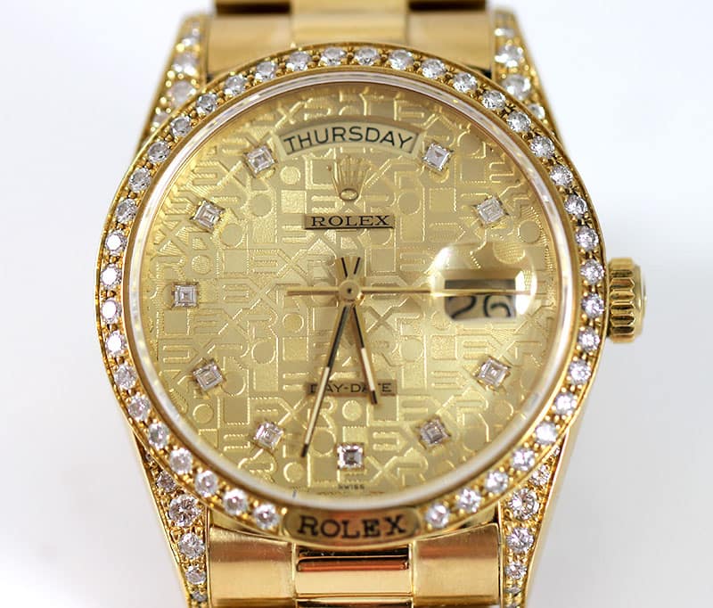 Rolex Day Date Super President Crown Collection Year: 1987 Model: 18138 The piece has a diamond logs and bezel all factory made with a diamond anniversary dial. The watch comes with the full 6 extra links and has a hidden clasp.