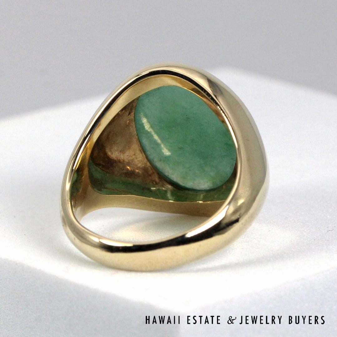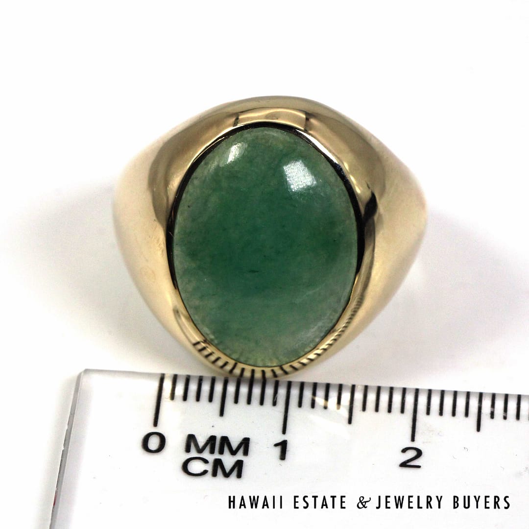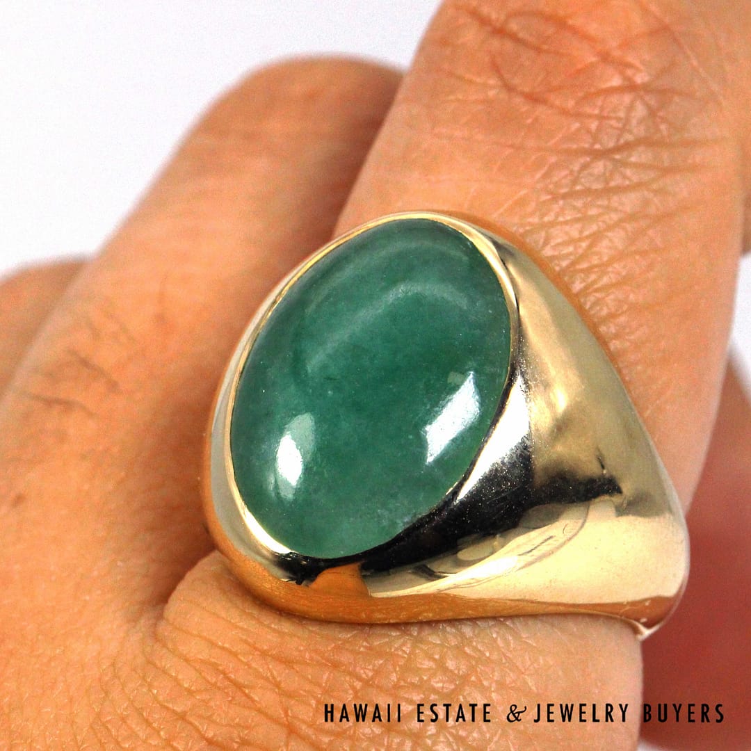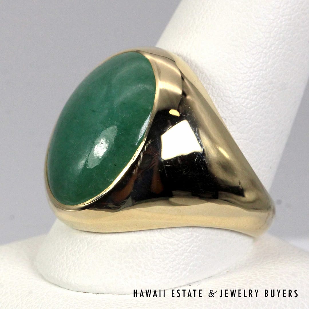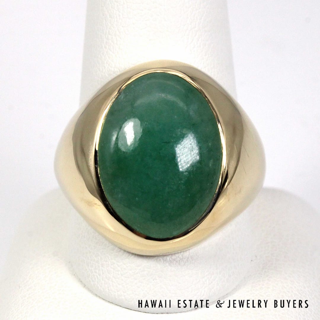 DescriptionMen's ring crafted in 14K yellow gold, featuring a bold green jade cabochon in a sleek, substantial setting, size 10.75.17.3g 14KYG MEN'S JADE RING SIZE 10.75 (3138-04)$2,800.001 in stockMen's Jade Ring 14K Yellow Gold Size 10.75 quantityAdd to cartBuy withMake OfferSKU: 3138-04Category: Pre-owned Jade JewelryRelated StylesGIA 4.2g 14KWG 13x10MM OVAL GREEN CABOCHON JADE 0.50ctw DIAMOND RING SIZE 5$3,100.00GIA 68.2g 14KYG MOTTLED GREEN & LIGHT PURPLISH GRAY TYPE A HINGED BANGLE BRACELET SIZE 7.5$8,000.00GIA 80g 14KYG MOTTLED ORANGY BROWN JADE HINGED BANGLE BRACELET SIZE 8$6,000.00GIA 67.2g 14KYG TRANSLUCENT MOTTLED GRAYISH GREEN JADE HINGED BANGLE BRACELET$9,500.00