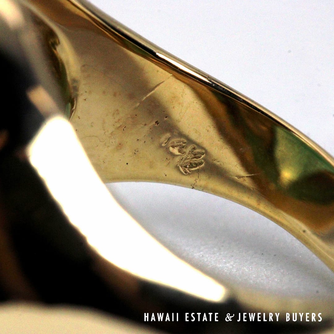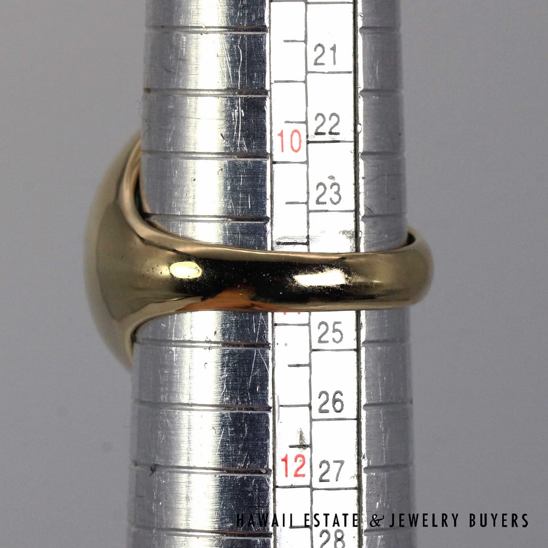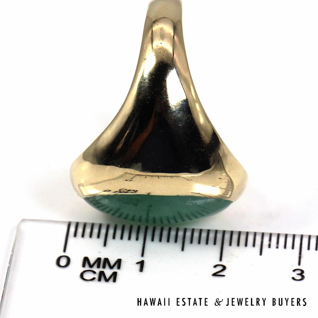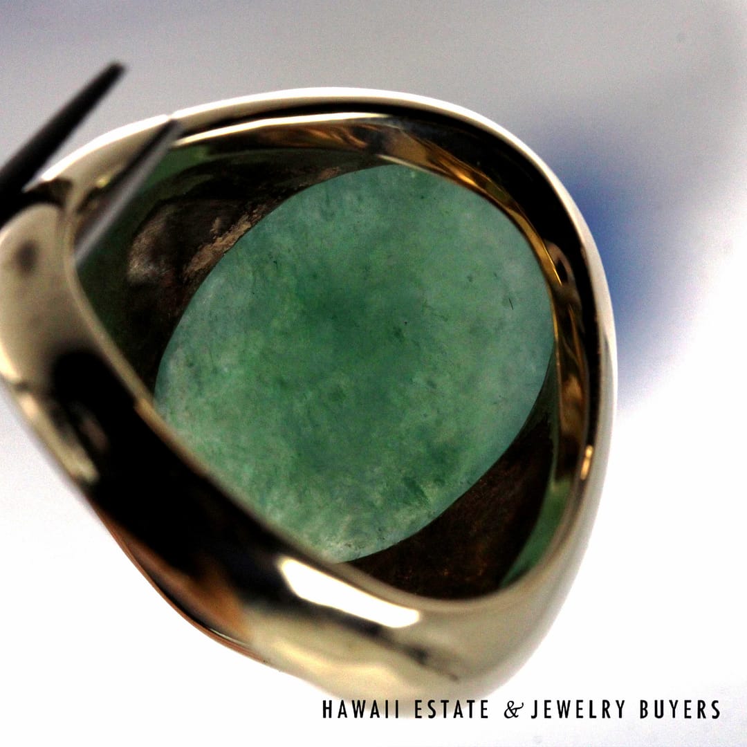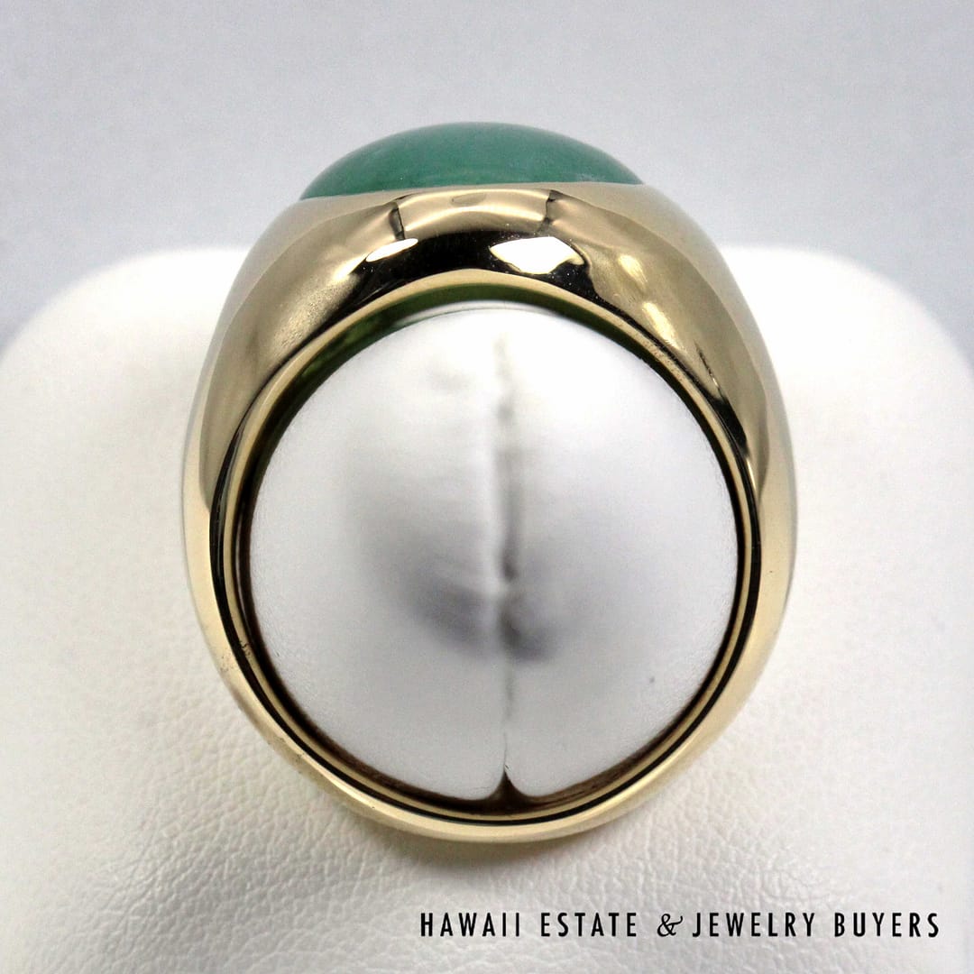 DescriptionMen's ring crafted in 14K yellow gold, featuring a bold green jade cabochon in a sleek, substantial setting, size 10.75.17.3g 14KYG MEN'S JADE RING SIZE 10.75 (3138-04)$2,800.001 in stockMen's Jade Ring 14K Yellow Gold Size 10.75 quantityAdd to cartBuy withMake OfferSKU: 3138-04Category: Pre-owned Jade JewelryRelated StylesGIA 4.2g 14KWG 13x10MM OVAL GREEN CABOCHON JADE 0.50ctw DIAMOND RING SIZE 5$3,100.00GIA 68.2g 14KYG MOTTLED GREEN & LIGHT PURPLISH GRAY TYPE A HINGED BANGLE BRACELET SIZE 7.5$8,000.00GIA 80g 14KYG MOTTLED ORANGY BROWN JADE HINGED BANGLE BRACELET SIZE 8$6,000.00GIA 67.2g 14KYG TRANSLUCENT MOTTLED GRAYISH GREEN JADE HINGED BANGLE BRACELET$9,500.00