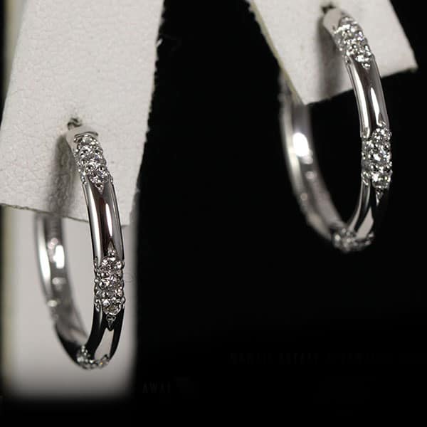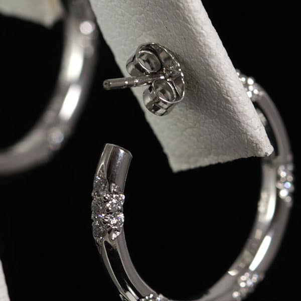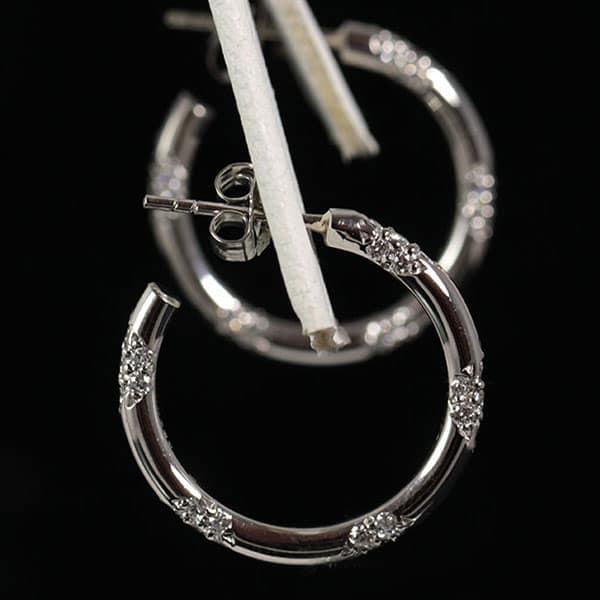 The hoops are micro-bead set with 5 sections of seven diamonds each. Width: approx. 2.45mm. x 21.15mm. diameters each.