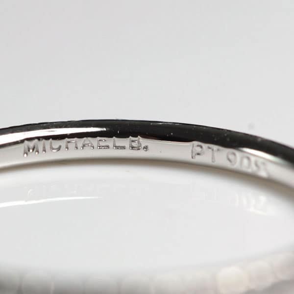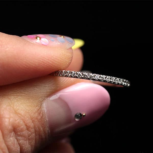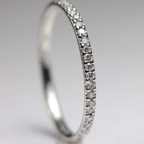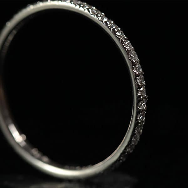 The band contains (47) round brilliant diamond melee. aprox.1.30mm. Each. Weight: approx..47 carats total. Color: F Clarity: VS1. The diamonds are all bead set with four “shared” prongs, all the way around the ring. Width: approx. 1.50mm.