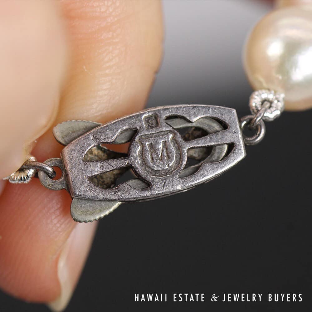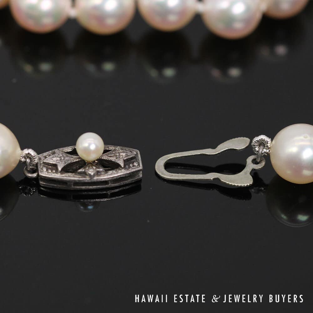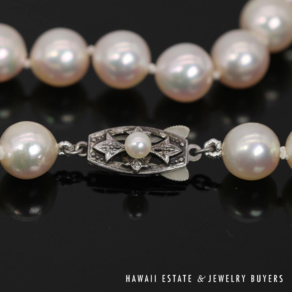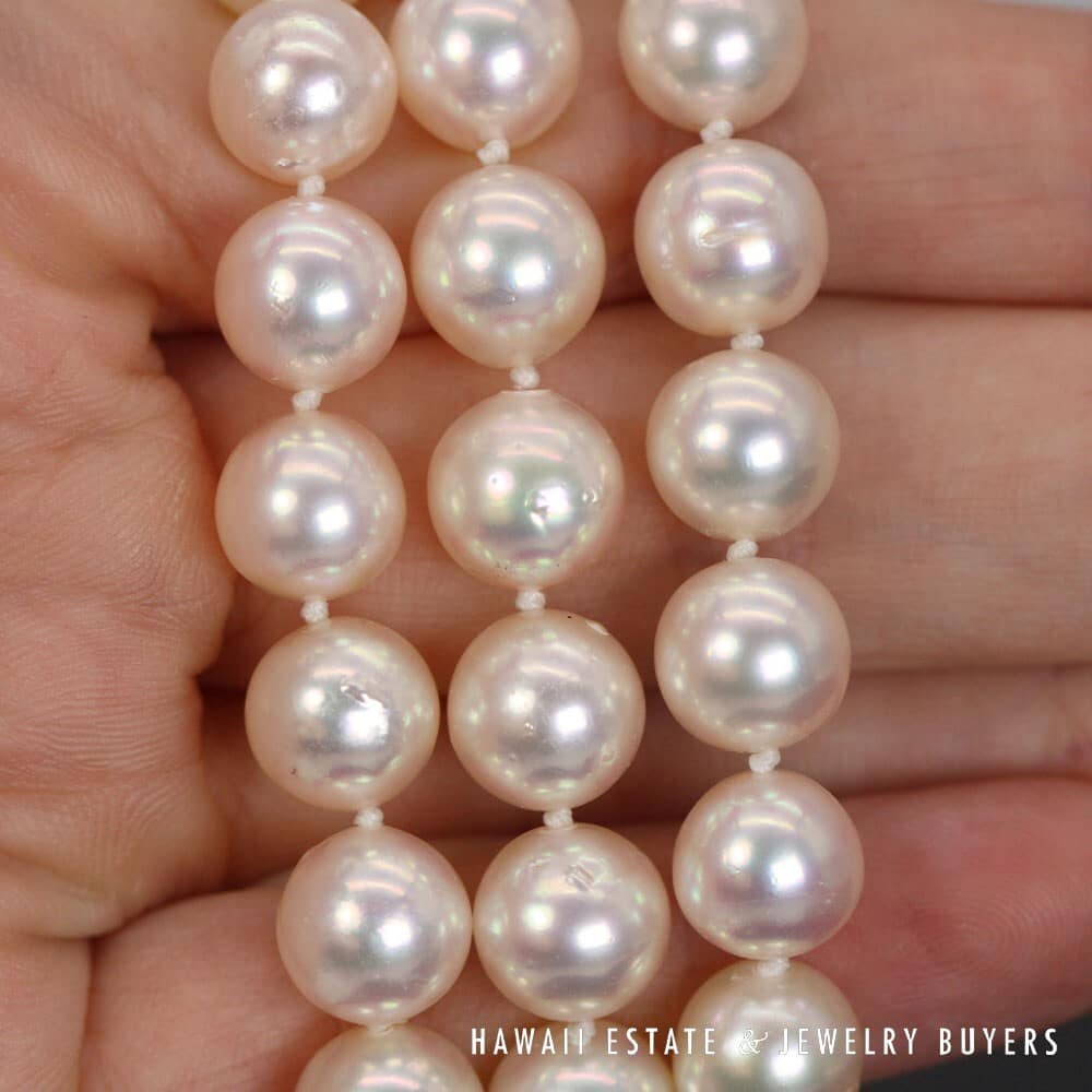 The pearls measure approximately 8.5 – 9mm in diameter, with the exception of the 4mm pearl used to adorn the Silver hook-closure clasp. The pearls have a well-matched white body color with rose overtone, moderate blemish, very good luster and a thick even nacre.