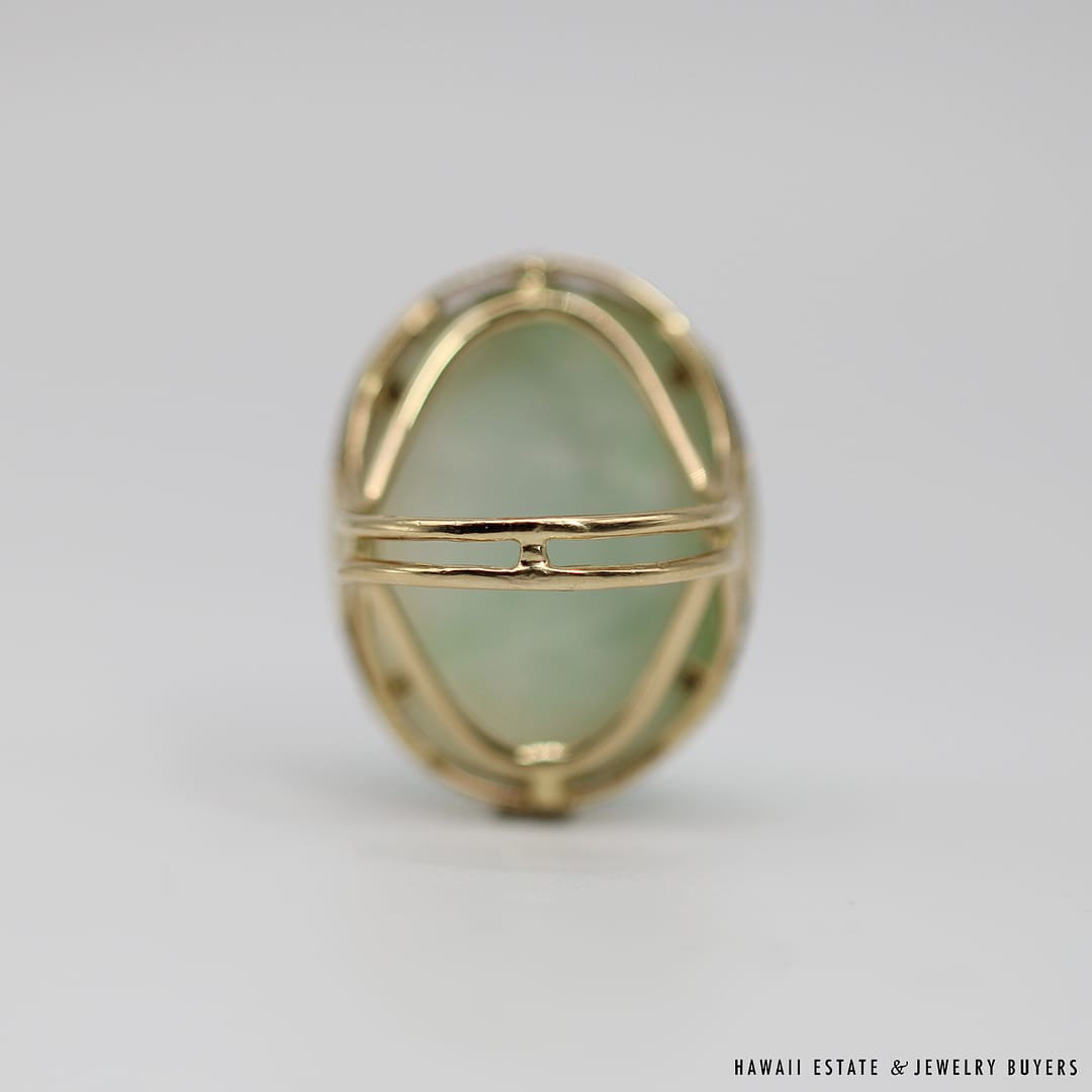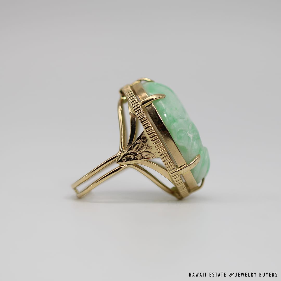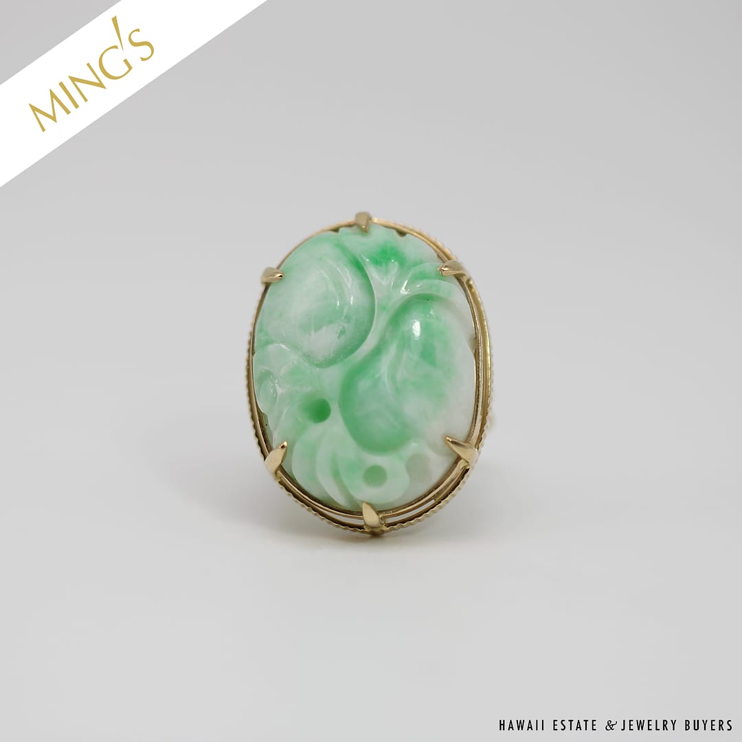 DescriptionMING’S HAWAII14KYG WHITE & GREEN JADE CARVED GOURD RINGSIZE 8WEIGHT: 14.5gJADE STONE MEASURES 26x20mmSTAMPED 14KYG MING’S$3,625.001 in stockMING'S 14.5g 14KYG WHITE & GREEN JADE CARVED GOURD RING SIZE 8 quantityAdd to cartBuy withMake OfferSKU: SU091820-02Categories: Pre-owned Ming's Jewelry, Pre-owned Vintage & Jade JewelryTags: 14k jade ring, 14k ring, carved jade, jade ring, ming's hawaii, ming's jadeRelated StylesGIA CERTIFIED NATURAL GRADE A LAVENDER JADEITE JADE PENDANT W/ DIAMONDS$5,900.00GIA CERTIFIED MARQUISE NATURAL JADE APPLE GREEN COLOR JADE RING GIA JADE SZ 5.25$1,000.00Antique Victorian Pearl Old Mine Cut Diamond Circle Pin$2,100.0022.8g 18KWG TYPE A IMPERIAL JADE BUDDAH HAND CARVING w/2.50ctw DIAMOND PENDANT MEASURES 58x28mm (1395-01)$13,900.00