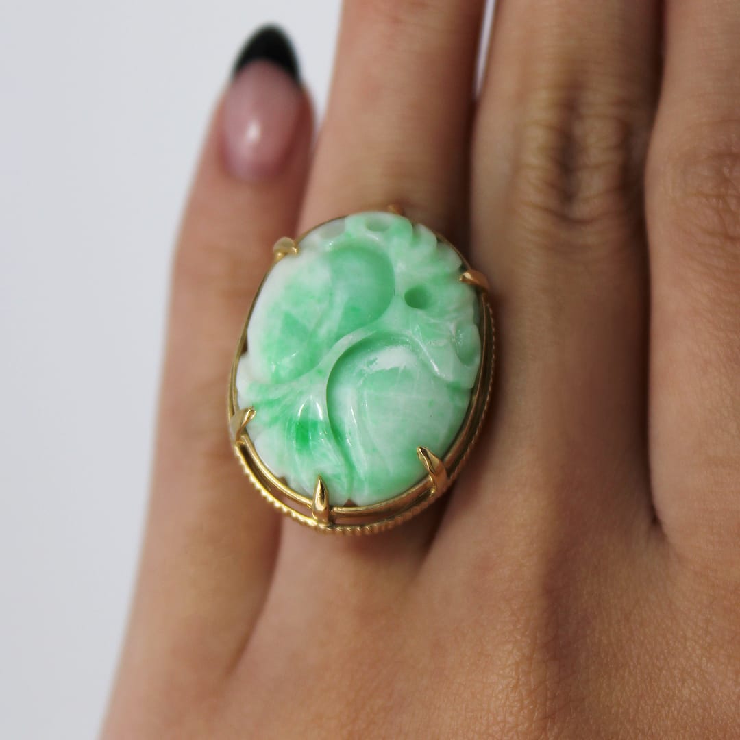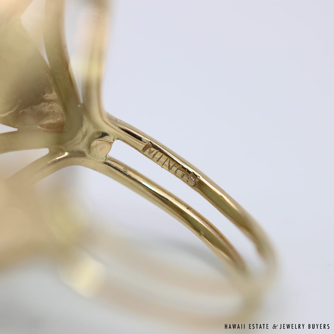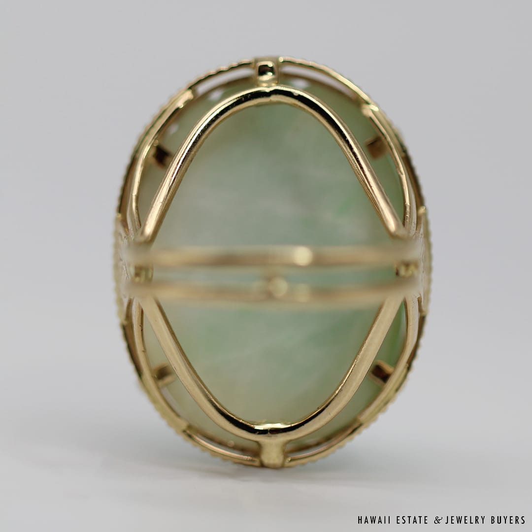 DescriptionMING’S HAWAII14KYG WHITE & GREEN JADE CARVED GOURD RINGSIZE 8WEIGHT: 14.5gJADE STONE MEASURES 26x20mmSTAMPED 14KYG MING’S$3,625.001 in stockMING'S 14.5g 14KYG WHITE & GREEN JADE CARVED GOURD RING SIZE 8 quantityAdd to cartBuy withMake OfferSKU: SU091820-02Categories: Pre-owned Ming's Jewelry, Pre-owned Vintage & Jade JewelryTags: 14k jade ring, 14k ring, carved jade, jade ring, ming's hawaii, ming's jadeRelated StylesGIA CERTIFIED NATURAL GRADE A LAVENDER JADEITE JADE PENDANT W/ DIAMONDS$5,900.00GIA CERTIFIED MARQUISE NATURAL JADE APPLE GREEN COLOR JADE RING GIA JADE SZ 5.25$1,000.00Antique Victorian Pearl Old Mine Cut Diamond Circle Pin$2,100.0022.8g 18KWG TYPE A IMPERIAL JADE BUDDAH HAND CARVING w/2.50ctw DIAMOND PENDANT MEASURES 58x28mm (1395-01)$13,900.00