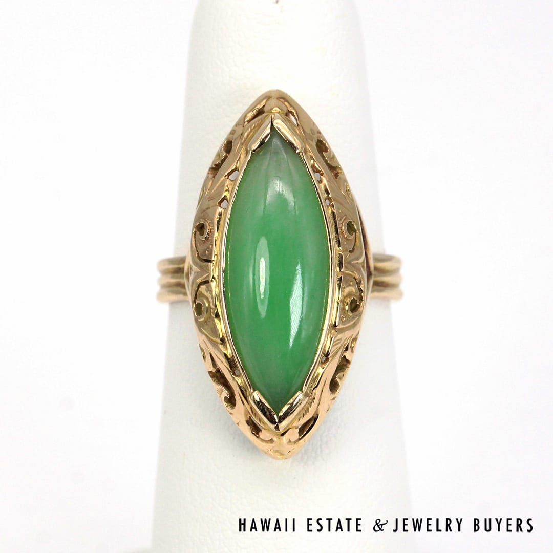 Vintage Ming's Hawaii ring crafted in 14K yellow gold, featuring a vibrant apple green marquise-cut jade stone in an elegant, timeless design.