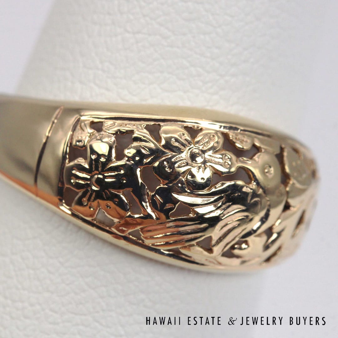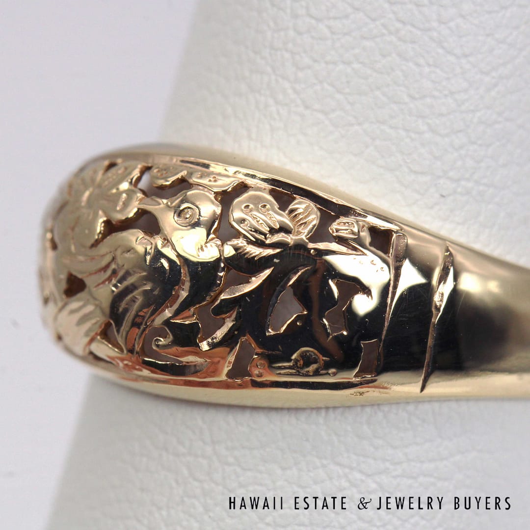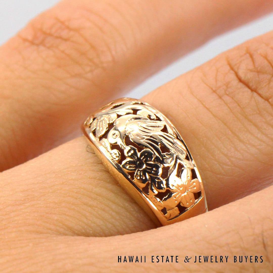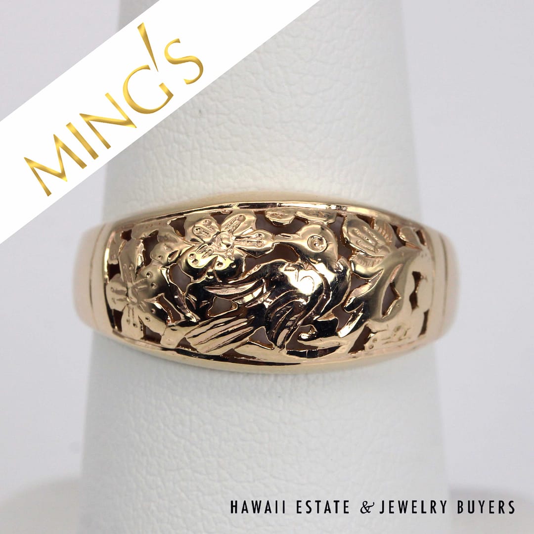 Vintage Ming's Hawaii 14K yellow gold ring featuring intricate hand- engraved floral and bird motifs, showcasing exquisite Hawaiian craftsmanship and timeless island elegance.