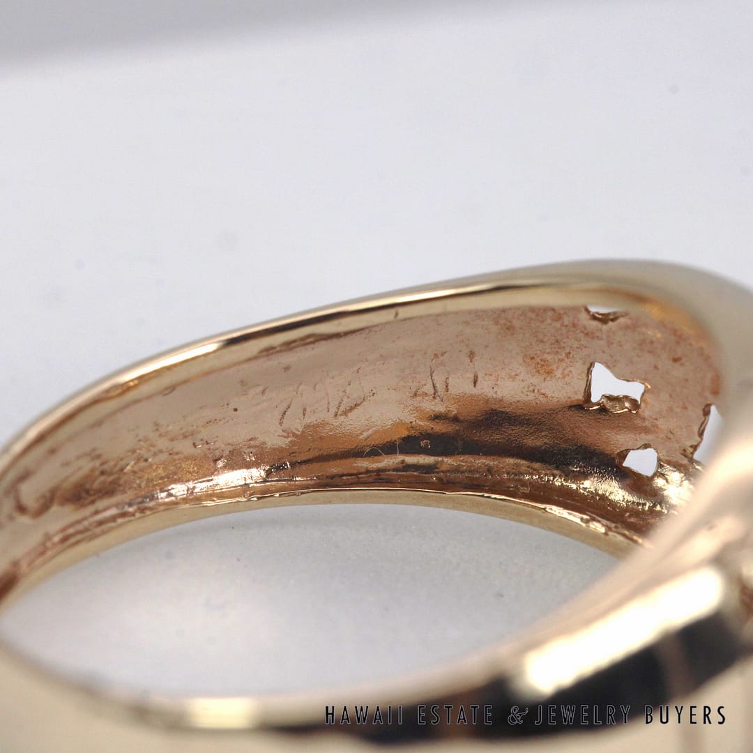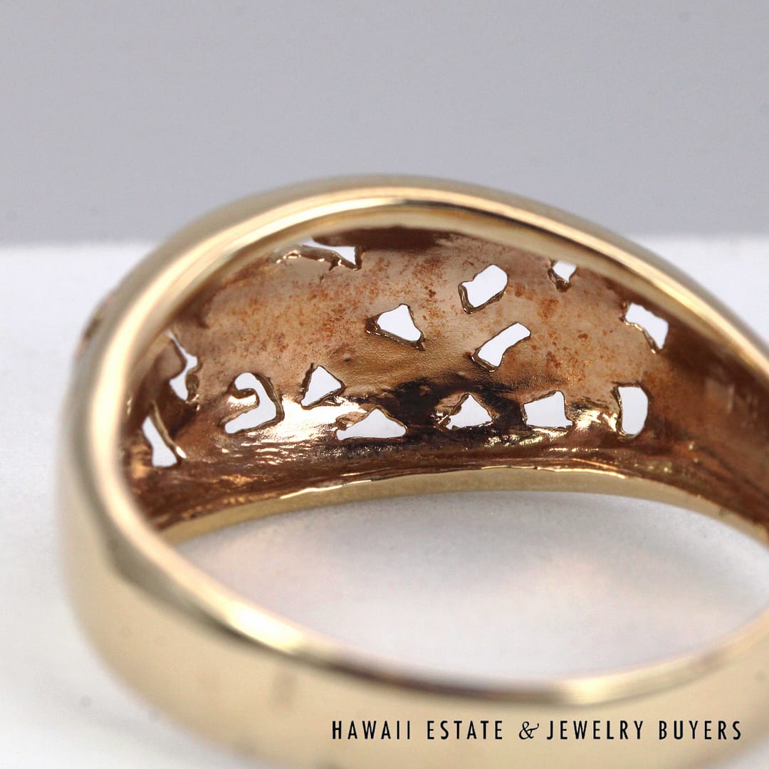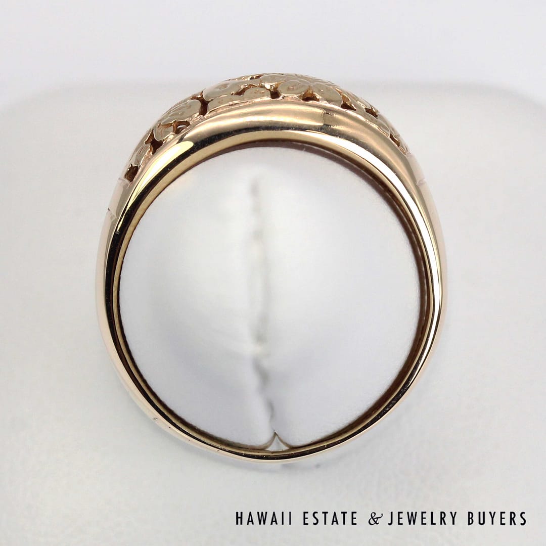 Vintage Ming's Hawaii 14K yellow gold ring featuring intricate hand- engraved floral and bird motifs, showcasing exquisite Hawaiian craftsmanship and timeless island elegance.