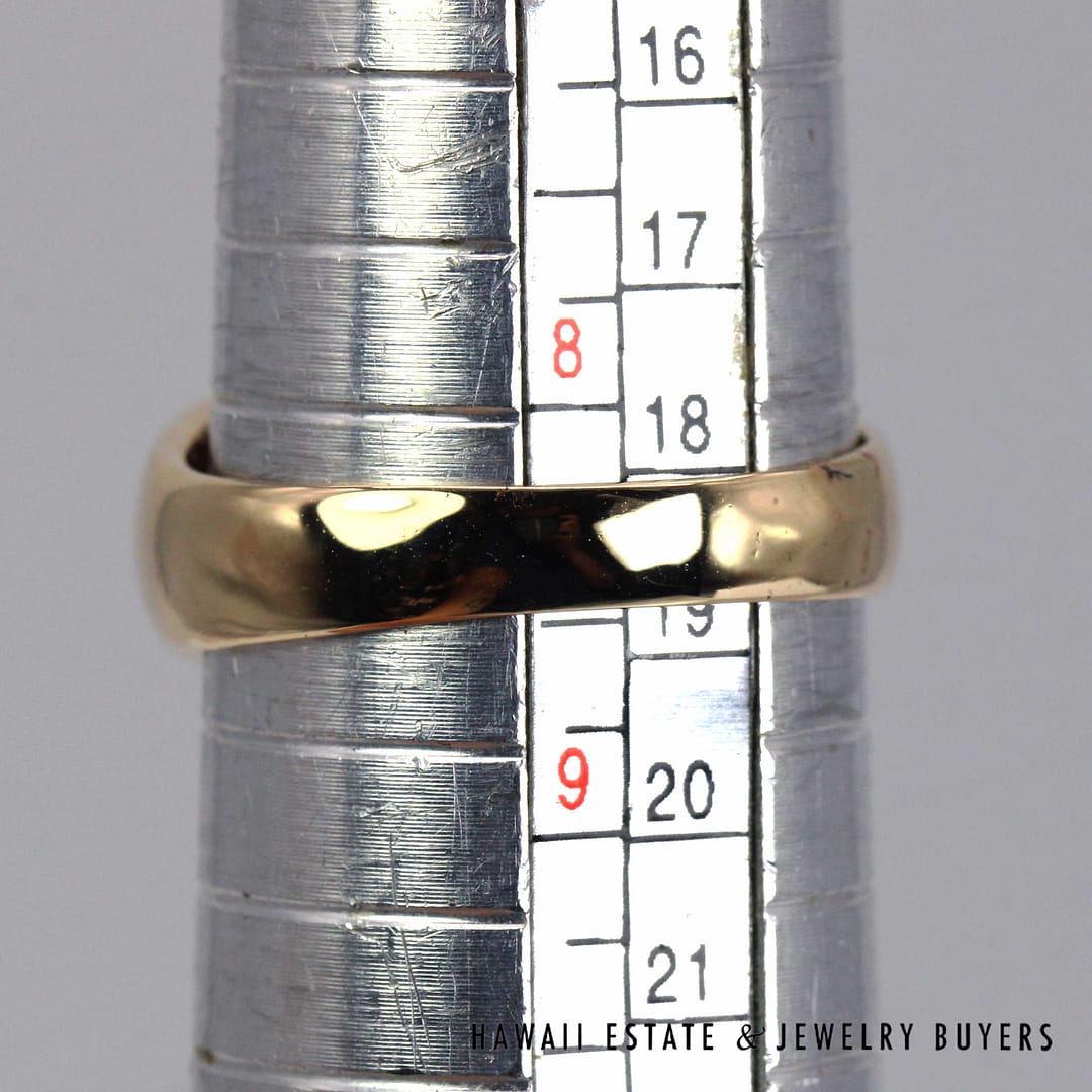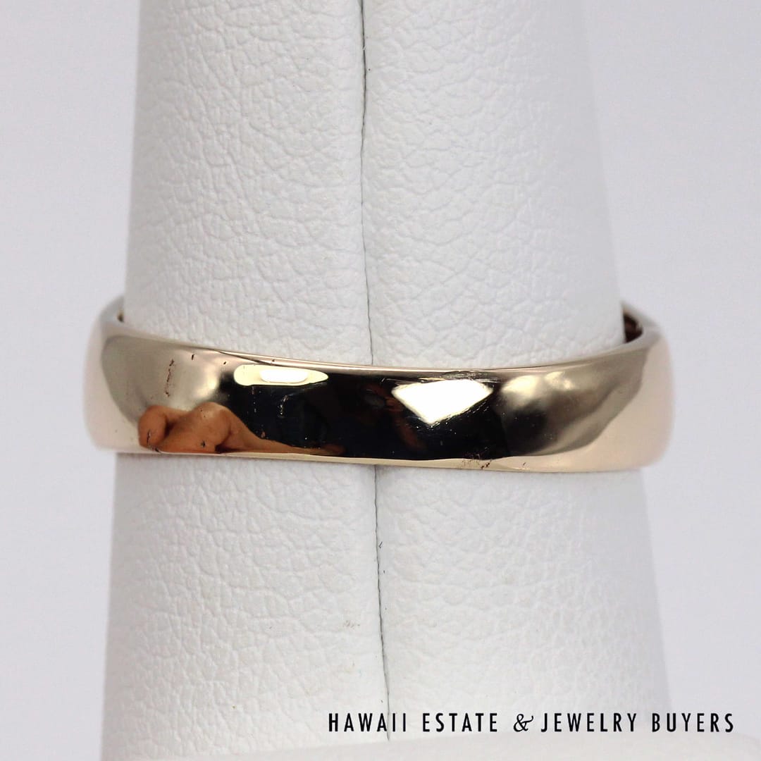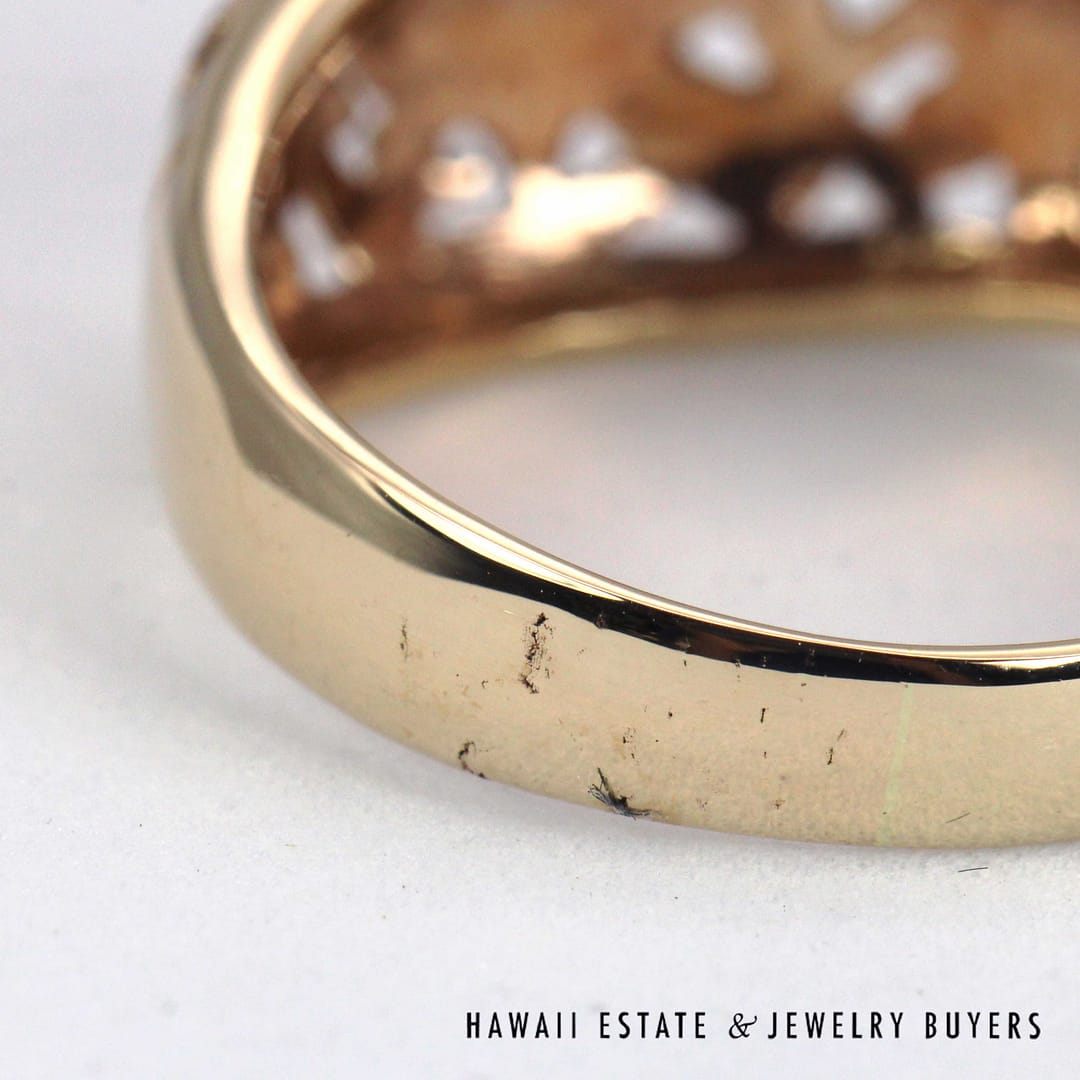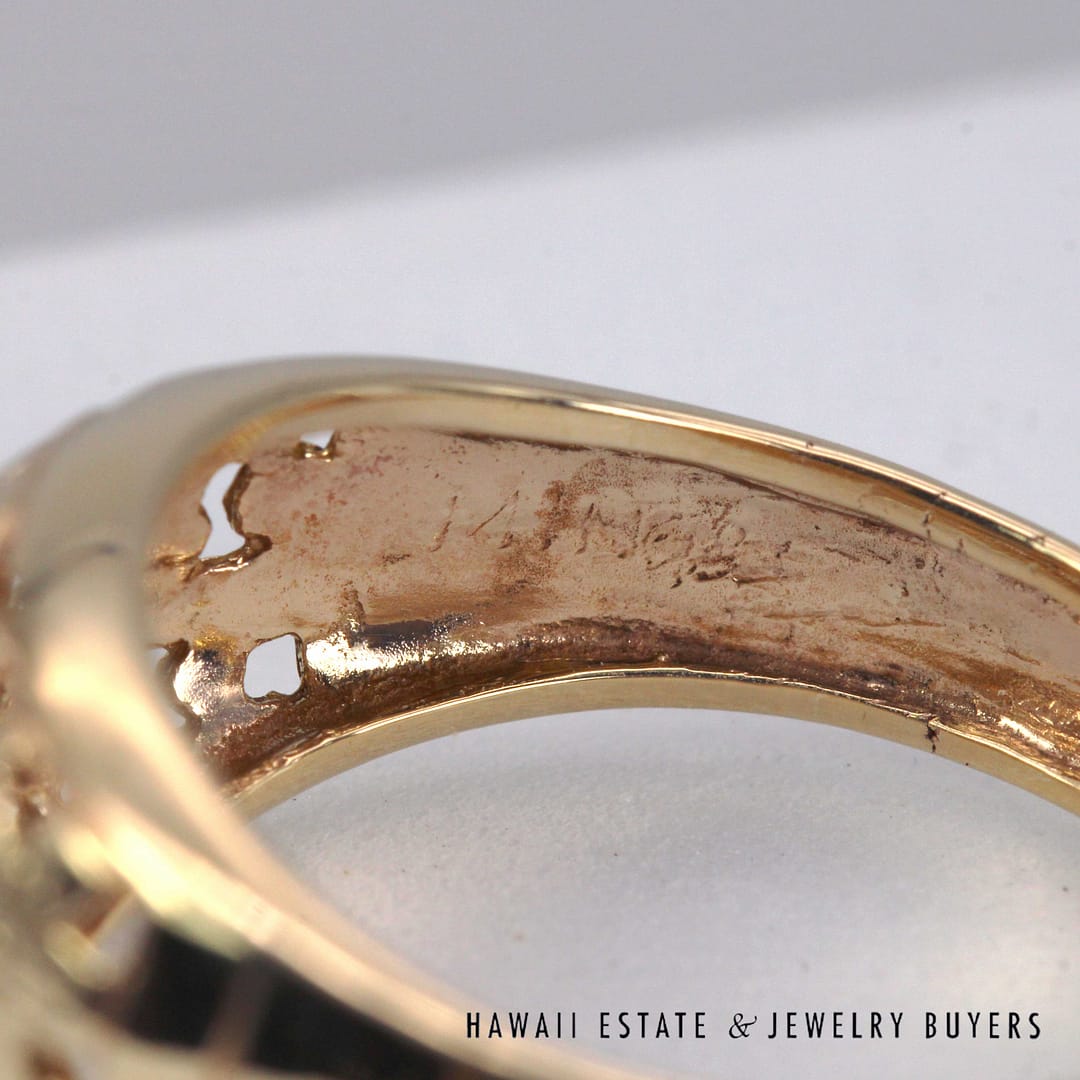 Vintage Ming's Hawaii 14K yellow gold ring featuring intricate hand- engraved floral and bird motifs, showcasing exquisite Hawaiian craftsmanship and timeless island elegance.