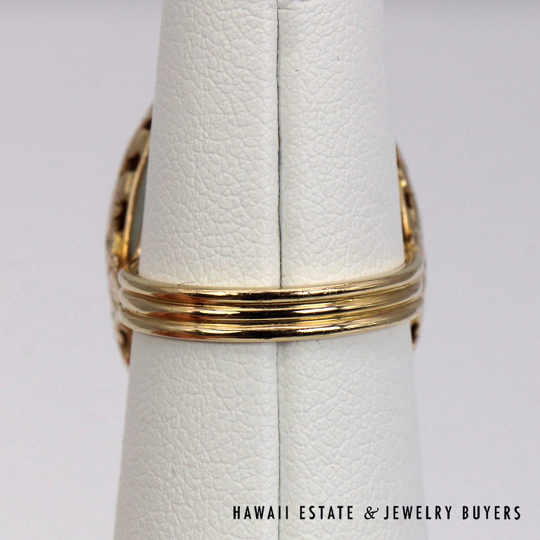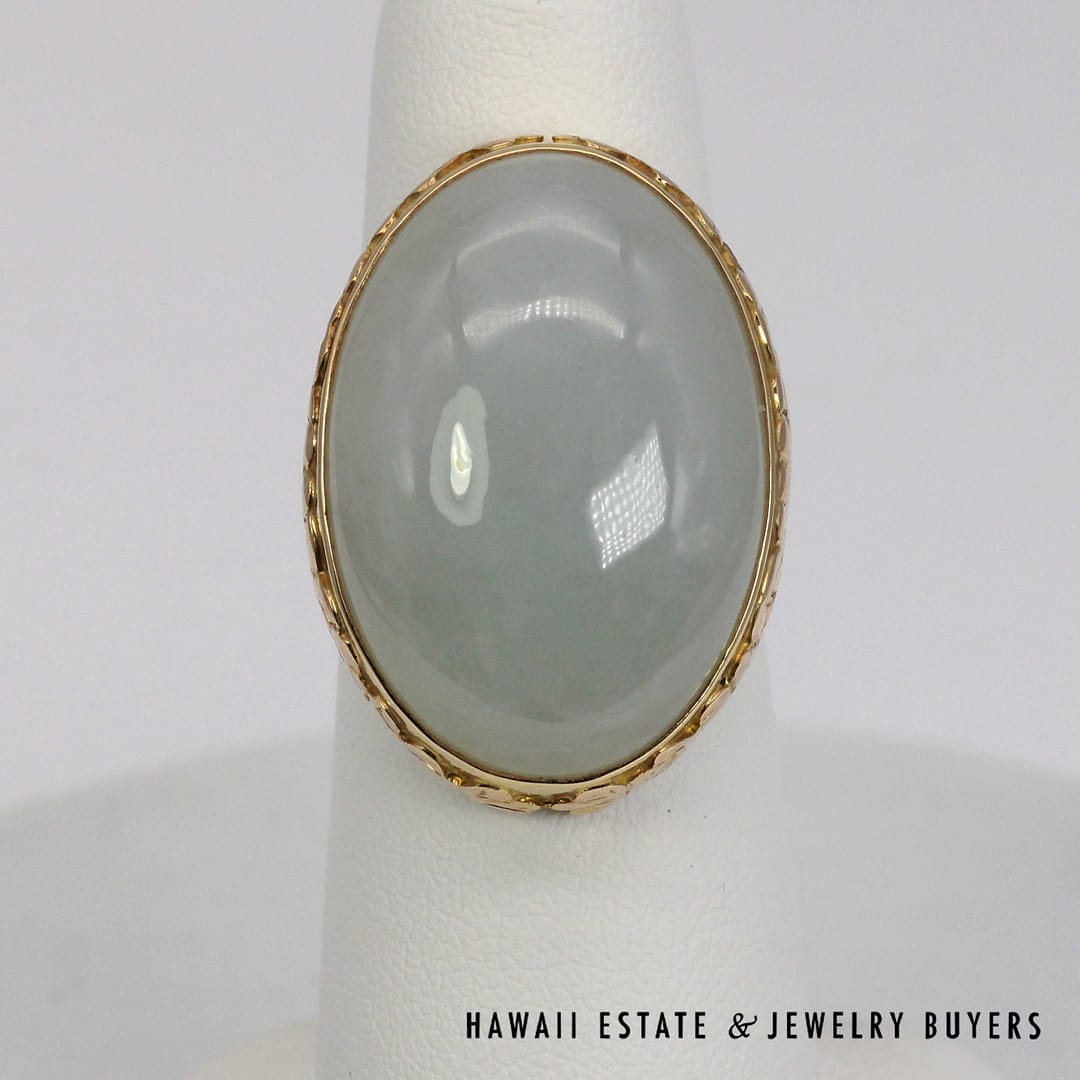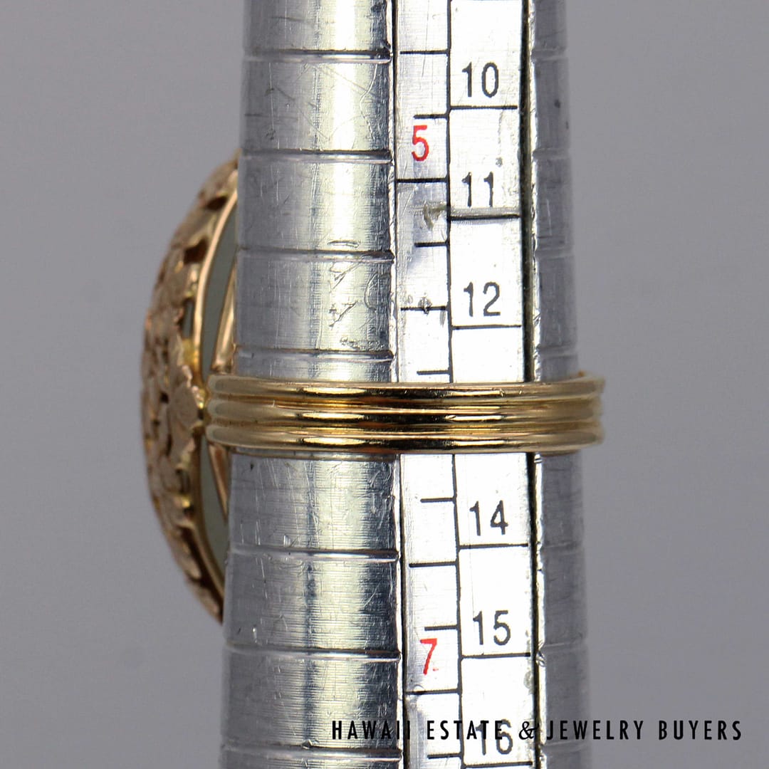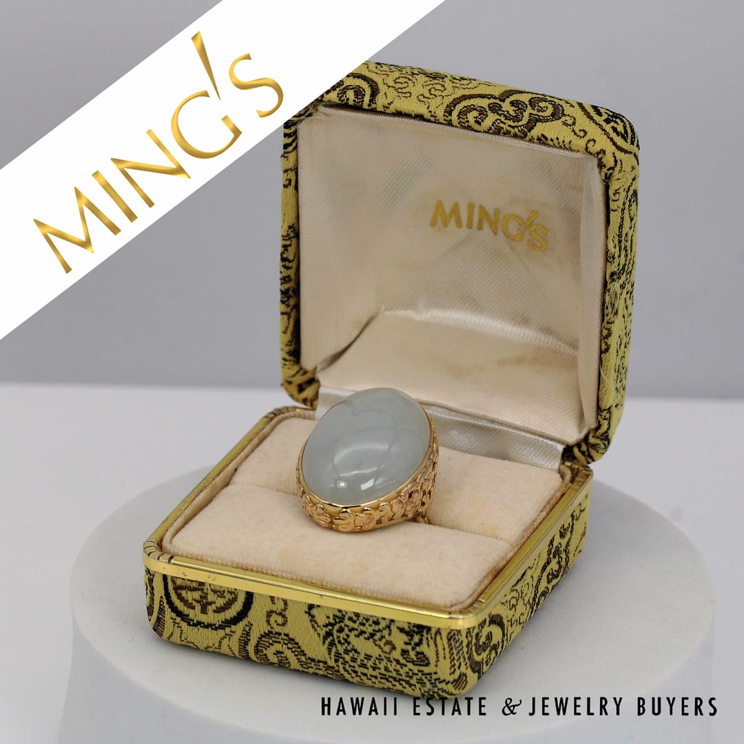 DescriptionVintage Ming's Hawaii 14K yellow gold ring featuring a smooth pale grey jade cabochon, showcasing elegant simplicity and refined island craftsmanship.MING'S 13.4g 14KYG PALE GREY JADE RING SIZE 6 WITH BOX (3122-03)$2,450.001 in stockMing's 14K Yellow Gold Pale Grey Jade Ring Size 6 With Box quantityAdd to cartMake OfferSKU: 3122-03Categories: Pre-owned Jade Jewelry, Pre-owned Ming's JewelryRelated StylesMing’s Multi Color Jade & Pearl Grid Ring$1,425.00Ming’s Hawaii Twin Jade Ball Pearl Ring$1,300.00Ming’s Hawaii Twin Jade Ball Pearl Ring$1,975.00Ming’s Hawaii Oval Carved Flower Large Jade 14K Yellow Gold Ring$1,800.00