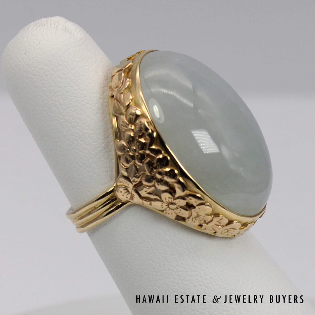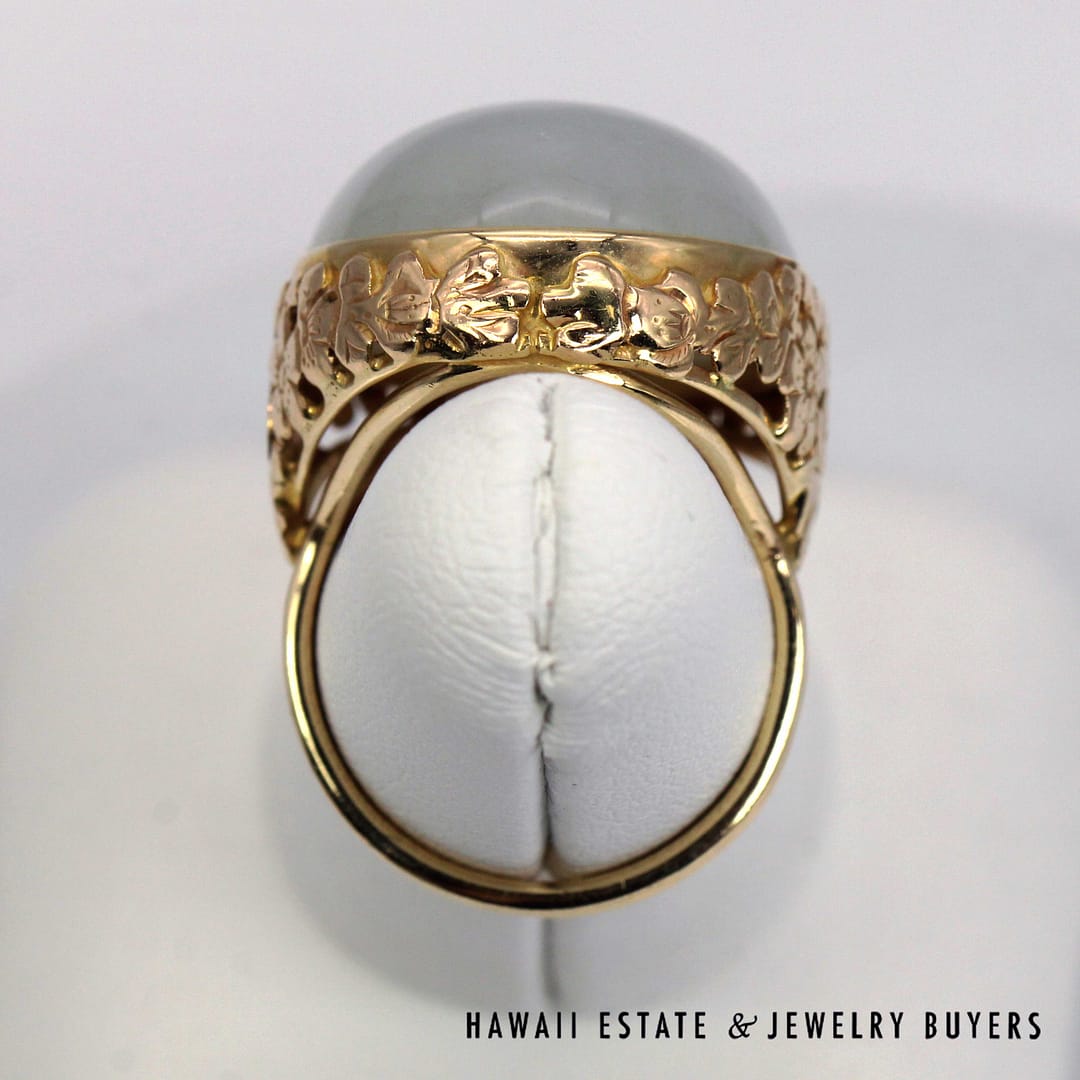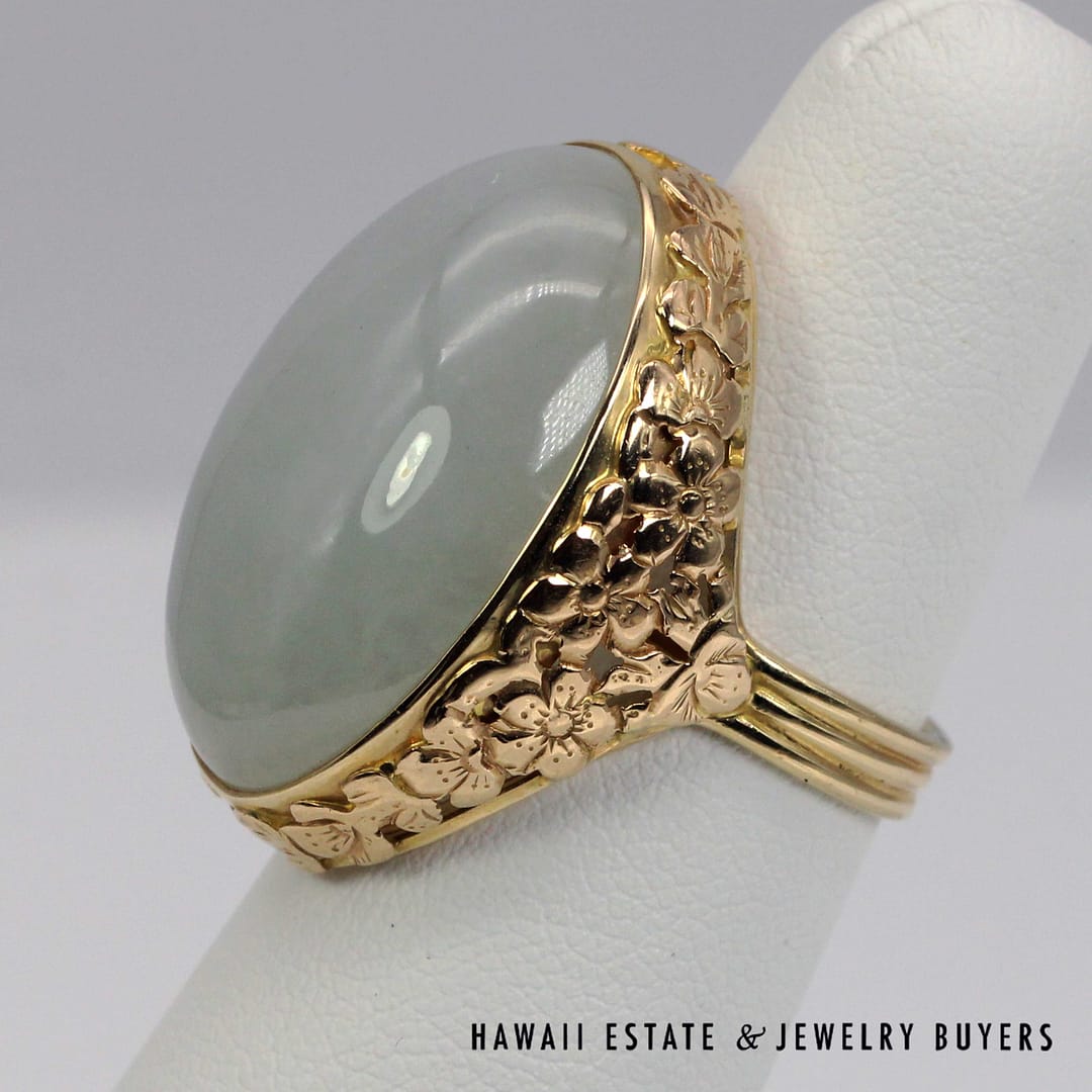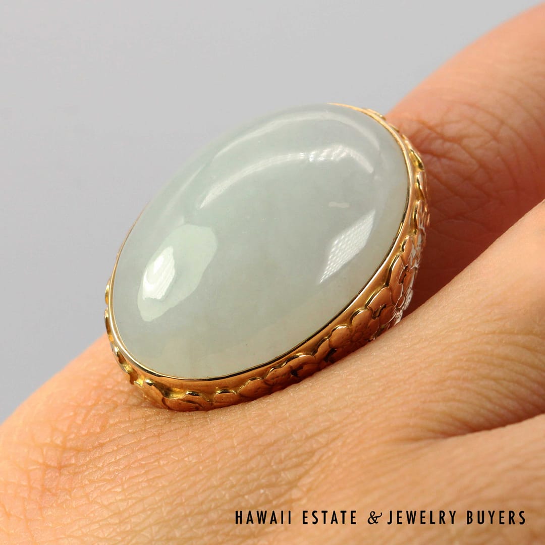 DescriptionVintage Ming's Hawaii 14K yellow gold ring featuring a smooth pale grey jade cabochon, showcasing elegant simplicity and refined island craftsmanship.MING'S 13.4g 14KYG PALE GREY JADE RING SIZE 6 WITH BOX (3122-03)$2,450.001 in stockMing's 14K Yellow Gold Pale Grey Jade Ring Size 6 With Box quantityAdd to cartMake OfferSKU: 3122-03Categories: Pre-owned Jade Jewelry, Pre-owned Ming's JewelryRelated StylesMing’s Multi Color Jade & Pearl Grid Ring$1,425.00Ming’s Hawaii Twin Jade Ball Pearl Ring$1,300.00Ming’s Hawaii Twin Jade Ball Pearl Ring$1,975.00Ming’s Hawaii Oval Carved Flower Large Jade 14K Yellow Gold Ring$1,800.00