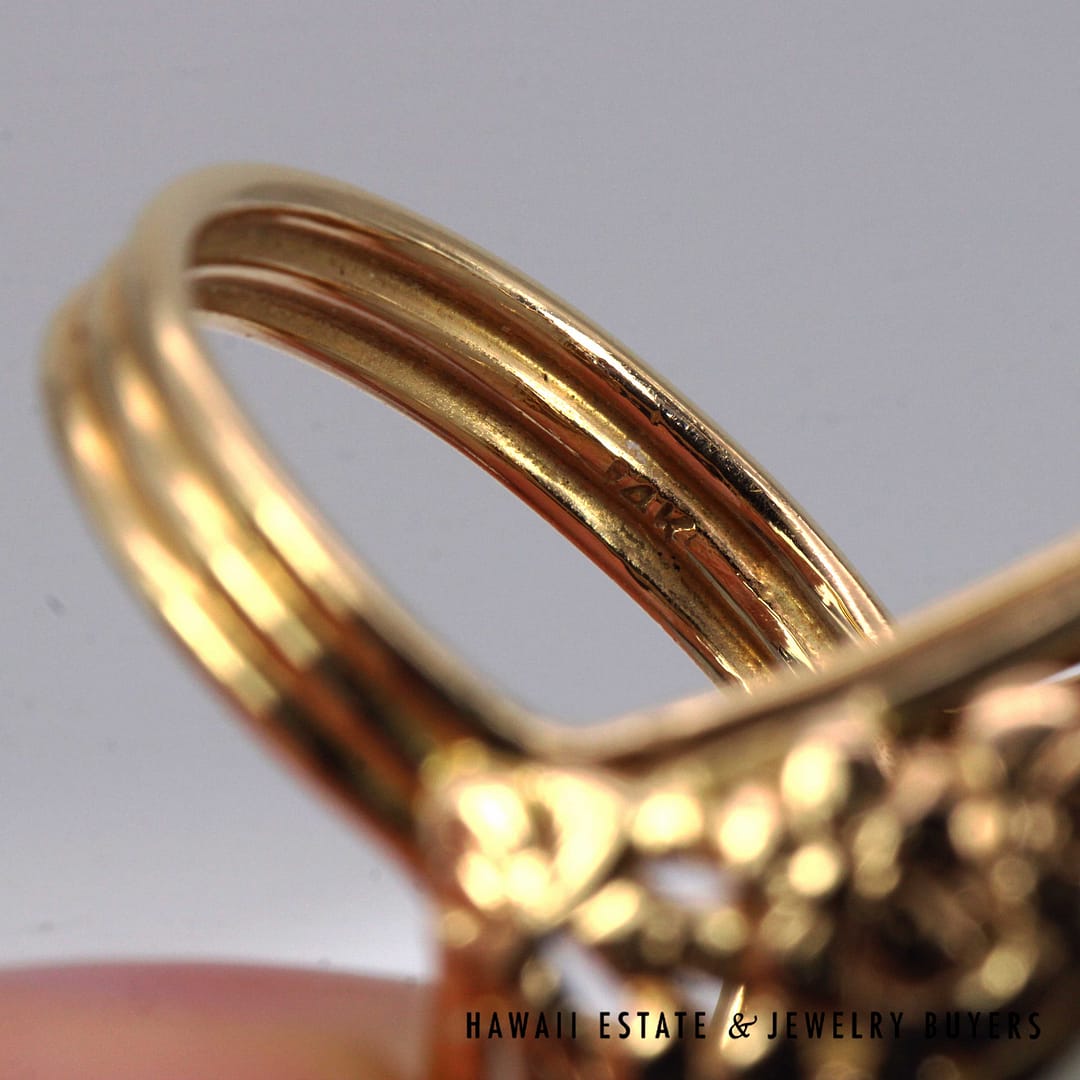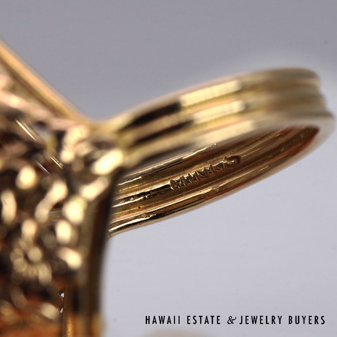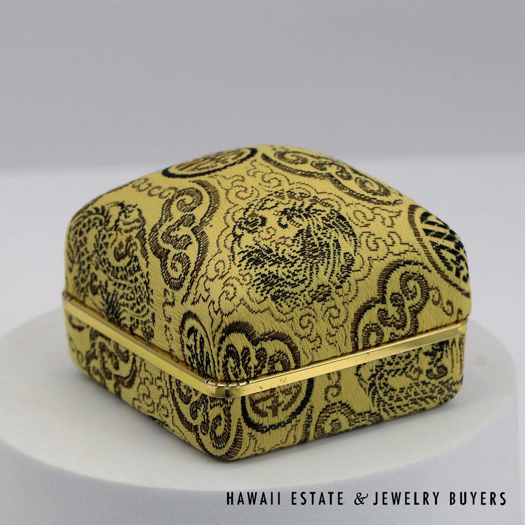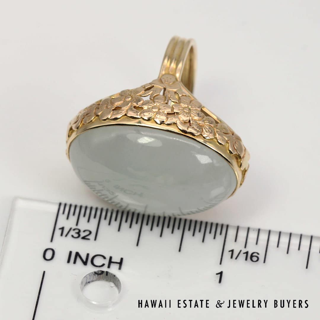 DescriptionVintage Ming's Hawaii 14K yellow gold ring featuring a smooth pale grey jade cabochon, showcasing elegant simplicity and refined island craftsmanship.MING'S 13.4g 14KYG PALE GREY JADE RING SIZE 6 WITH BOX (3122-03)$2,450.001 in stockMing's 14K Yellow Gold Pale Grey Jade Ring Size 6 With Box quantityAdd to cartMake OfferSKU: 3122-03Categories: Pre-owned Jade Jewelry, Pre-owned Ming's JewelryRelated StylesMing’s Multi Color Jade & Pearl Grid Ring$1,425.00Ming’s Hawaii Twin Jade Ball Pearl Ring$1,300.00Ming’s Hawaii Twin Jade Ball Pearl Ring$1,975.00Ming’s Hawaii Oval Carved Flower Large Jade 14K Yellow Gold Ring$1,800.00