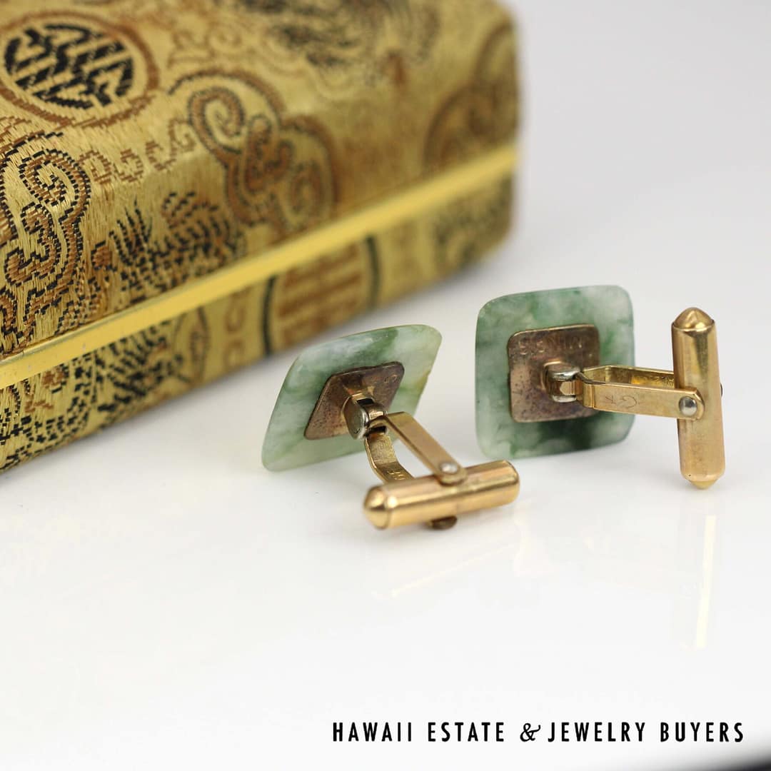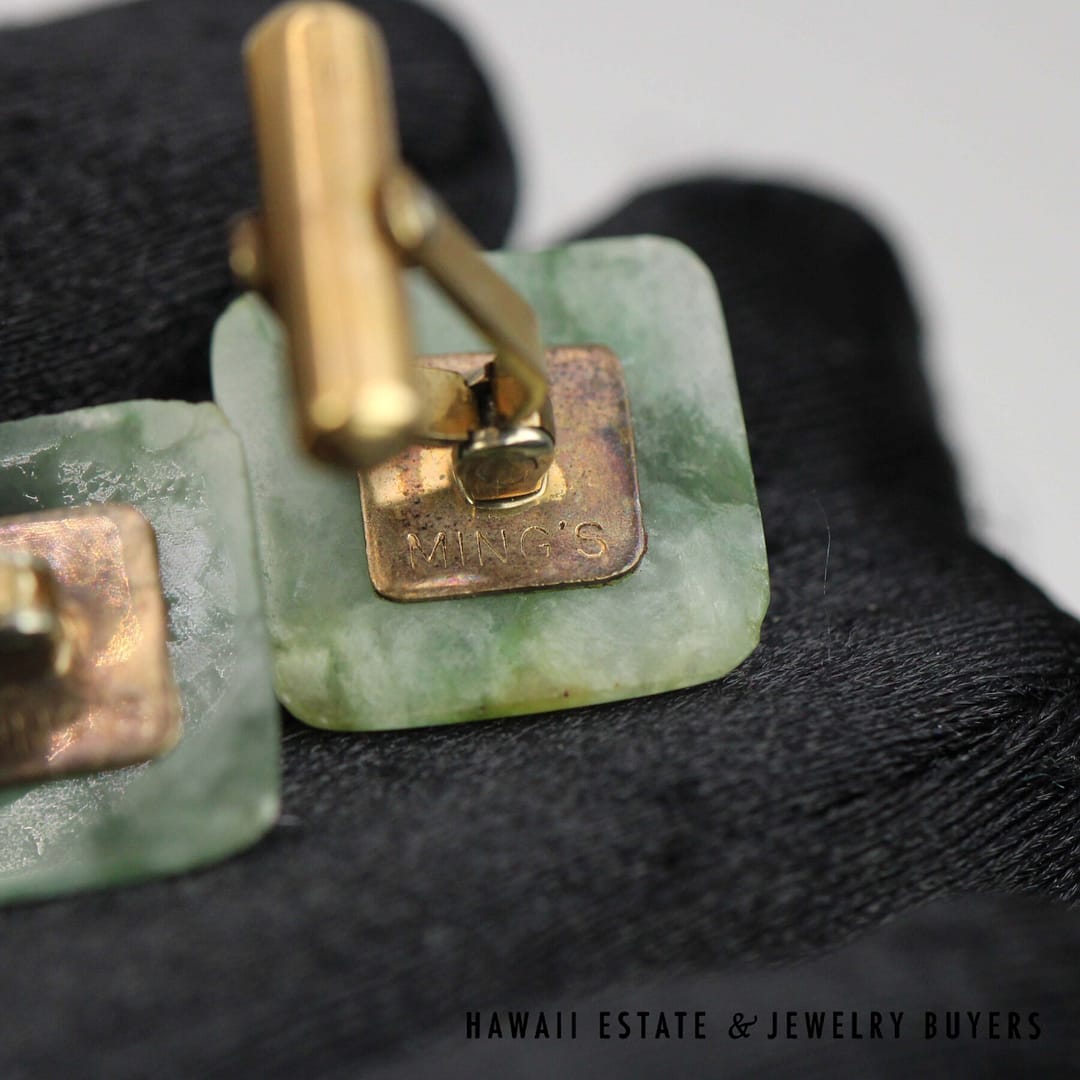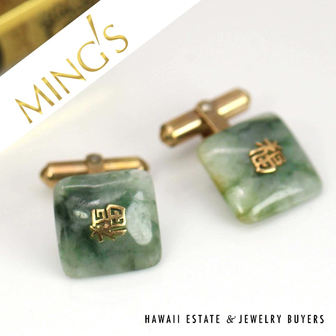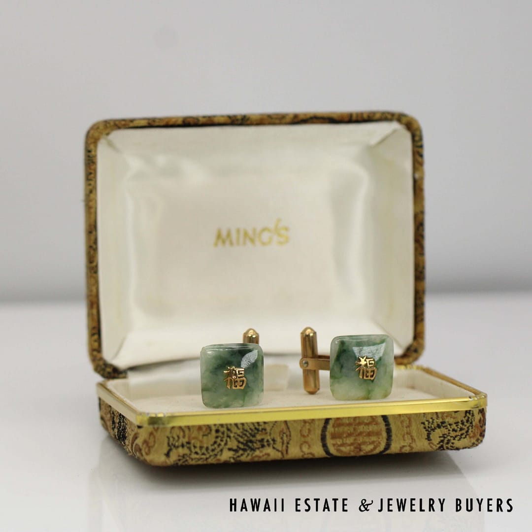 DescriptionMING'S 7.4g 14KYG 15mm SQUARE GREEN JADE CUFFLINKS WITH CHINESE CHARACTER WITH BOX (121923-01)Cuff link findings are Gold Filled$850.001 in stockMing's 15mm Square Green Jade 7.4g 14KYG Cufflinks with Chinese Character with Box quantityAdd to cartMake OfferSKU: 121923-01Category: Pre-owned Ming's JewelryRelated StylesMing’s Hawaii Jade Pale Green/White and Brown Splash 14K Yellow Gold Bangle Bracelet$3,500.00Ming’s Hawaii Pear Jade Pearl Twin Ring$1,125.00Ming’s Black Jade 14K Yellow Gold Set$16,550.00Ming’s Green Jade Cabochon Flower Border Ring$1,800.00