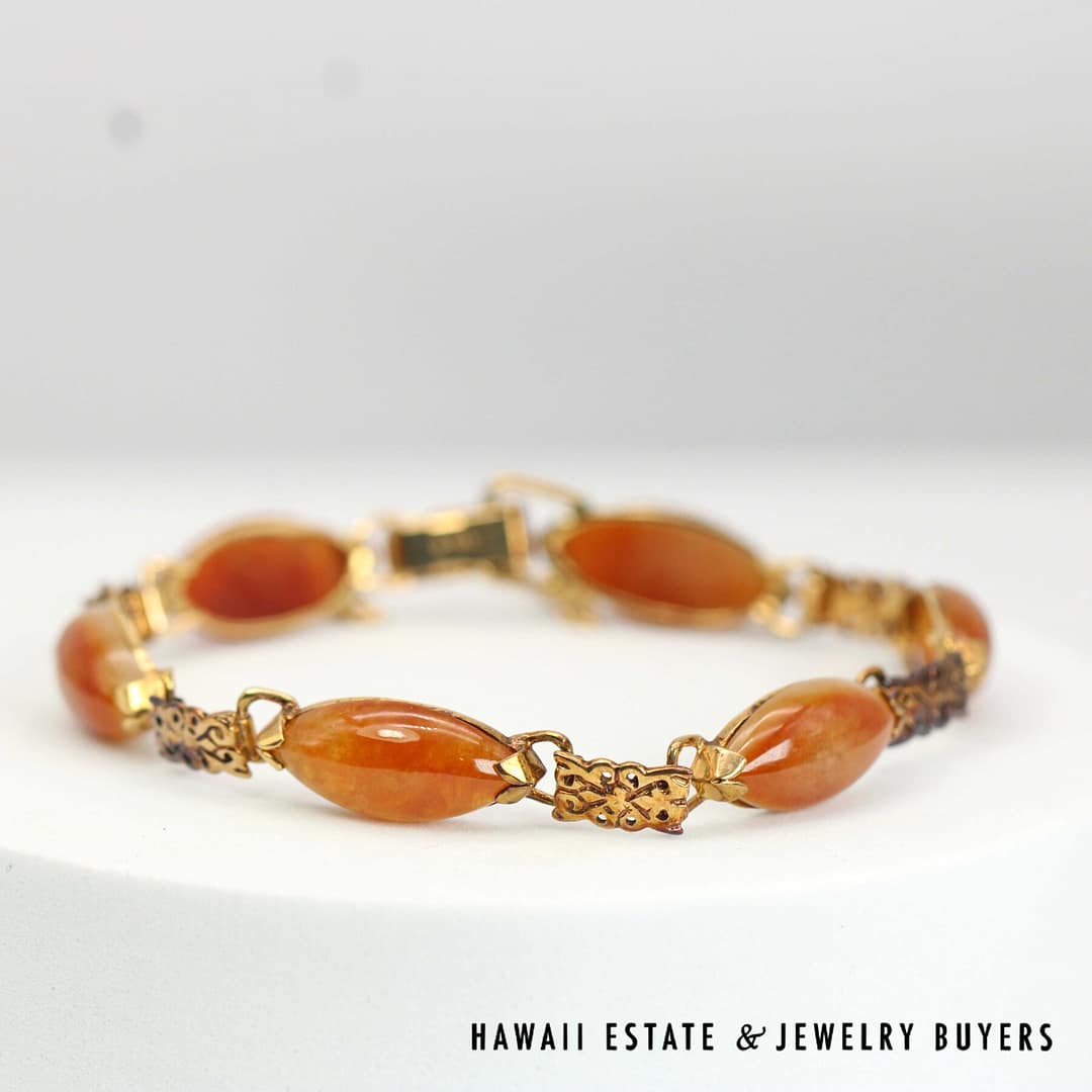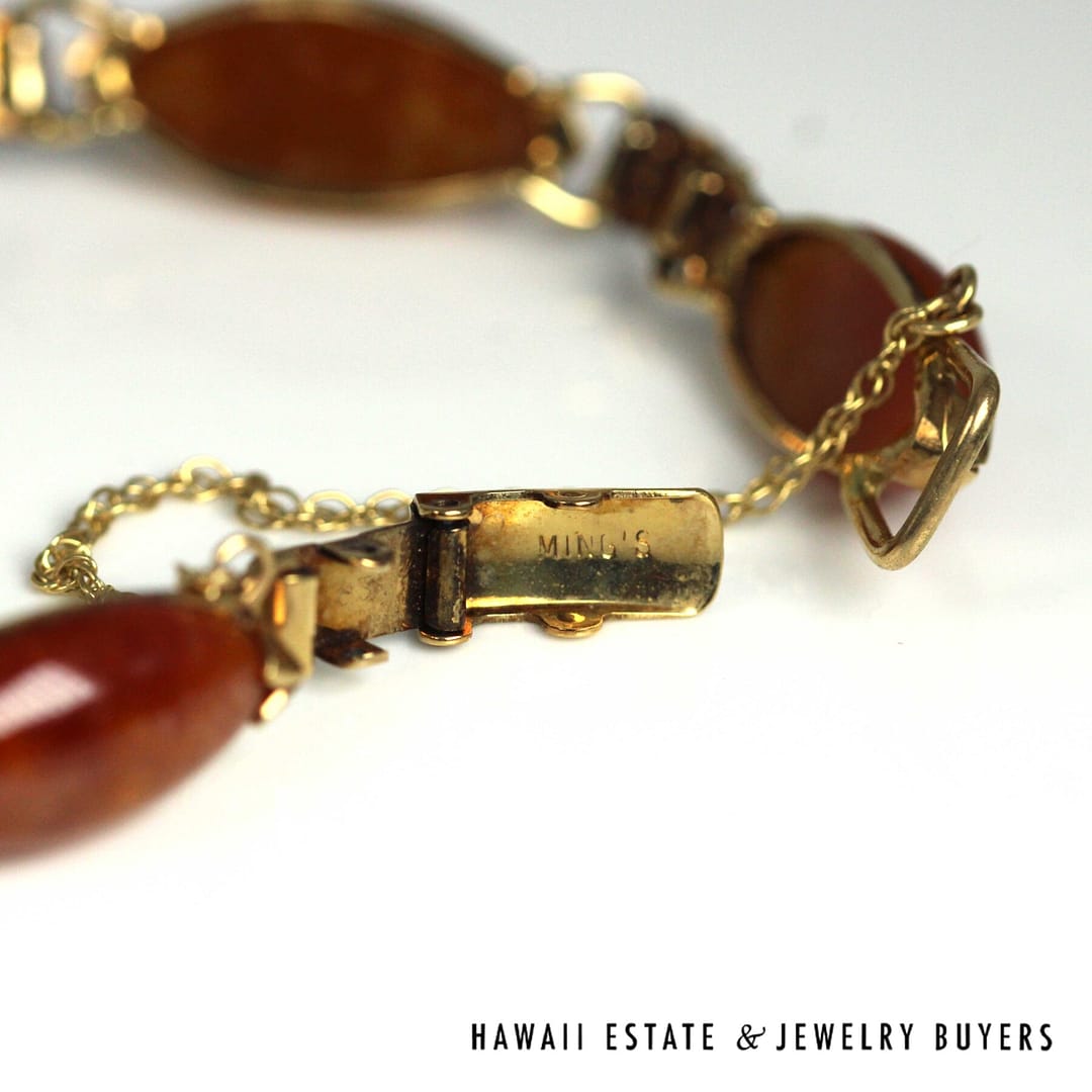 This beautiful bracelet from Ming's Hawaii is crafted from 14k yellow gold, it features a style that is both elegant and timeless. The brand Ming's Hawaii is known for their beautiful jade jewelry, and this bracelet is no exception.