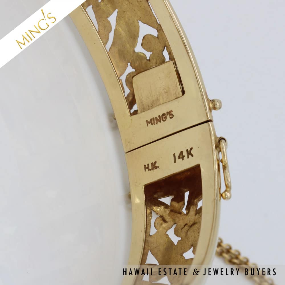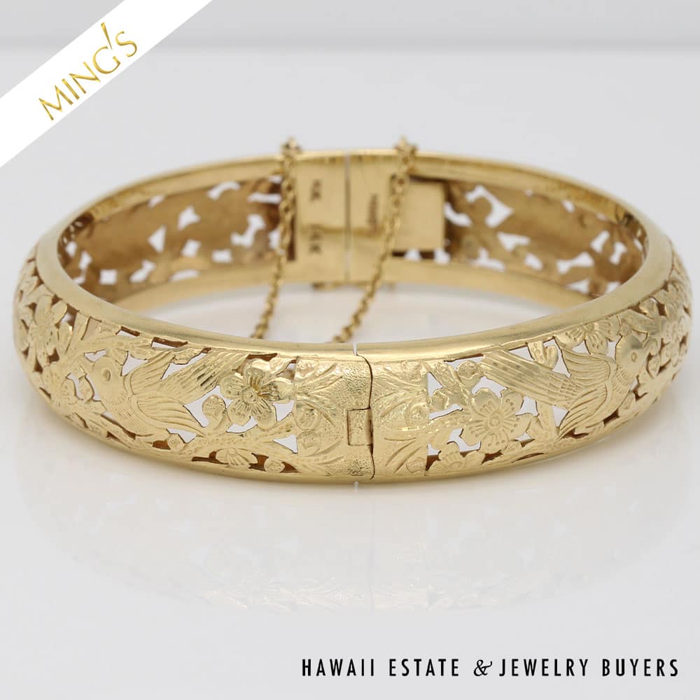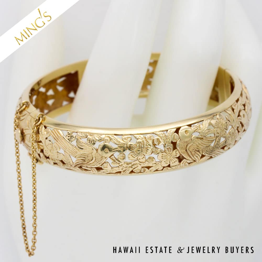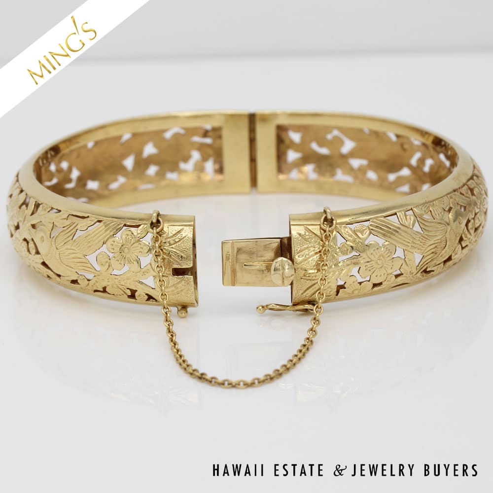 MING’S 24.6g 14K yellow gold bird in plum hinged bangle bracelet Size 7 Bracelet width is 14mm Bracelet is stamped Ming’s H.K. 14K Hinged bangle is in very good condition and has safety chain and figure 8 safety latch