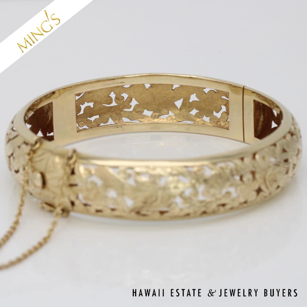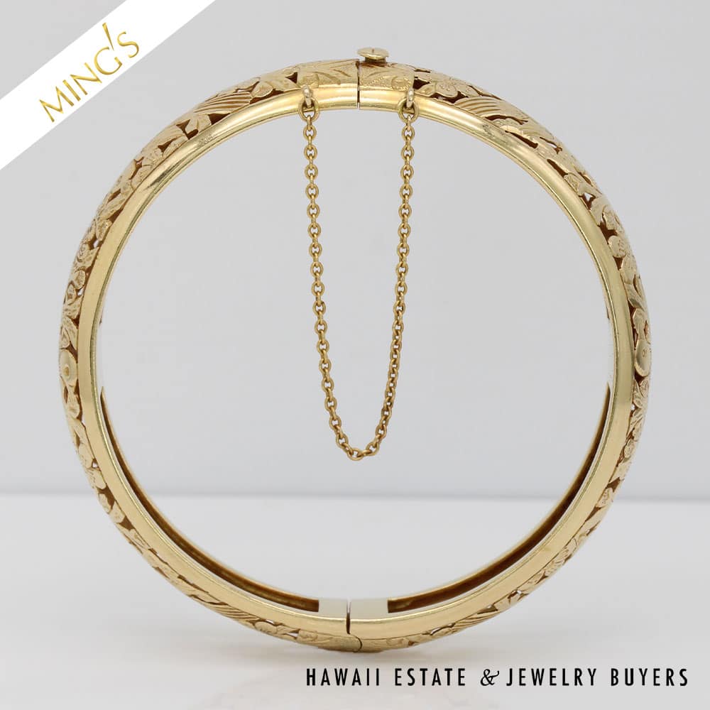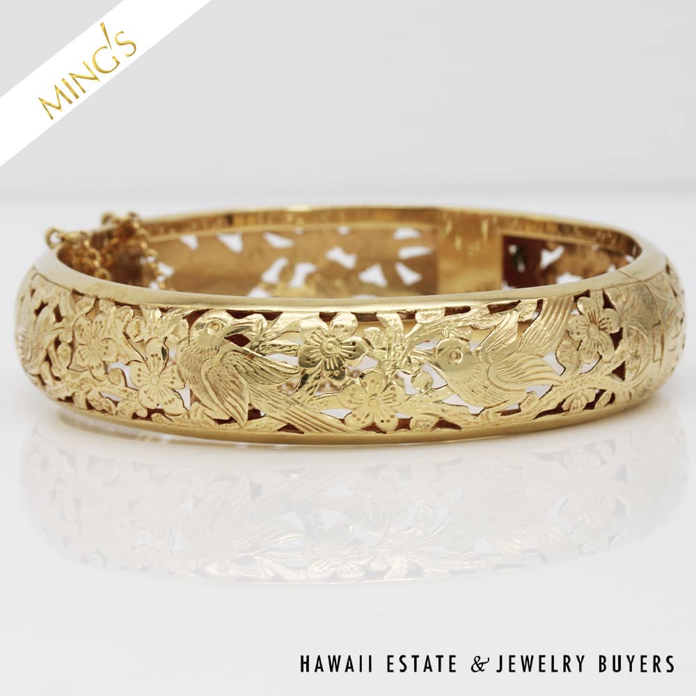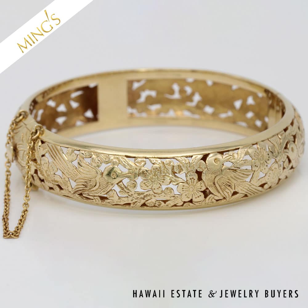 MING’S 24.6g 14K yellow gold bird in plum hinged bangle bracelet Size 7 Bracelet width is 14mm Bracelet is stamped Ming’s H.K. 14K Hinged bangle is in very good condition and has safety chain and figure 8 safety latch