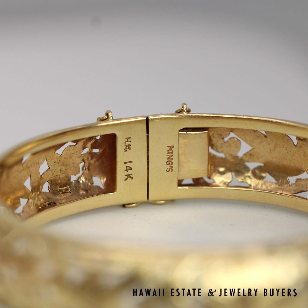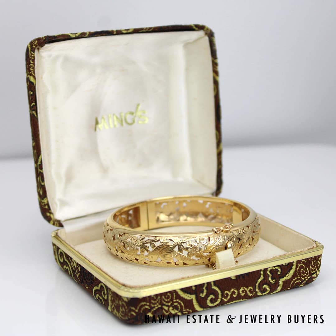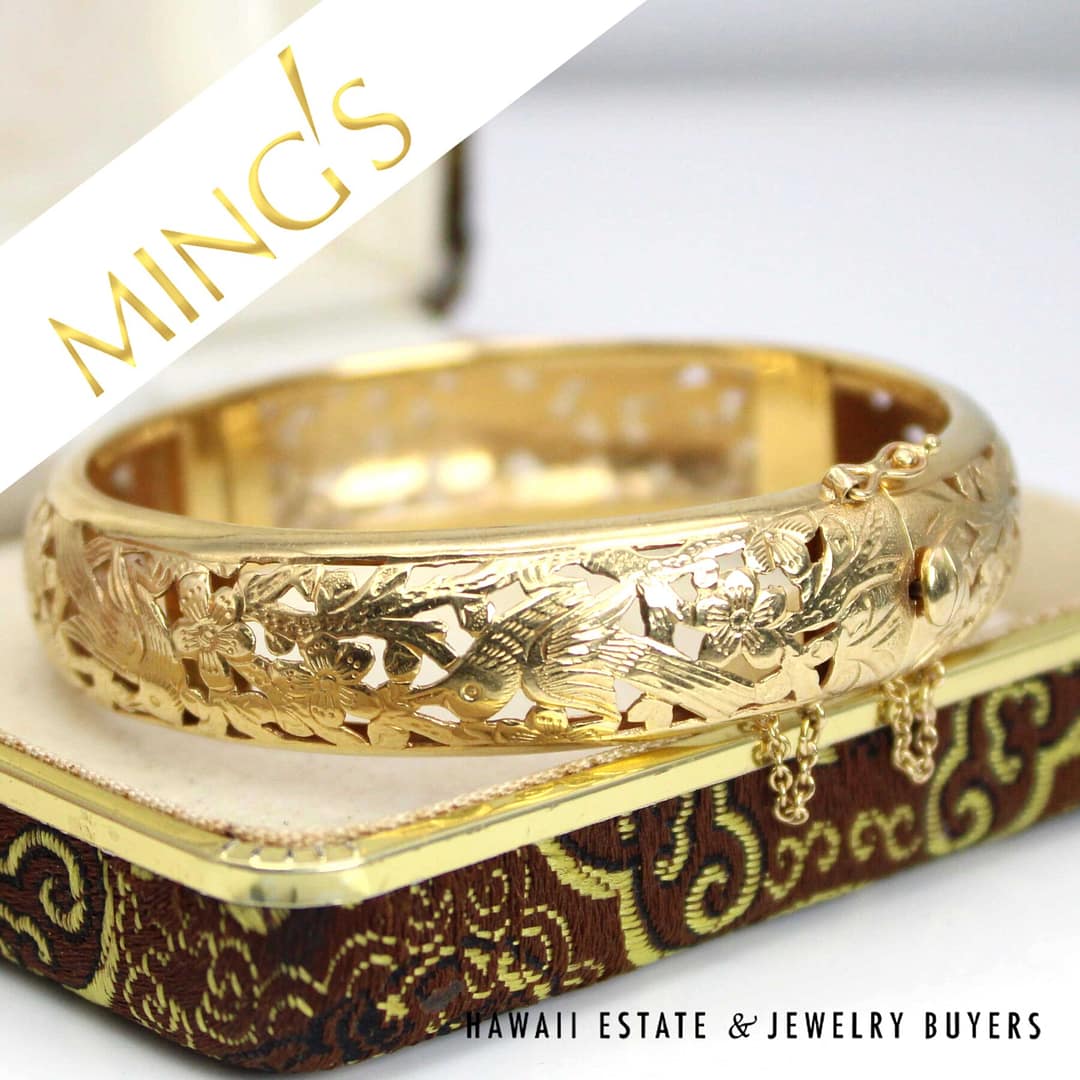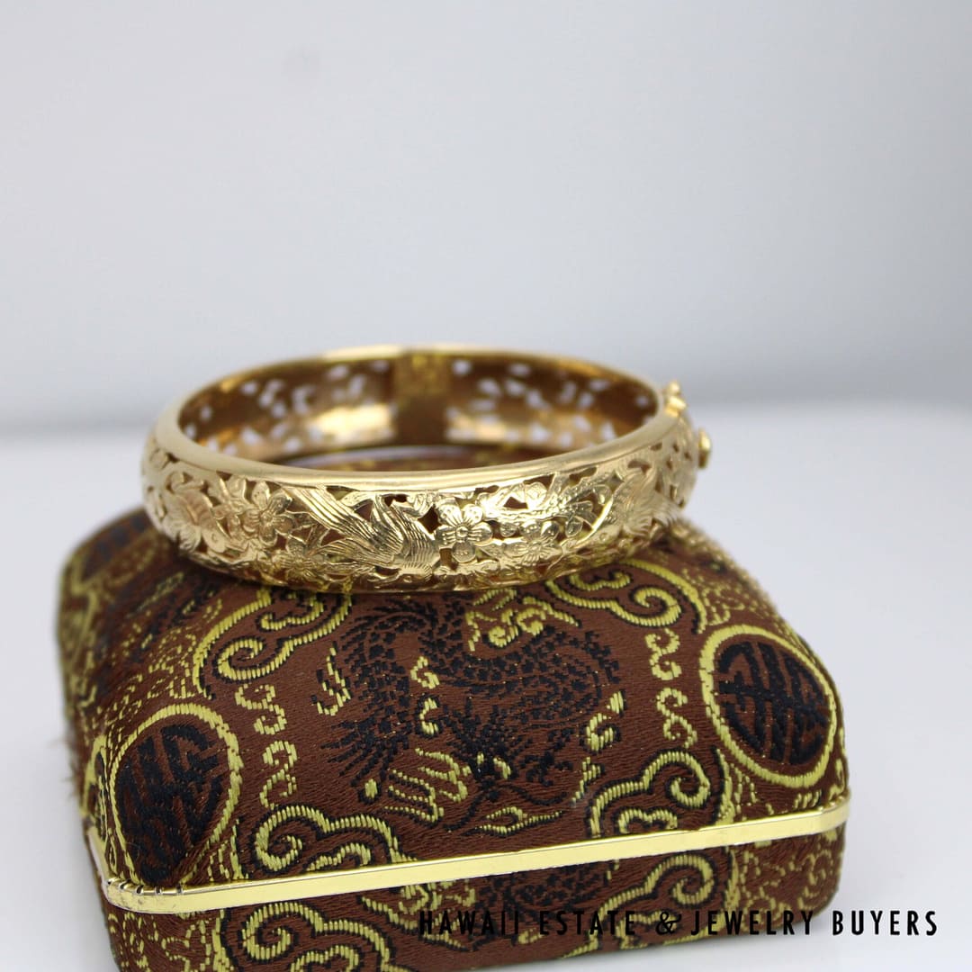This exquisite bracelet with a weight of 27.7g and a size of 7, features a stunning Bird in Plum design recognizable from Ming's Hawaii.