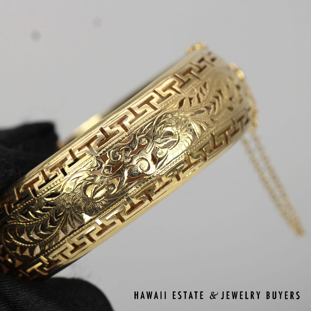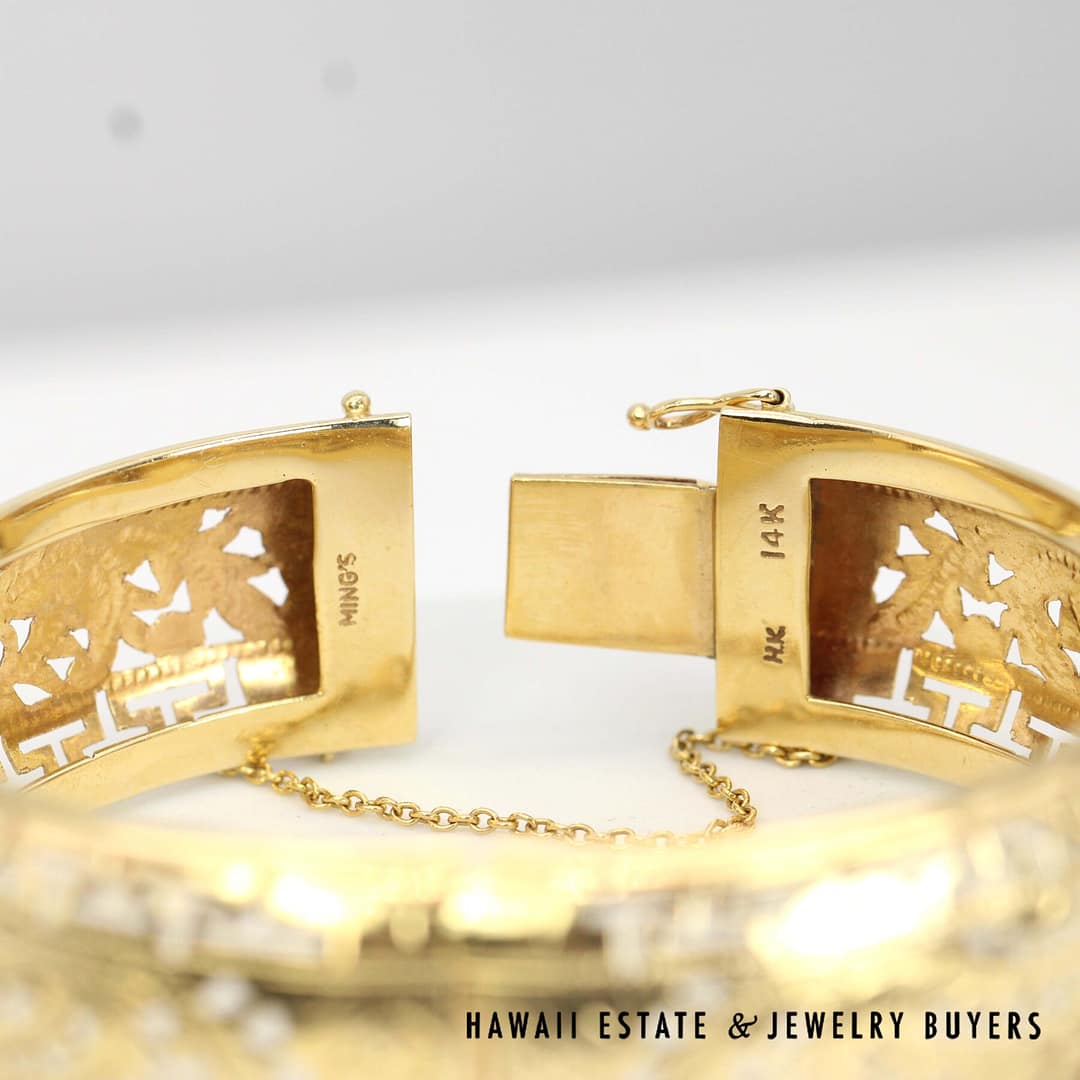 Stunning Ming's Hawaii 14KYG Greek Key Phoenix Hinged Bangle Bracelet, in a stunning 20mm width – this bracelet is a must-have for any Ming's or Vintage jewelry lover.