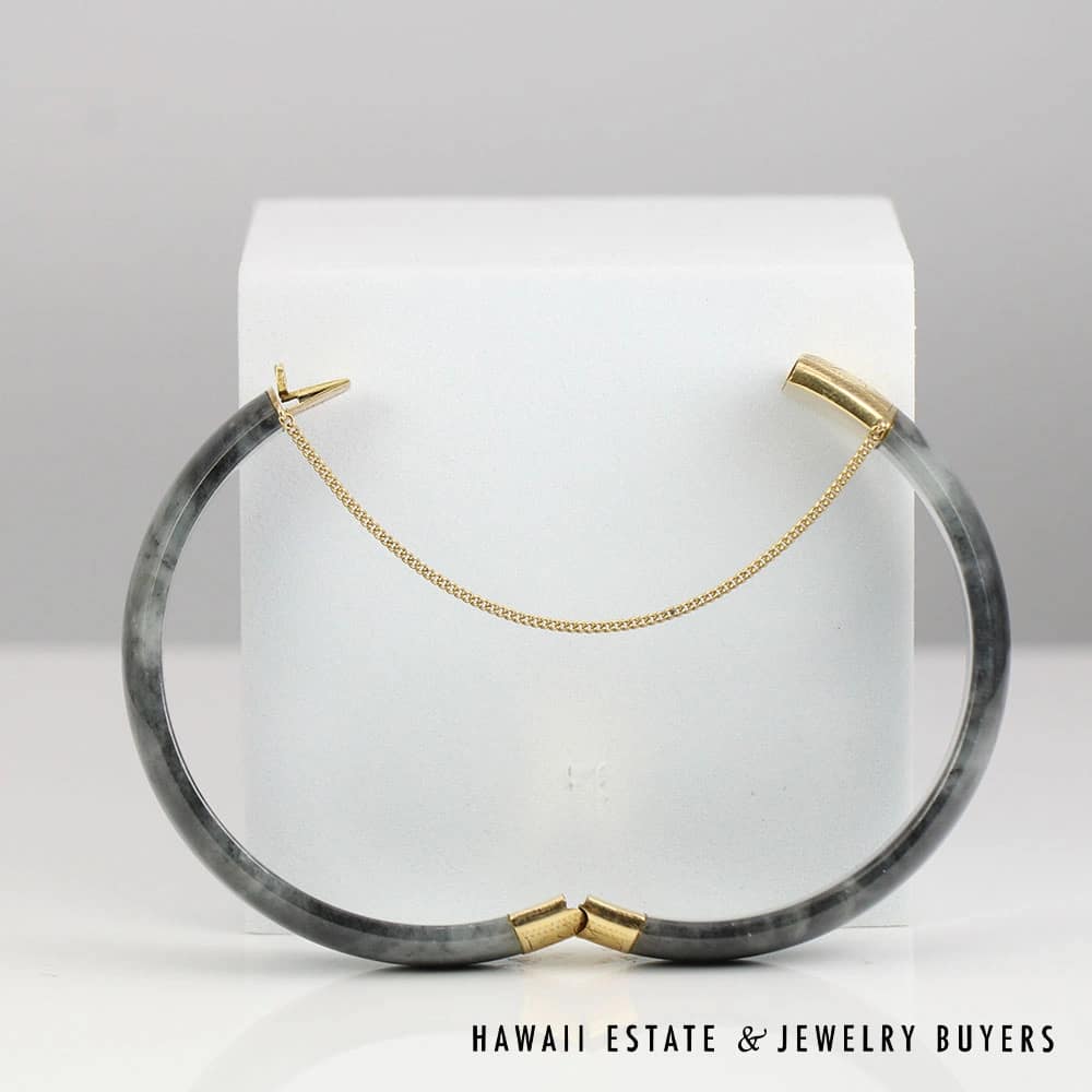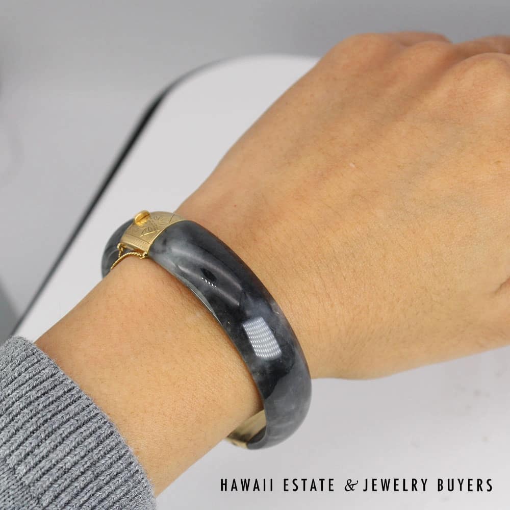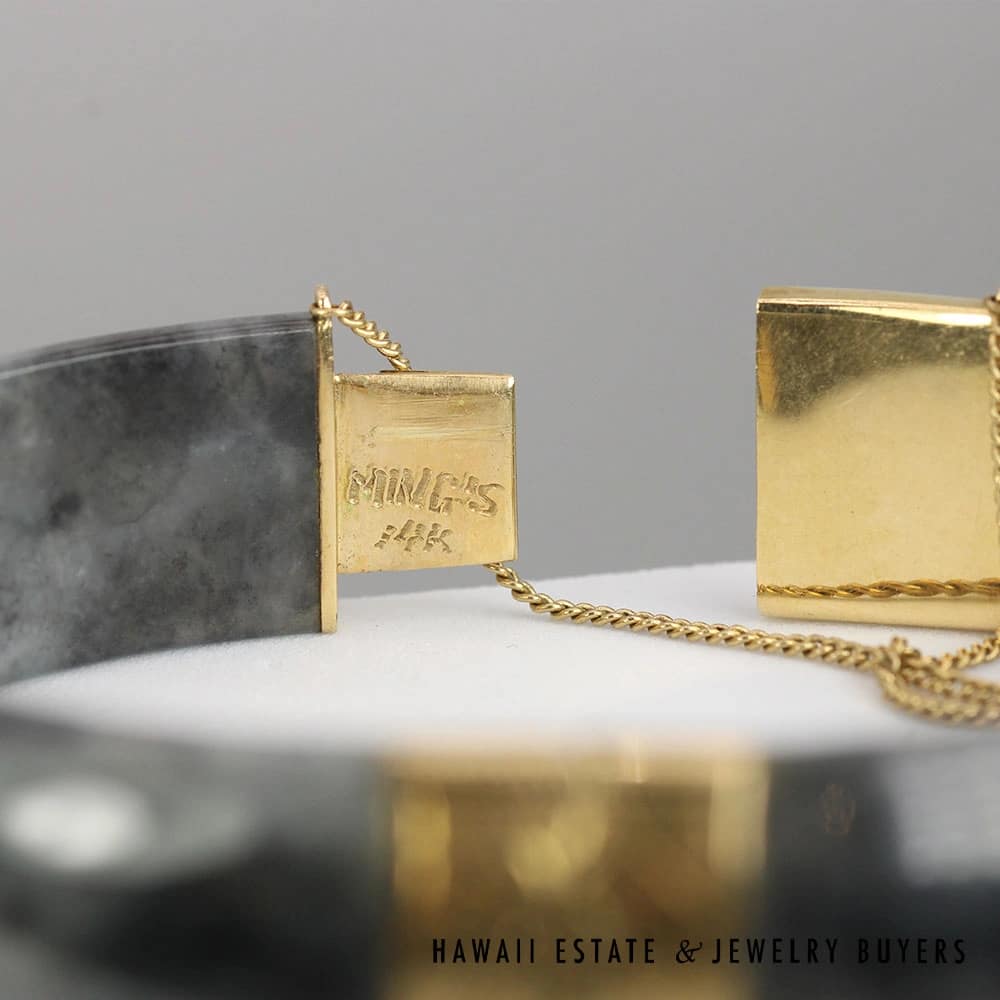DescriptionBeautiful Jade bracelet by Ming’s Hawaii with delicate detail at the hinge and clasp and gorgeous smokey color. Hand signed MING’S 14K.3012-03 Ming’s 35.8g 14KYG 9mm Mottled Black Jade Hinged Bangle Bracelet Size 7$3,800.001 in stockMing's 35.8g 14KYG 9mm Mottled Black Jade Hinged Bangle Bracelet Size 7 quantityAdd to cartMake OfferSKU: 3012-03Category: Pre-owned Ming's JewelryRelated StylesMing’s Hawaii Oval Carved Flower Large Jade 14K Yellow Gold Ring$1,800.00Ming’s Hawaii Pale Green Jade 14K Yellow Gold Bangle Bracelet$6,830.00Ming’s Hawaii 14K Yellow Gold Jade Hinged Bangle$7,710.00Ming’s Lavender Jade & Pearl Ring$3,600.00