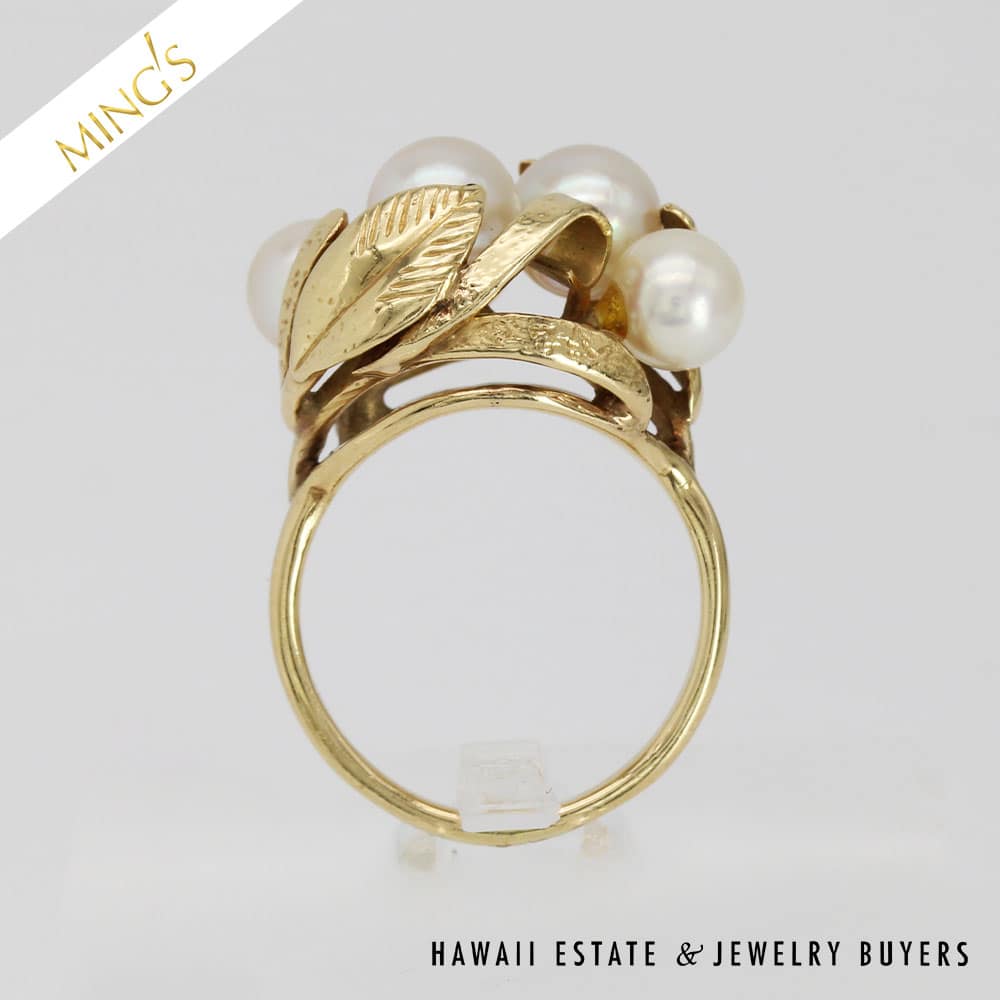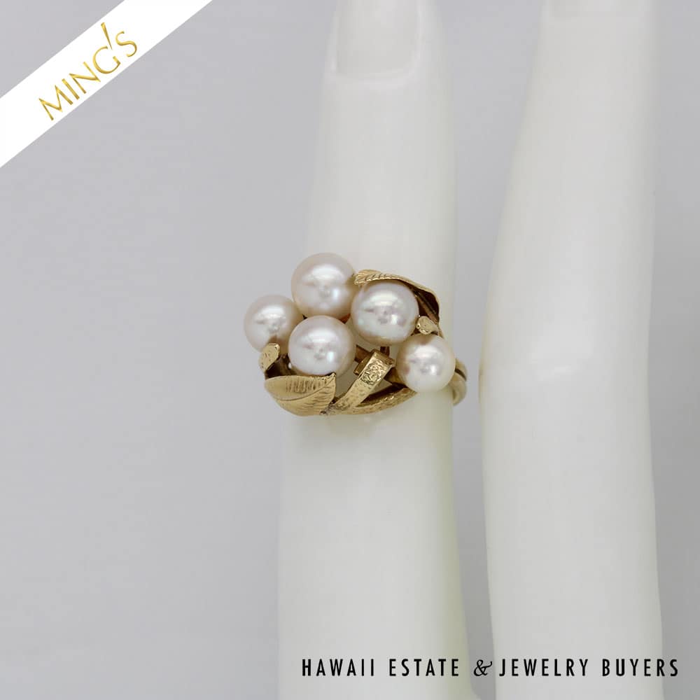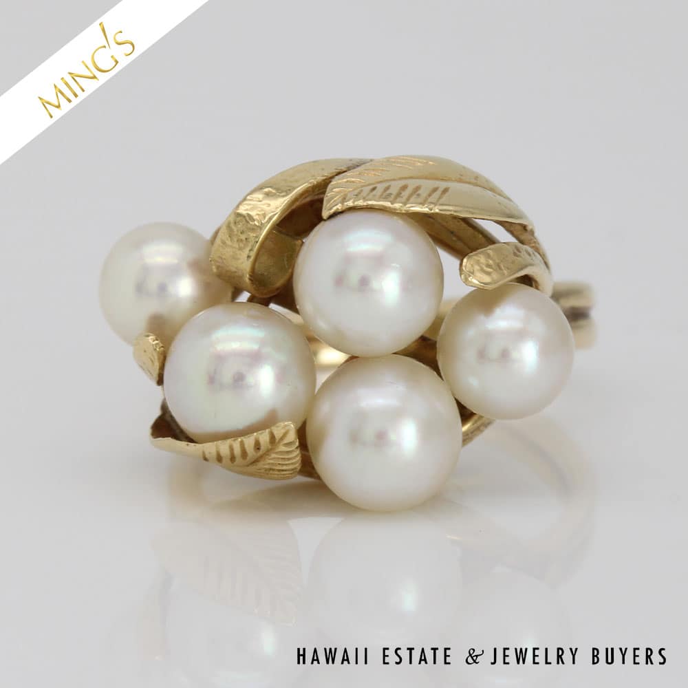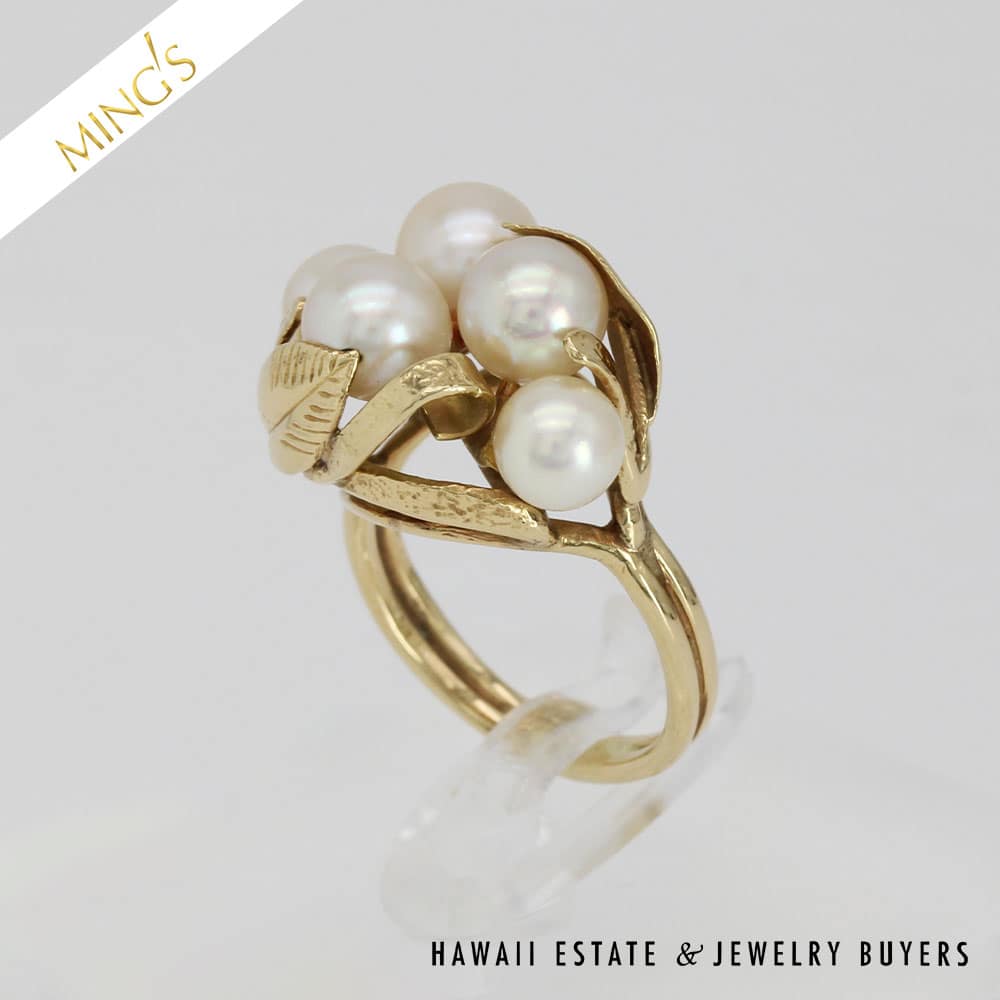 MING’S 5.4g 14K YELLOW GOLD CULTURED PEARL CLUSTER RING SIZE 5 5 Pearls measure approximately 5-6mm in diameter each Band width is 2.5mm Ring is an unsigned Ming’s and stamped 14K