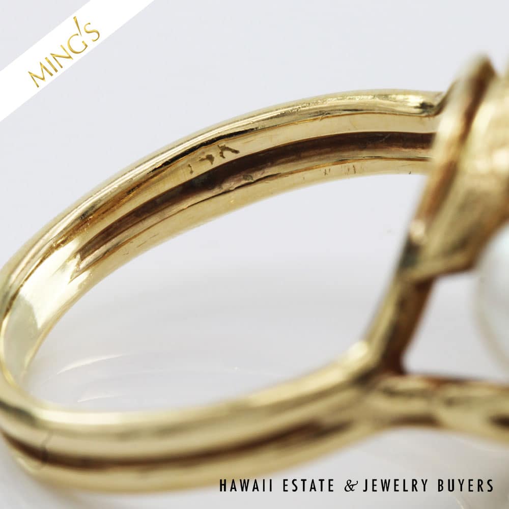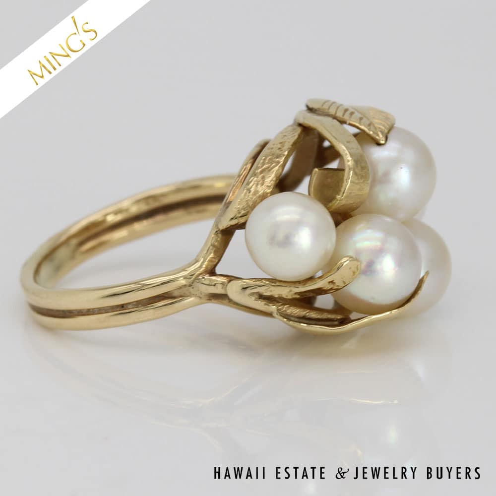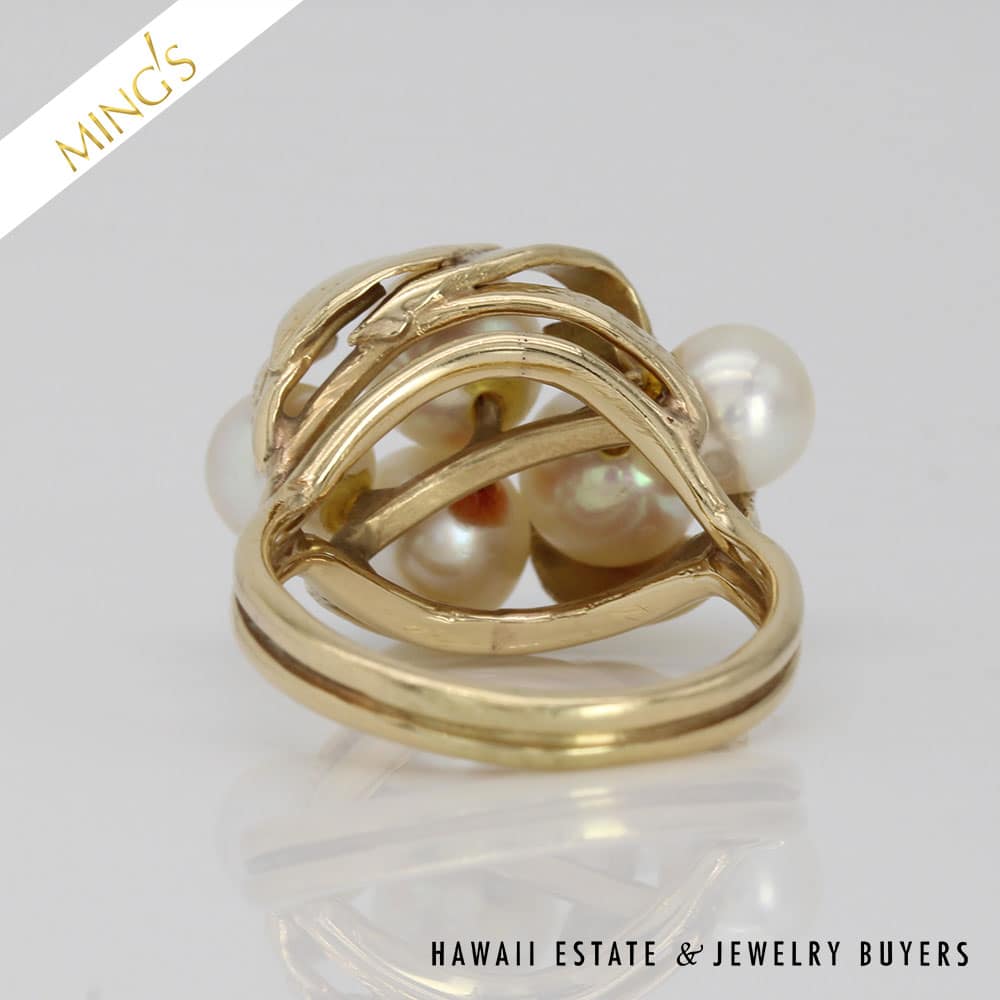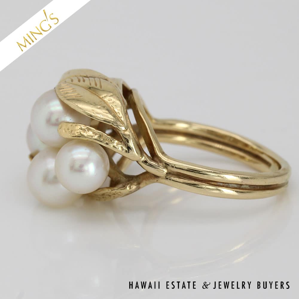 MING’S 5.4g 14K YELLOW GOLD CULTURED PEARL CLUSTER RING SIZE 5 5 Pearls measure approximately 5-6mm in diameter each Band width is 2.5mm Ring is an unsigned Ming’s and stamped 14K
