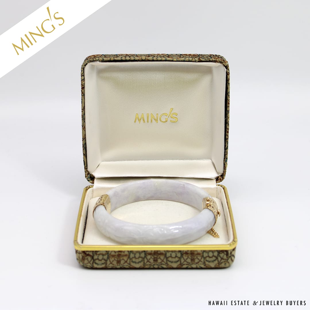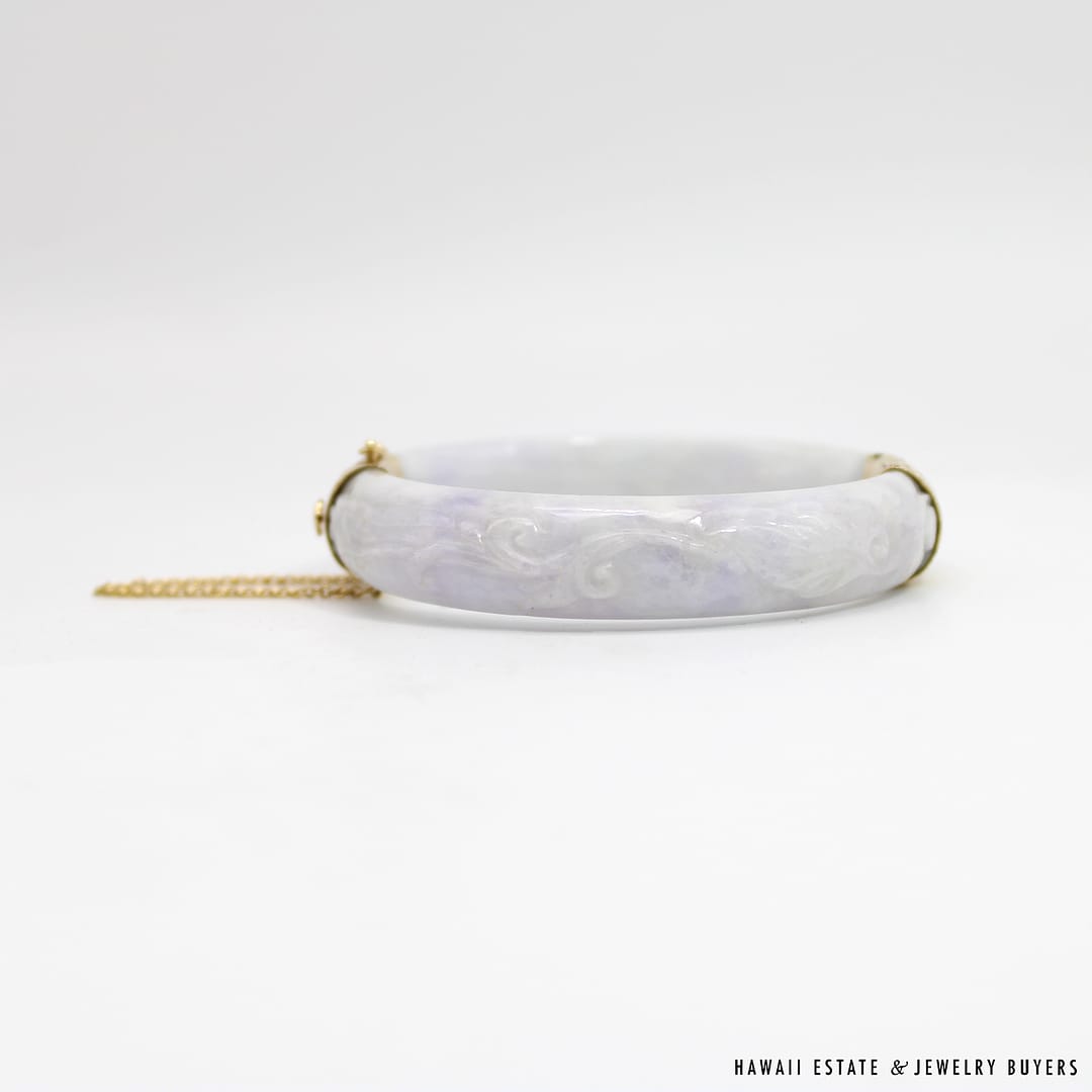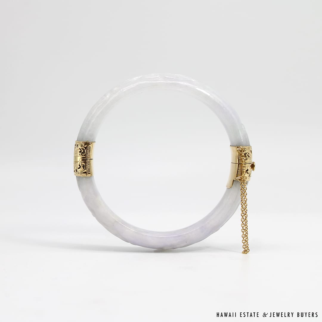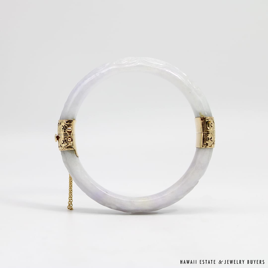 DescriptionBox included, beautiful carved lavender jade hinged bangle from MING’S with box.MINGS 56.5g 14K CARVED LAVENDER JADE HINGED BANGLE BRACELET SIZE 7.25 WITH BOX (2576-01)$2,000.00Out of stockSKU: 2576-01Categories: Pre-owned Ming's Jewelry, Pre-owned Vintage JewelryTags: 14k yellow gold, jade, JADE BANGLE, lavender jade, ming's hawaii, ming's jadeRelated StylesGIA Grade A Nephrite Jade Twist Bangle$3,500.00Certified Twisted White Nephrite Jade Bangle$6,000.00GIA CERTIFIED MARQUISE NATURAL JADE APPLE GREEN COLOR JADE RING GIA JADE SZ 5.25$1,000.00Certified Grade A Natural Jade Cabochon Ring$5,800.00