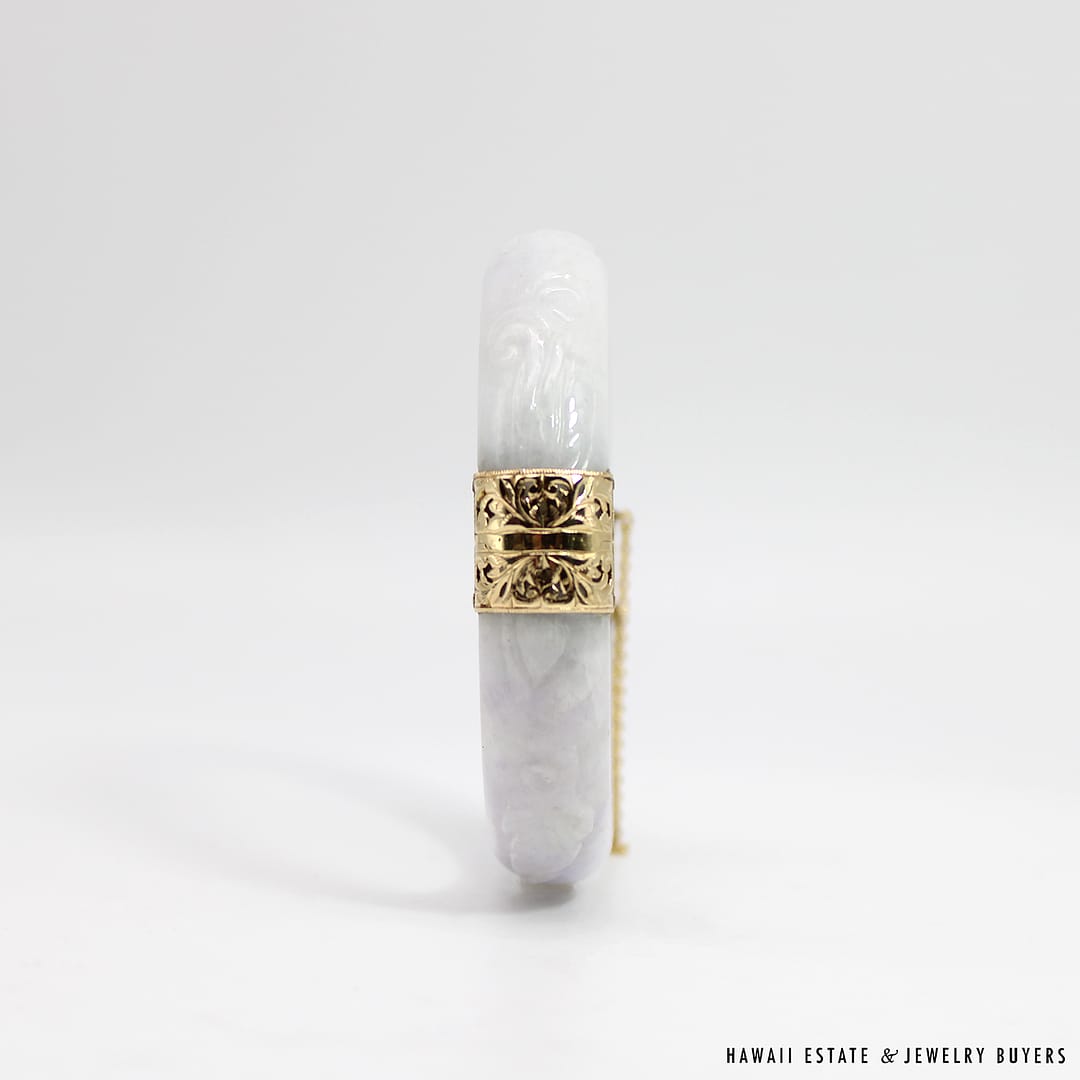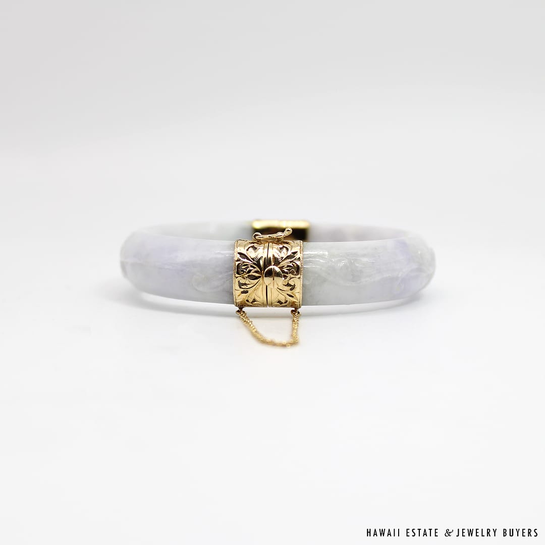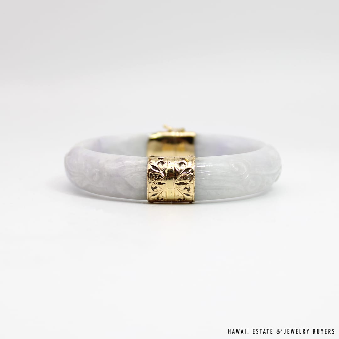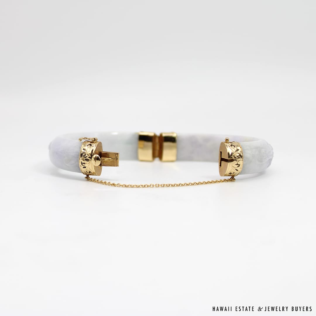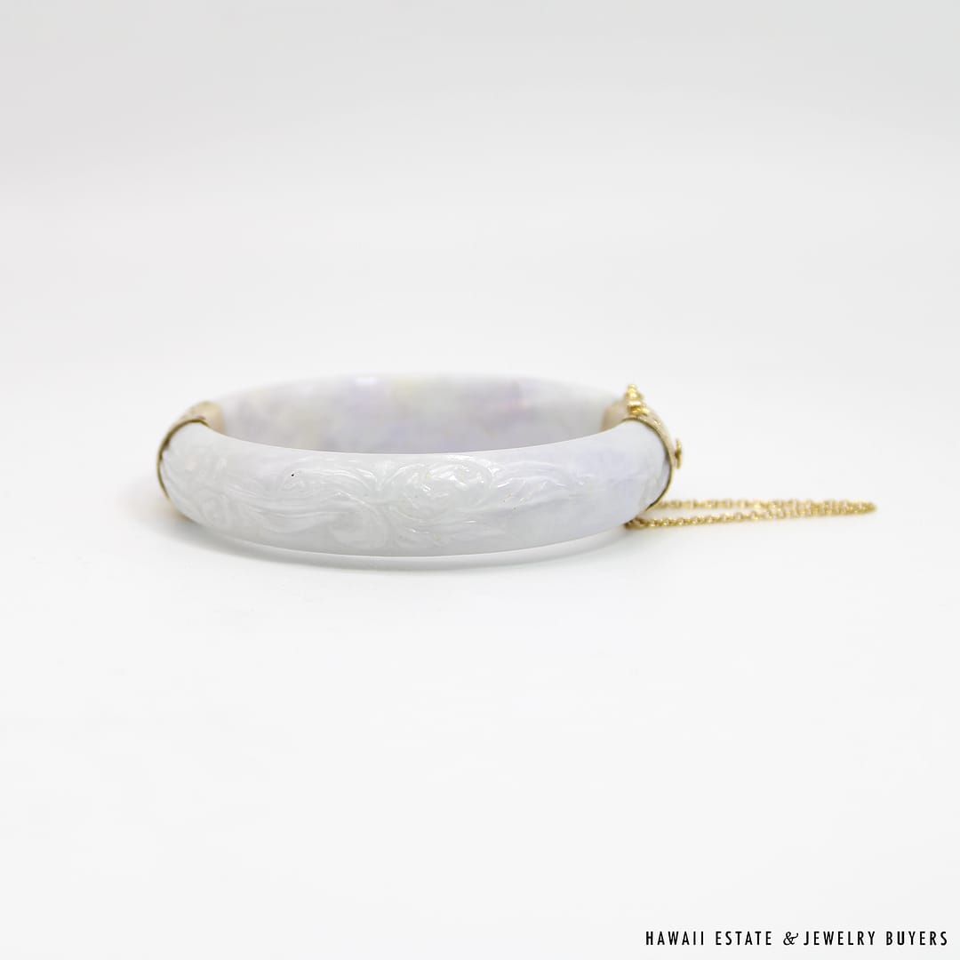 DescriptionBox included, beautiful carved lavender jade hinged bangle from MING’S with box.MINGS 56.5g 14K CARVED LAVENDER JADE HINGED BANGLE BRACELET SIZE 7.25 WITH BOX (2576-01)$2,000.00Out of stockSKU: 2576-01Categories: Pre-owned Ming's Jewelry, Pre-owned Vintage JewelryTags: 14k yellow gold, jade, JADE BANGLE, lavender jade, ming's hawaii, ming's jadeRelated StylesGIA Grade A Nephrite Jade Twist Bangle$3,500.00Certified Twisted White Nephrite Jade Bangle$6,000.00GIA CERTIFIED MARQUISE NATURAL JADE APPLE GREEN COLOR JADE RING GIA JADE SZ 5.25$1,000.00Certified Grade A Natural Jade Cabochon Ring$5,800.00