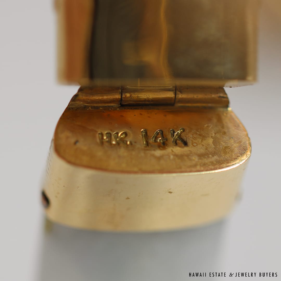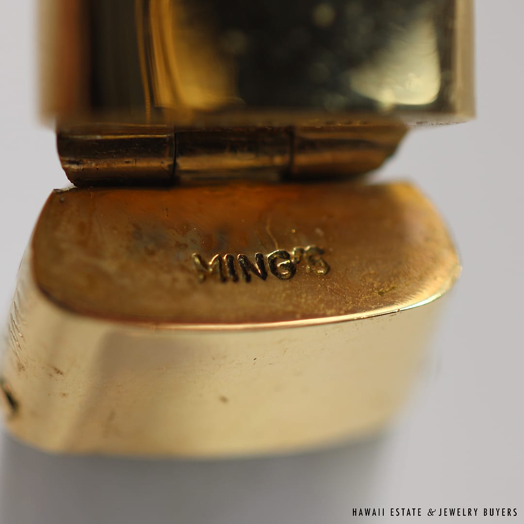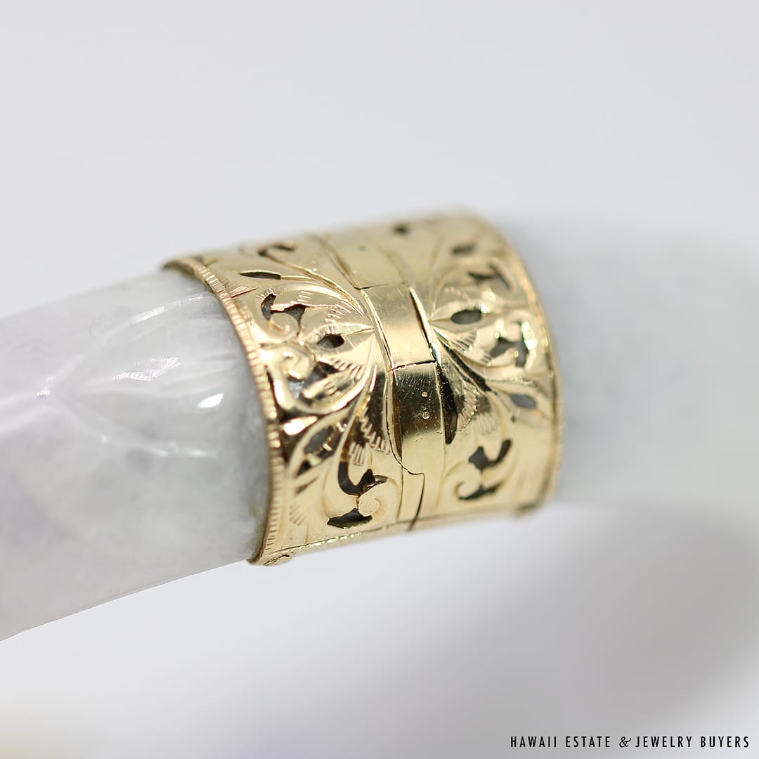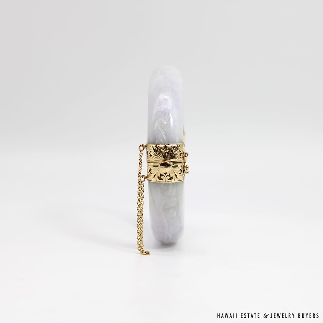 DescriptionBox included, beautiful carved lavender jade hinged bangle from MING’S with box.MINGS 56.5g 14K CARVED LAVENDER JADE HINGED BANGLE BRACELET SIZE 7.25 WITH BOX (2576-01)$2,000.00Out of stockSKU: 2576-01Categories: Pre-owned Ming's Jewelry, Pre-owned Vintage JewelryTags: 14k yellow gold, jade, JADE BANGLE, lavender jade, ming's hawaii, ming's jadeRelated StylesGIA Grade A Nephrite Jade Twist Bangle$3,500.00Certified Twisted White Nephrite Jade Bangle$6,000.00GIA CERTIFIED MARQUISE NATURAL JADE APPLE GREEN COLOR JADE RING GIA JADE SZ 5.25$1,000.00Certified Grade A Natural Jade Cabochon Ring$5,800.00
