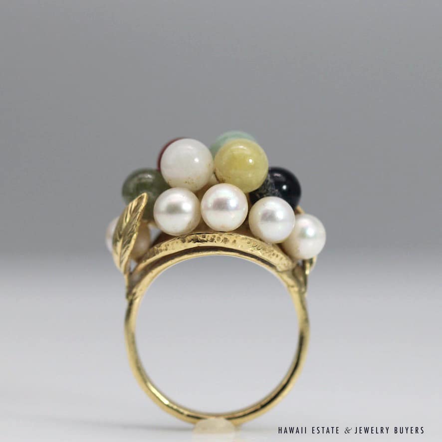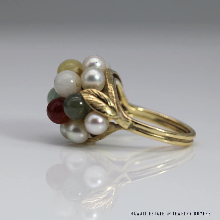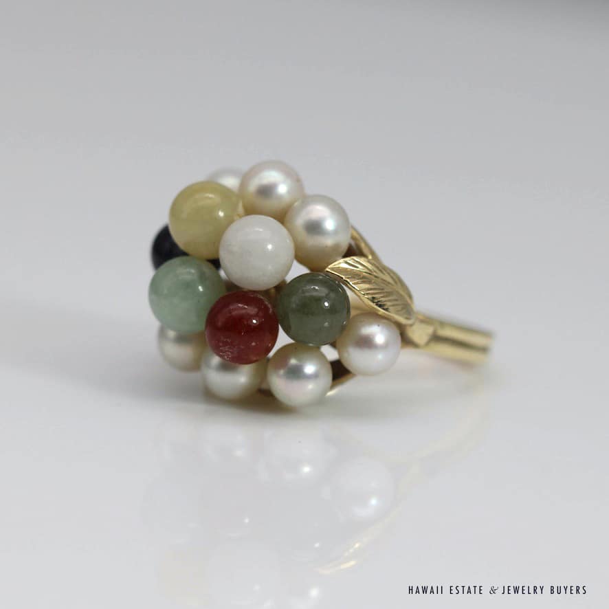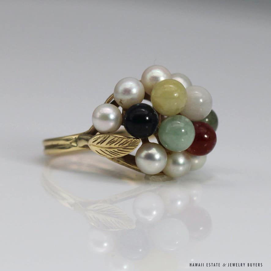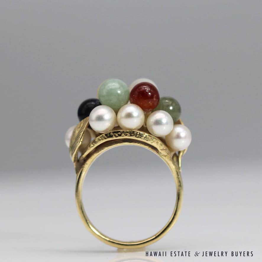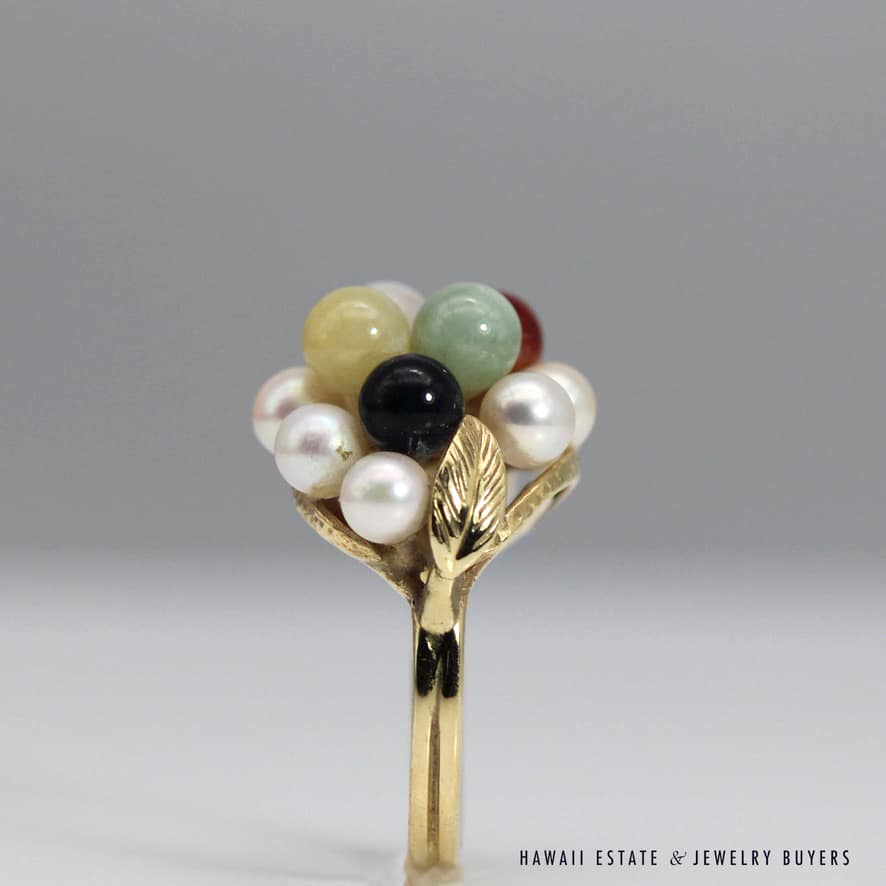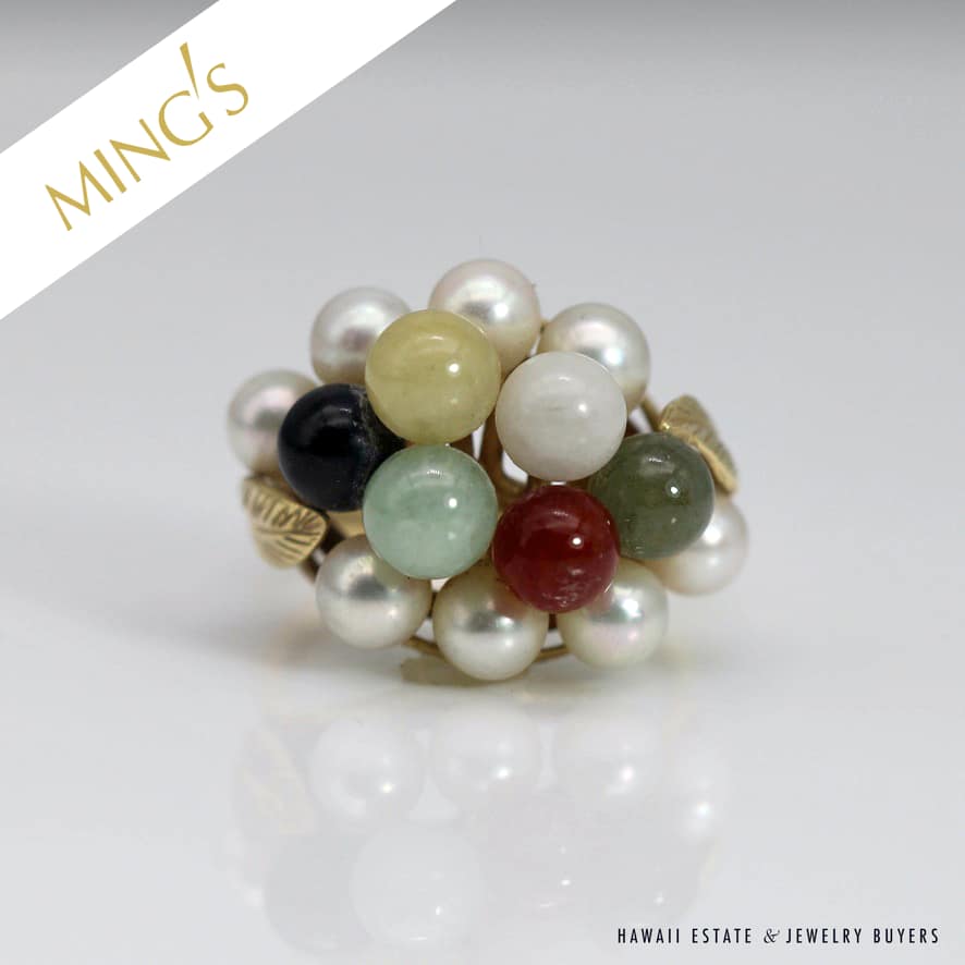 MING’S 6.2g YELLOW GOLD RING STAMPED MING’S 14K IS SET WITH 5mm MULTI-COLORED JADE STONES AND 4mm-4.5mm PEARLS IN A CLUSTER. RING HAS A LEAF MOTIF ON THE SIDES. RING SIZE IS 5.5.
