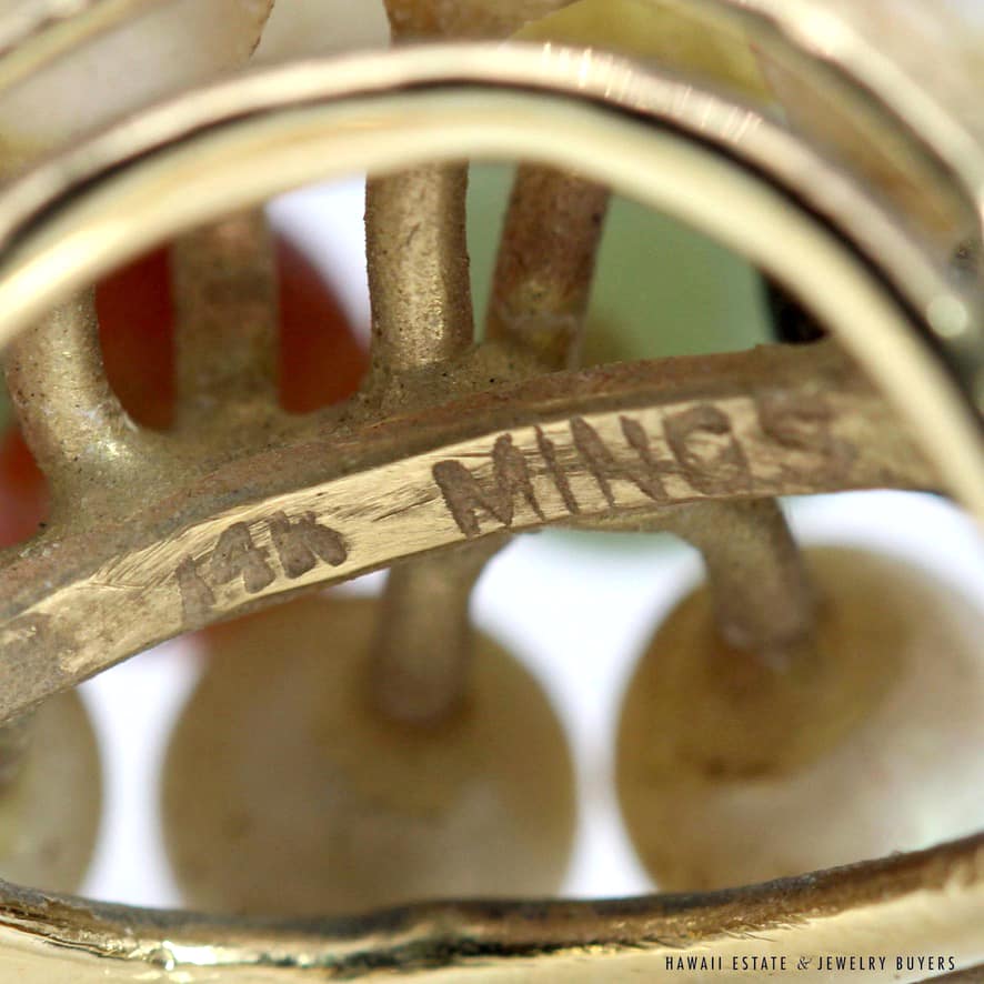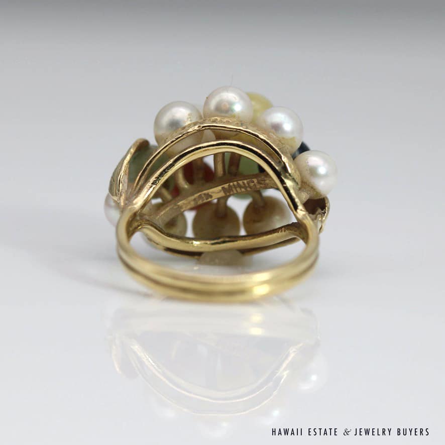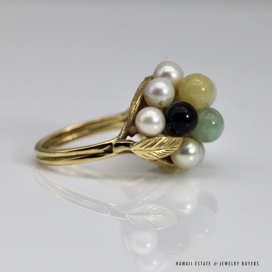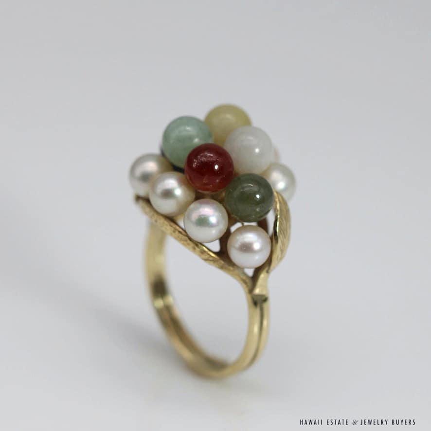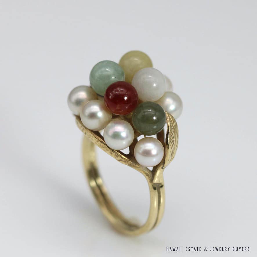 Home » Shop » MING’S 6.2g 14KYG MULTI JADE & PEARL CLUSTER W/LEAF MOTIF RING SIZE 5.5