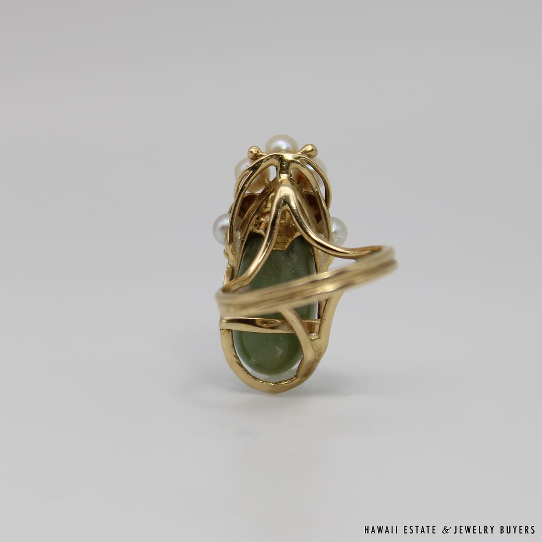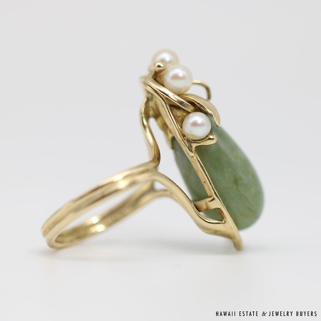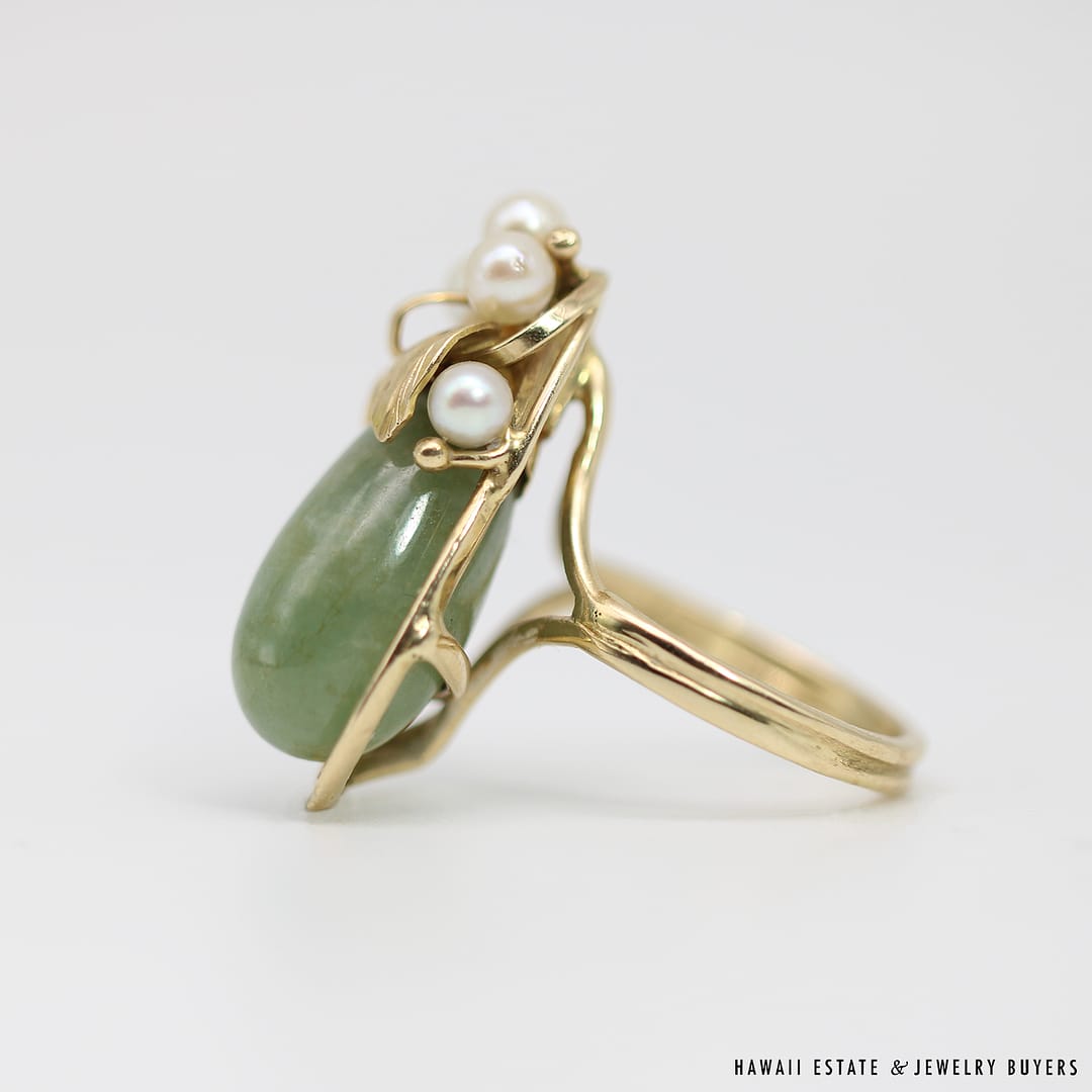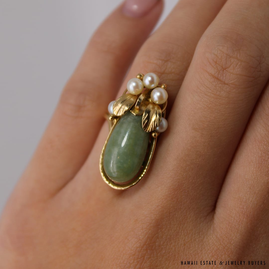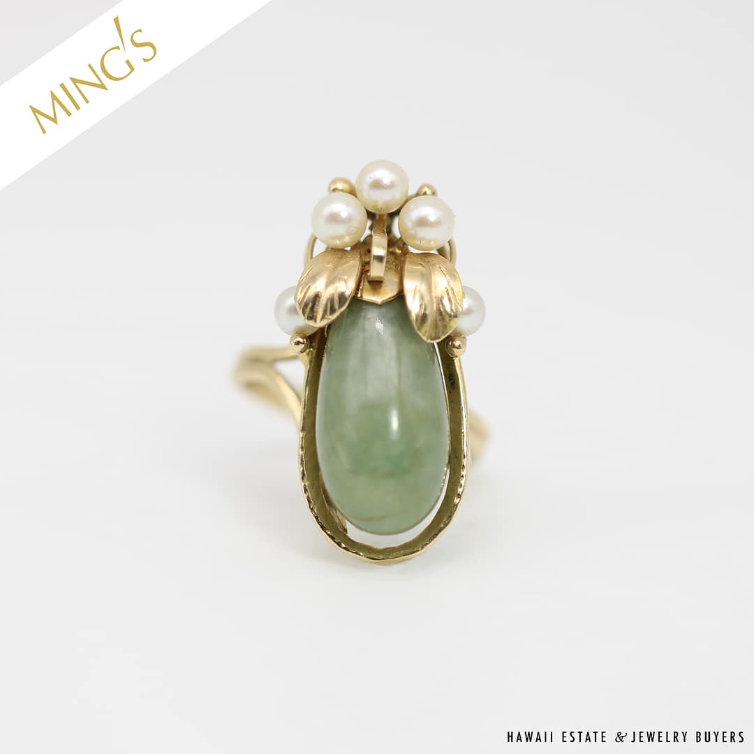 DescriptionSIZE: 5.5WEIGHT: 7.5gPEARLS VARY FROM APPROX. 3.5mm-3.8mmINCONCLUSIVE STAMP ON RING, ACID TESTED 14KSTAMPED MING’SMings Hawaii jade and pearl 14k yellow gold ring (243951)$1,300.001 in stockMING'S 7.5g GREEN JADE AND PEARL RING SIZE 5.5 quantityAdd to cartBuy withMake OfferSKU: 2439-51Category: Pre-owned Ming's JewelryRelated StylesMing’s Black Jade 14K Yellow Gold Set$4,300.00Ming’s Hawaii Pear Jade Pearl Twin Ring$1,125.00Ming’s Hawaii Bi-Color Jade Flower Ring$2,500.00Ming’s Hawaii Pearl Cluster Leaf 14K Ring$1,600.00