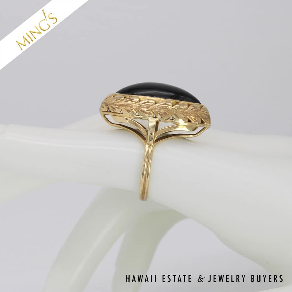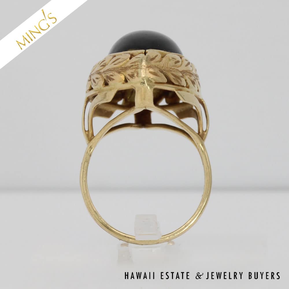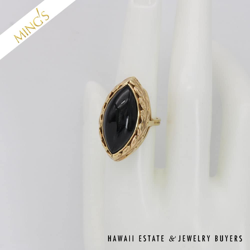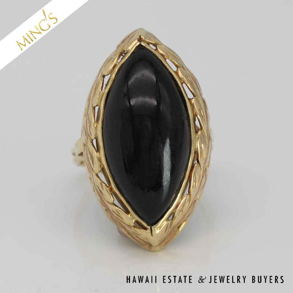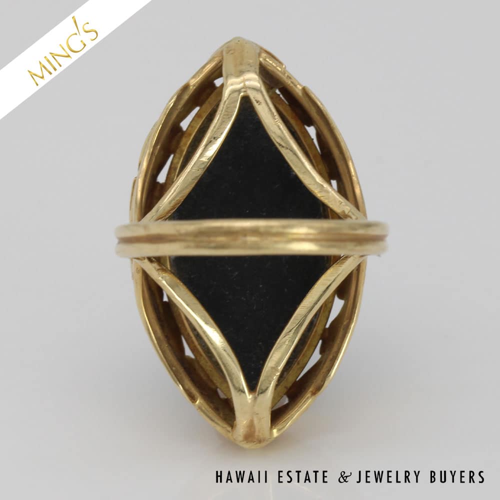 DescriptionMING’S 8.5g 14K YELLOW GOLD BLACK JADE 23x11mm MARQUISE CABOCHON RINGSIZE 7Band width is 2.4mmRing is stamped Ming’s and 14K$2,125.001 in stockMING'S 8.5g 14KYG BLACK JADE 23x11mm MARQUISE CAB RING SIZE 7 quantityAdd to cartBuy withMake OfferSKU: CC110920-03Categories: Pre-owned gold jewelry, Pre-owned Ming's JewelryTags: ming's, Ming's Black Jade, Ming's Black Jade Ring, Ming's Jade Ring, Ming's Marquise Cabochon Ring, MING'S RING, Size 7Related StylesMing’s Jade Hinged Bangle$3,500.00Ming’s Hawaii Pearl Cluster Flower 14K Ring$1,100.00Ming’s Black Jade 14K Yellow Gold Set$4,300.00Ming’s Hawaii Oval Carved Flower Large Jade 14K Yellow Gold Ring$1,800.00