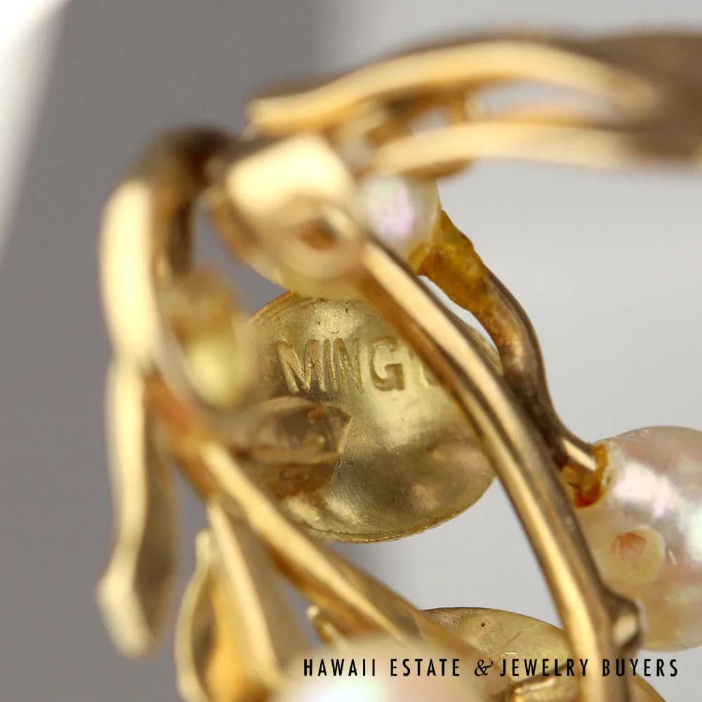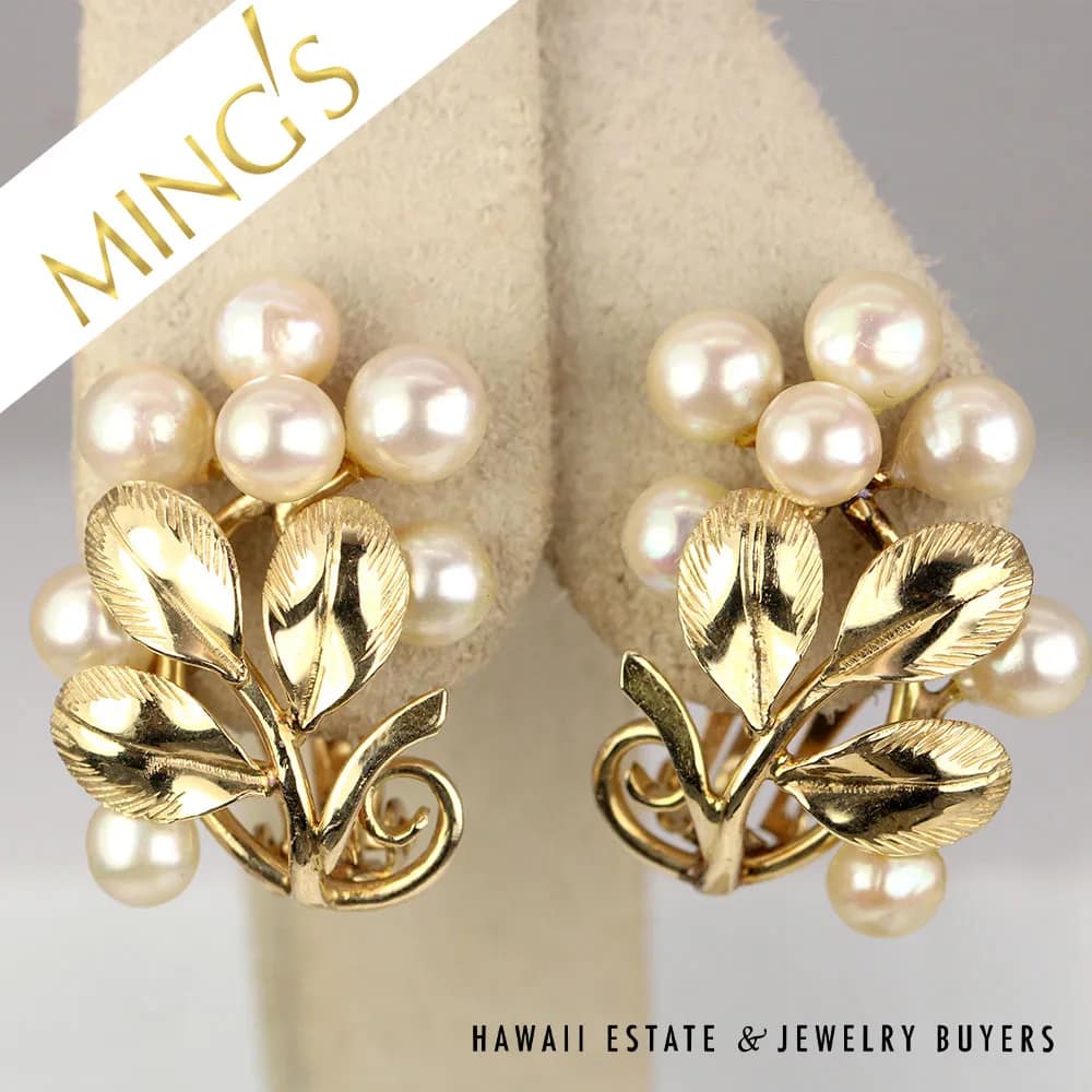 DescriptionClip on (no pierce). Beautiful cluster of cultured pearl and 14K Yellow gold leaves from iconic Hawaii designer MING’S.$1,500.001 in stockMING'S 9.2g 14KYG 5-5.5mm CULTURED PEARL CLUSTER CLIP EARRING MEASURE 27X20mm quantityAdd to cartBuy withMake OfferSKU: 2786-09Categories: Pre-owned Ming's Jewelry, Pre-owned Pearl JewelryTags: ming's, pearl earrings, pearlsRelated StylesMing’s Lavender Jade & Pearl Ring$3,600.00Ming’s Hawaii Pearl & Multi-Color Jade Cluster 14K Ring$2,650.00Ming’s Hawaii Pearl Cluster Leaf 14K Ring$1,600.00Ming’s Hawaii Twin Jade Ball Pearl Ring$1,300.00