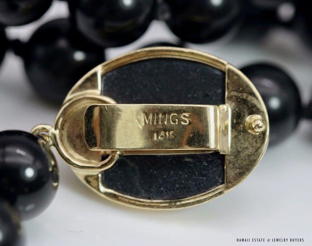 MING'S 76.9g YELLOW GOLD BEADED NECKLACE SIGNED MING'S 14K IS SET WITH 9mm BLACK JADE BEADS. NECKLACE HAS AN OVAL CLASP SET WITH BLACK JADE. NECKLACE LENGTH IS 30".