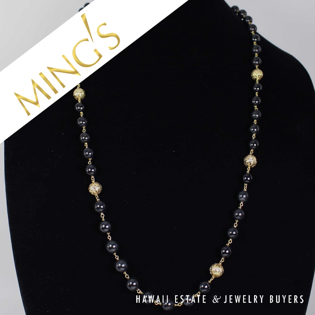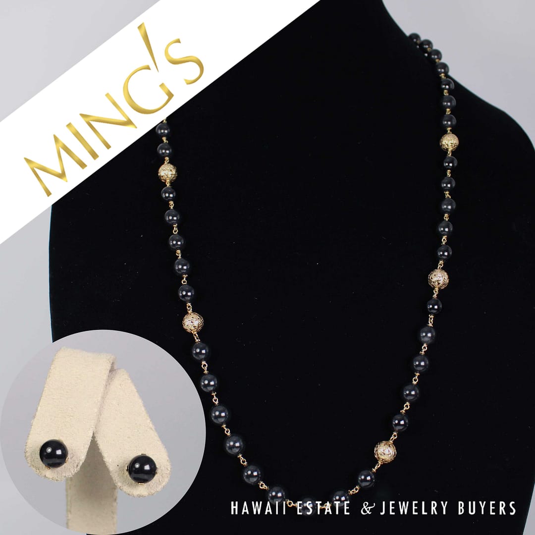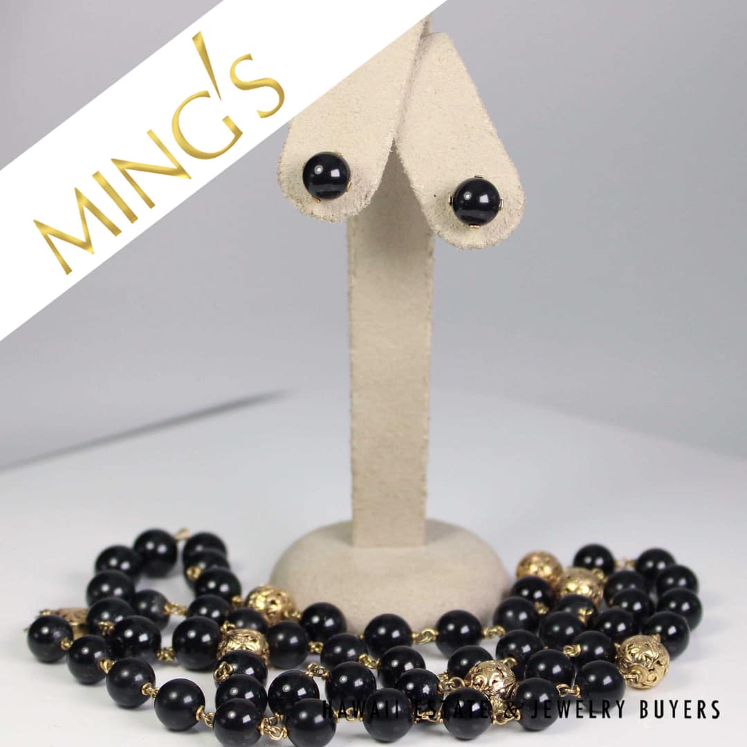 DescriptionA rare gorgeous set by Ming’s Hawaii featuring black jade beads accented by carved gold beads and matching gold ball stud earrings.MING’S 14KYG BLACK JADE AND GOLD BALL 30″ NECKLACE AND EARRING SET (2809-03)$3,500.001 in stockMing's Black Jade and Gold Ball 14k Yellow Gold 30" Necklace and Earring Set quantityAdd to cartMake OfferSKU: 2809-03Category: Pre-owned Ming's JewelryRelated StylesMing’s Hawaii Oval Carved Flower Large Jade 14K Yellow Gold Ring$1,800.00Ming’s Hawaii Pale Green Jade 14K Yellow Gold Bangle Bracelet$6,830.00Ming’s Hawaii 14K Yellow Gold Jade Hinged Bangle$7,710.00Ming’s White Jade14K Yellow Gold Set$3,800.00