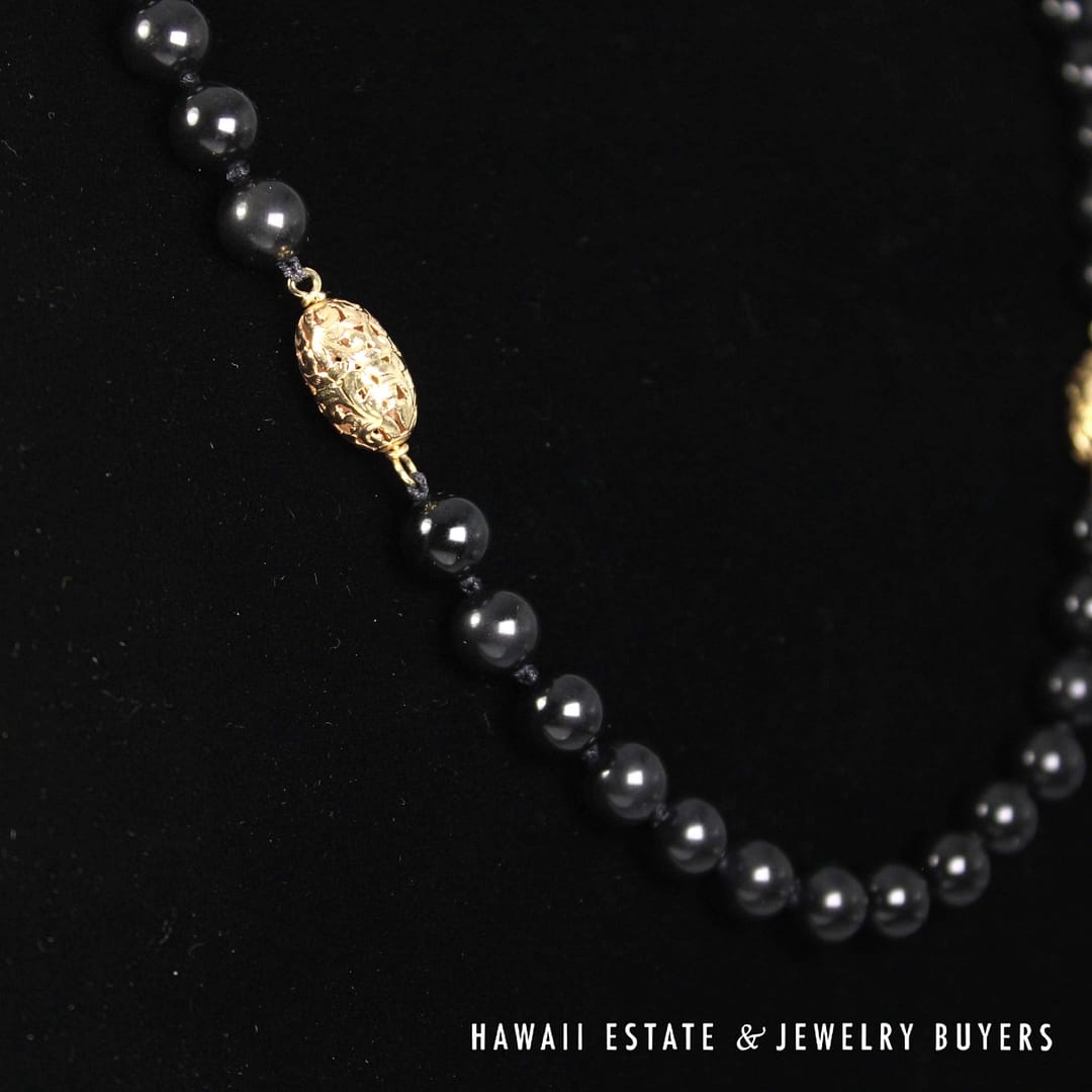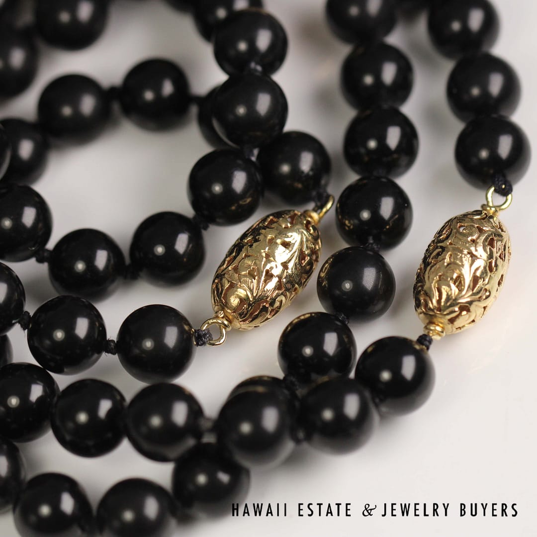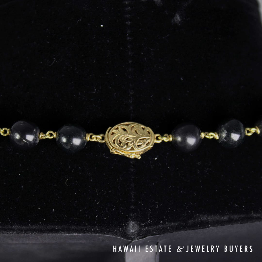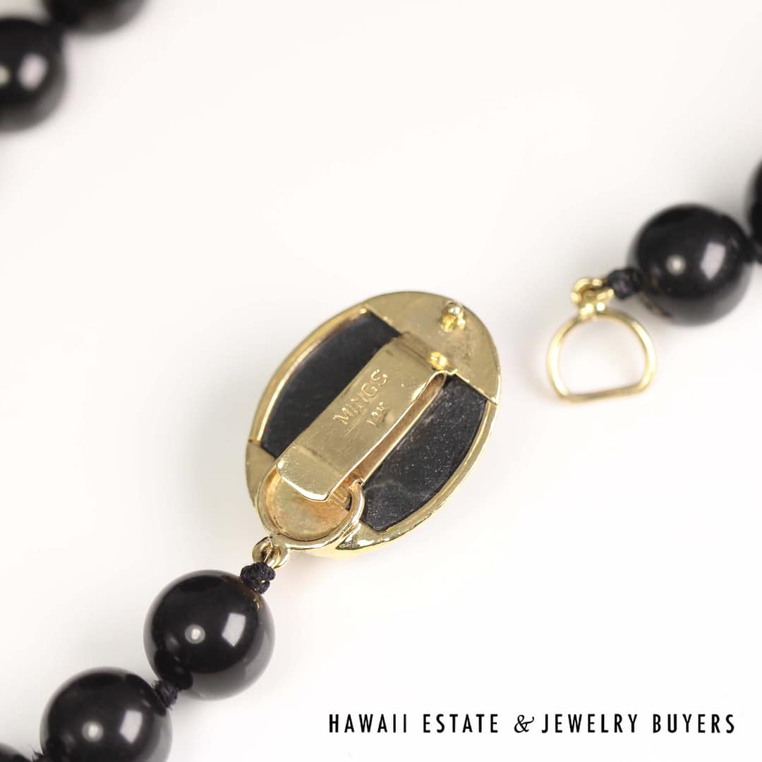 DescriptionA rare gorgeous set by Ming’s Hawaii featuring black jade beads accented by carved gold beads and matching gold ball stud earrings.MING’S 14KYG BLACK JADE AND GOLD BALL 30″ NECKLACE AND EARRING SET (2809-03)$3,500.001 in stockMing's Black Jade and Gold Ball 14k Yellow Gold 30" Necklace and Earring Set quantityAdd to cartMake OfferSKU: 2809-03Category: Pre-owned Ming's JewelryRelated StylesMing’s Hawaii Oval Carved Flower Large Jade 14K Yellow Gold Ring$1,800.00Ming’s Hawaii Pale Green Jade 14K Yellow Gold Bangle Bracelet$6,830.00Ming’s Hawaii 14K Yellow Gold Jade Hinged Bangle$7,710.00Ming’s White Jade14K Yellow Gold Set$3,800.00