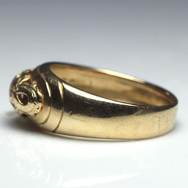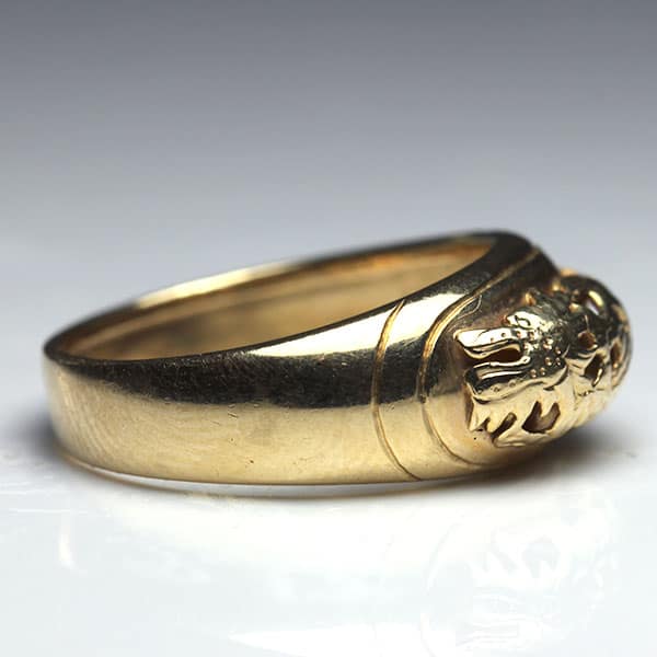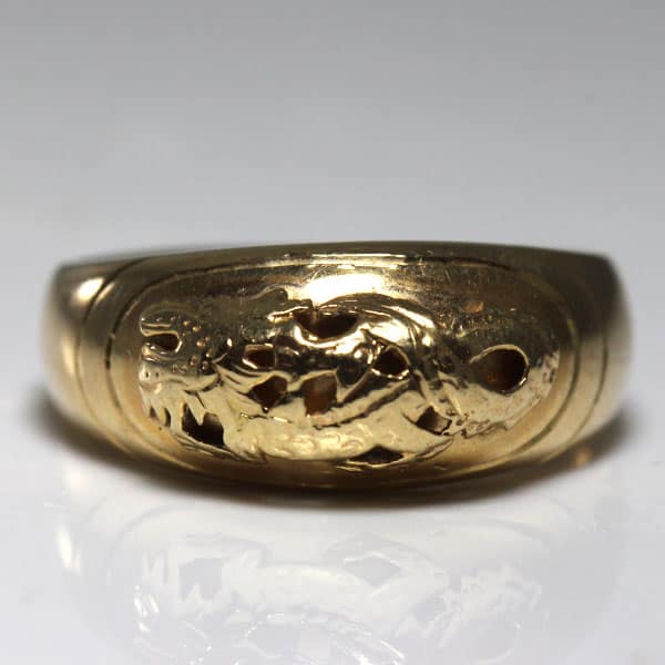DescriptionThe ring has an applied dragon motif on top of the dome ring. The ring measures approx. 3.88 – 8.10mm. Weight: 22.90gCirca: 1960’sSKU: 0909-53SOLD$380.00Out of stockSKU: 0909-53Category: Pre-owned Ming's JewelryRelated StylesMing’s Hawaii Pale Green Jade 14K Yellow Gold Bangle Bracelet$6,830.00Ming’s Hawaii Twin Jade Ball Pearl Ring$2,620.00Ming’s Hawaii Pale Green Twin Jade Ball & White Pearl Ring$1,600.00Ming’s Hawaii Jade & Pearl 14K Brooch$1,690.00