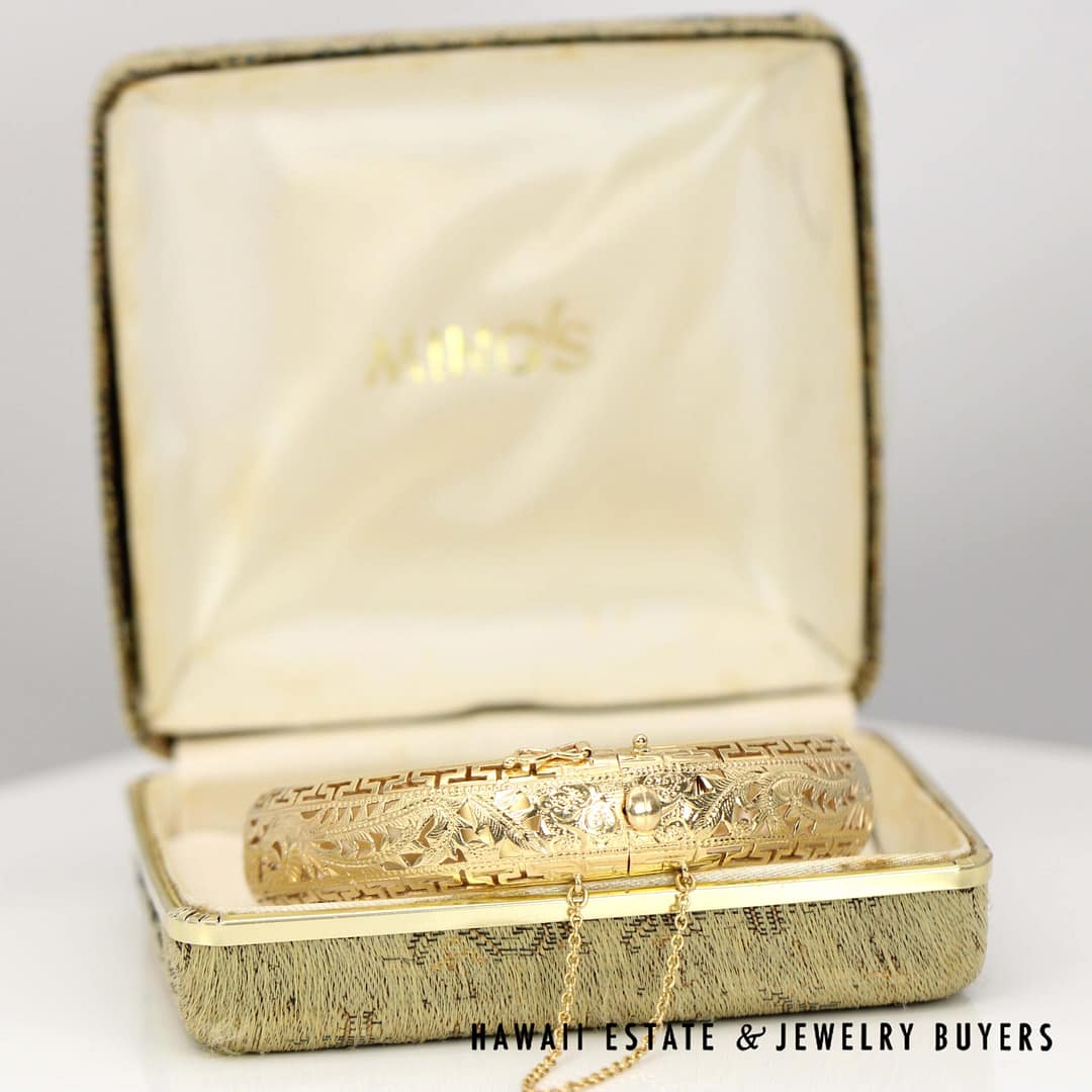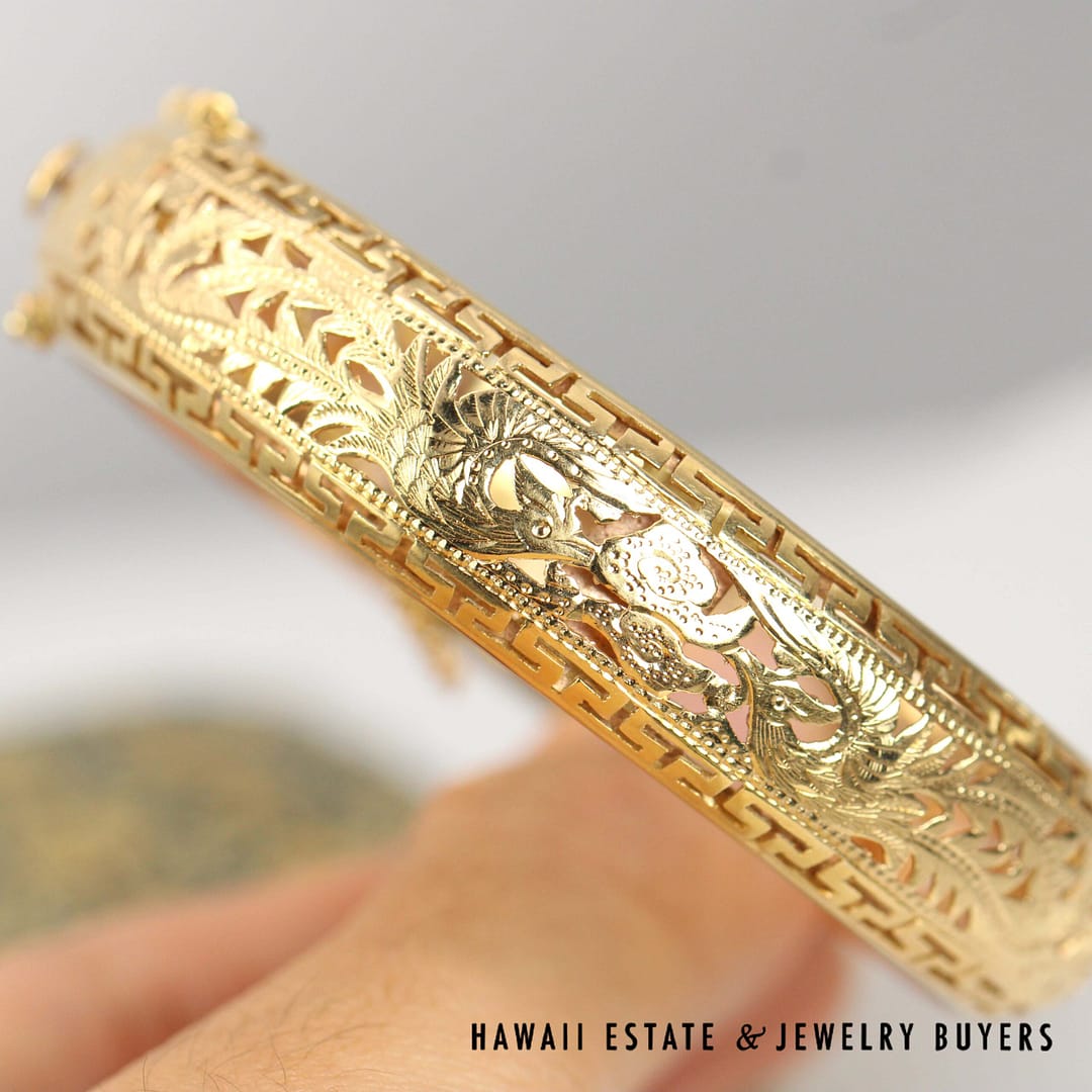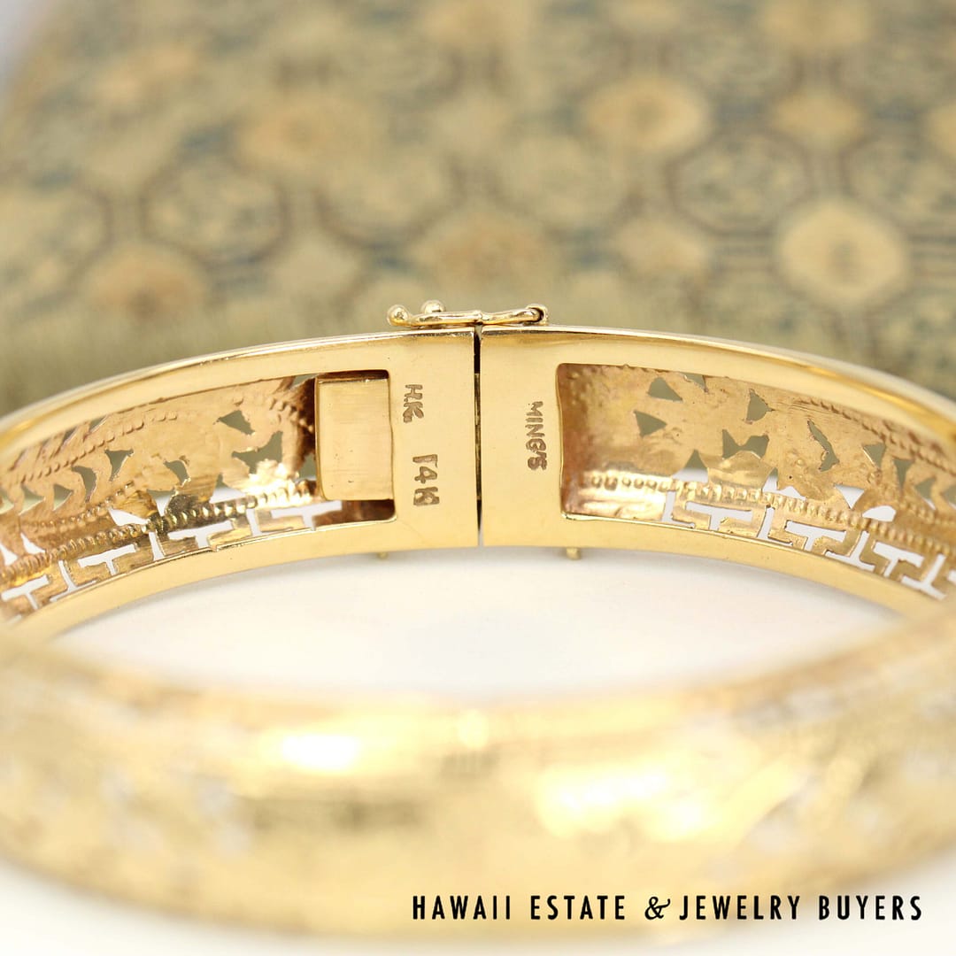 DescriptionMINGS 24.3g 14KYG GREEK KEY PHOENIX HINGED BANGLE BRACELET SIZE 7.25 WITH BOX (2779-01)$6,075.001 in stockMing's Greek Key Phoenix Hinged 14K Yellow Gold Bangle Bracelet Size 7.25 with Box quantityAdd to cartBuy withMake OfferSKU: 2779-01Category: Pre-owned Ming's JewelryRelated StylesMing’s White Jade14K Yellow Gold Set$3,800.00Ming’s Lavender Jade & Pearl Ring$3,600.00Ming’s Hawaii Jade Cabochon Pearl Ring$2,975.00Ming’s Hawaii Pearl Cluster Flower 14K Ring$1,100.00