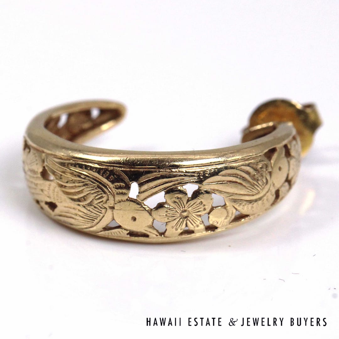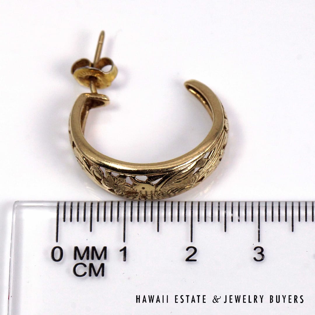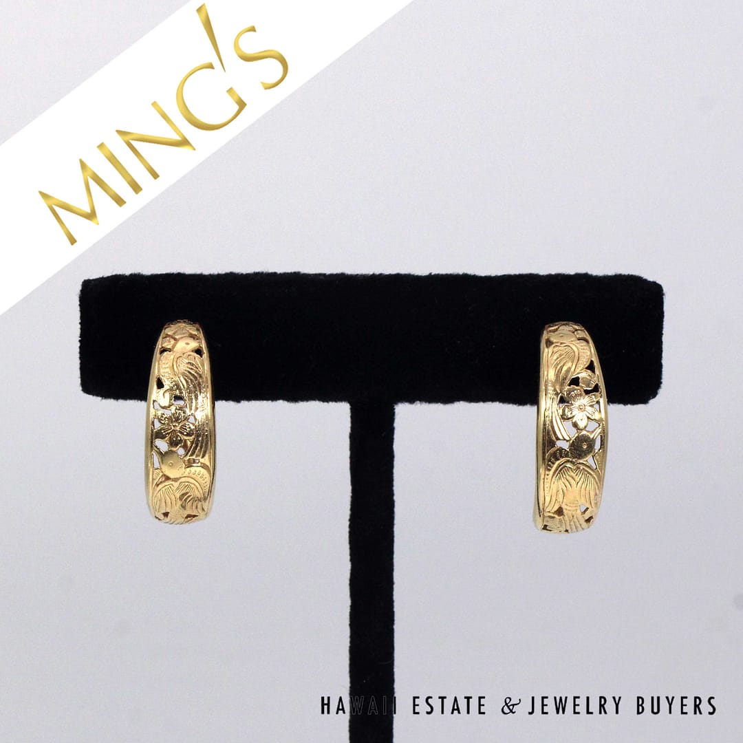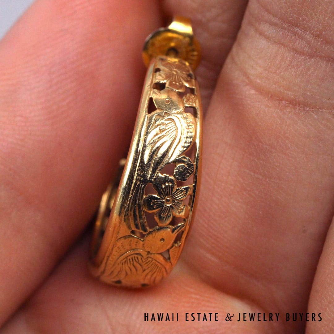 Ming's Hawaii Bird in Plum open hoop earrings crafted in solid 14K yellow gold, featuring the iconic floral and bird motif in a classic 24mm hoop design, showcasing exceptional vintage island craftsmanship and timeless elegance.