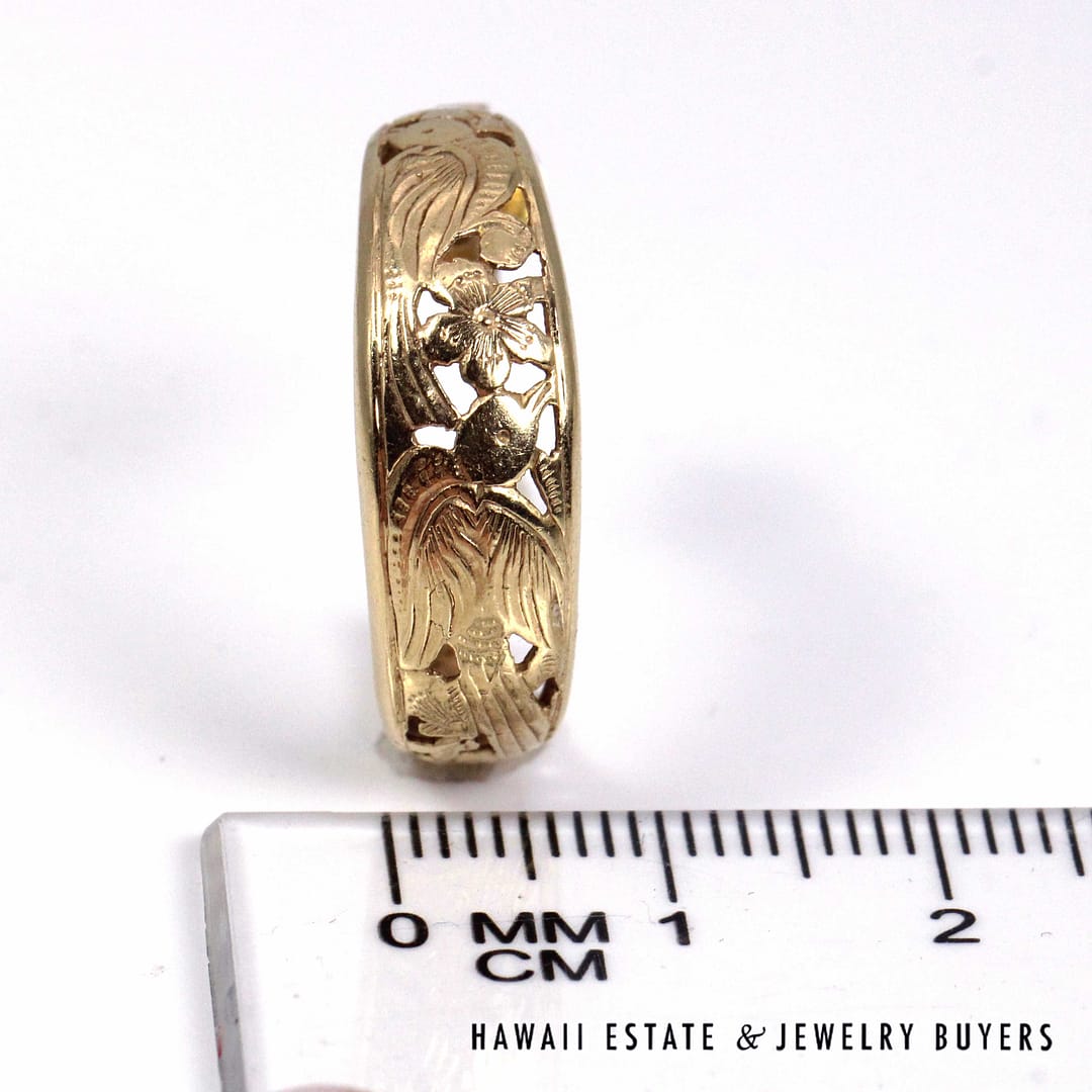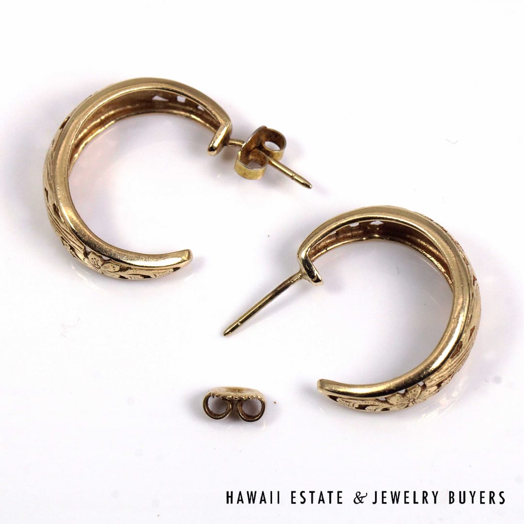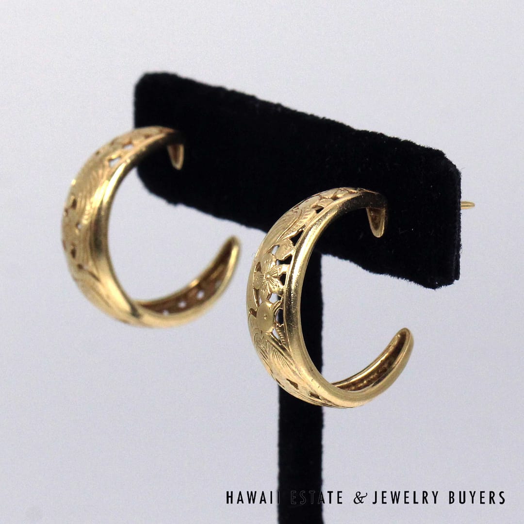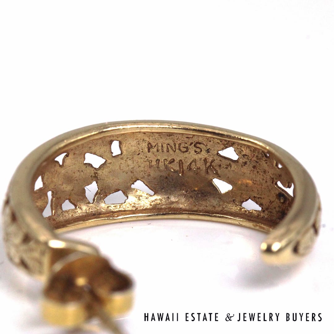Ming's Hawaii Bird in Plum open hoop earrings crafted in solid 14K yellow gold, featuring the iconic floral and bird motif in a classic 24mm hoop design, showcasing exceptional vintage island craftsmanship and timeless elegance.