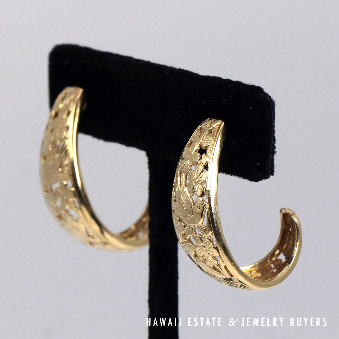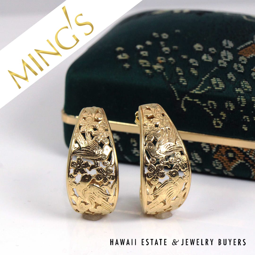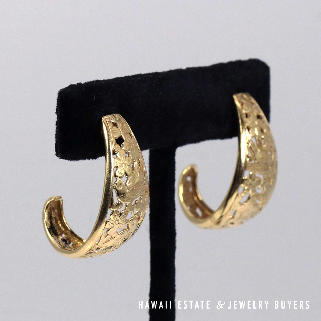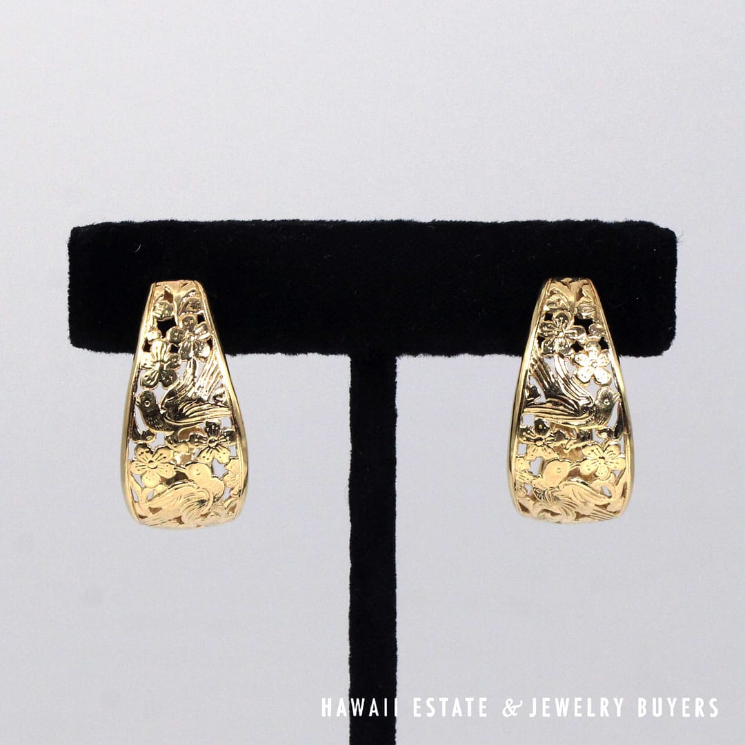 Elegant Ming's Hawaii J-hoop earrings crafted in solid 14K yellow gold, featuring intricate openwork bird-in-plum blossom motifs with a graceful, sculptural silhouette.