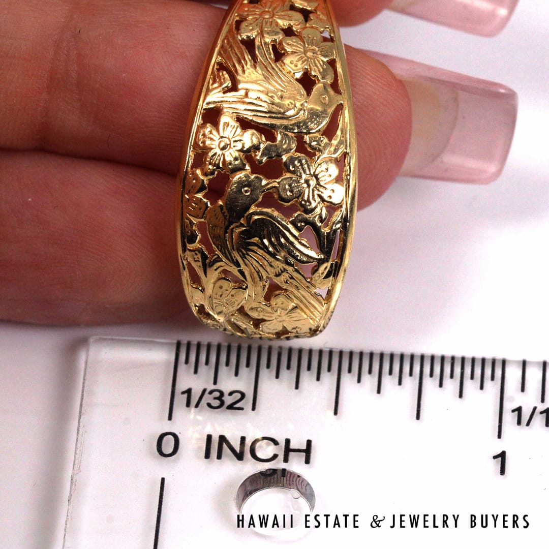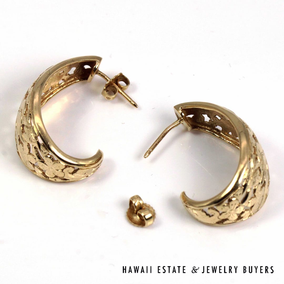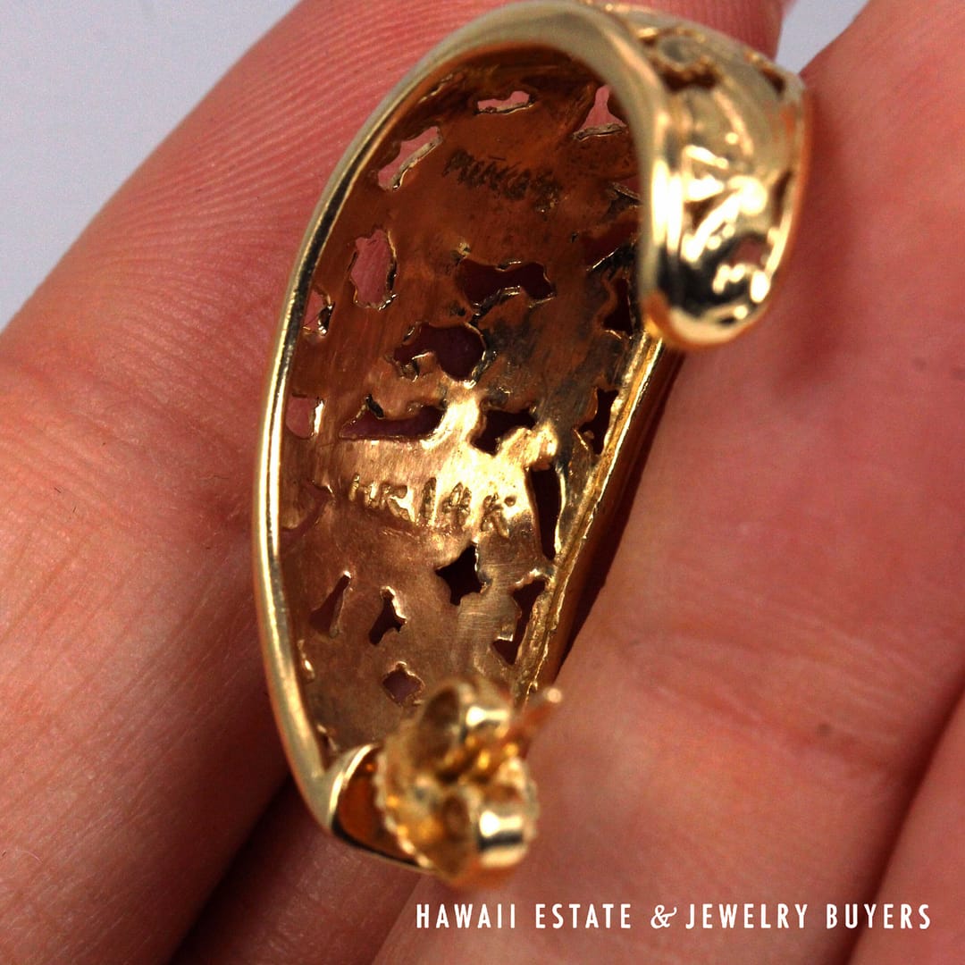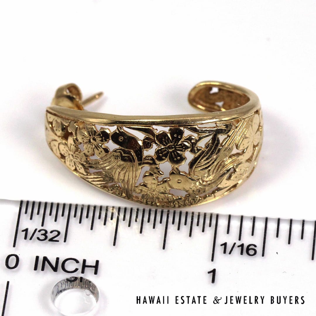 Elegant Ming's Hawaii J-hoop earrings crafted in solid 14K yellow gold, featuring intricate openwork bird-in-plum blossom motifs with a graceful, sculptural silhouette.
