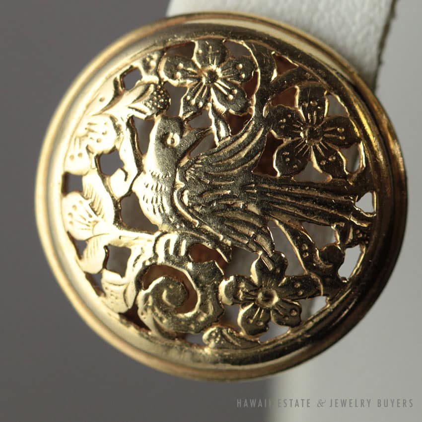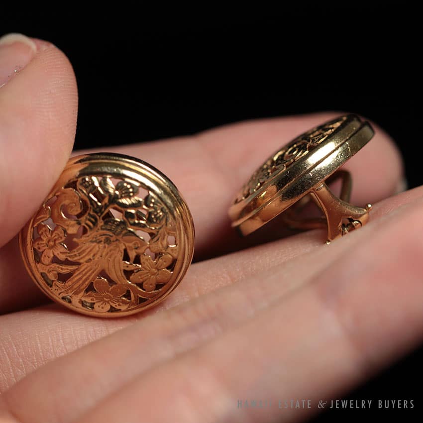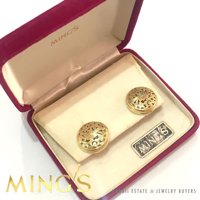 DescriptionSigned, authenticMetal: 14K Yellow GoldFastening: Pierced, lever backSize: approx. 19mm diameterWeight: 9.4gSKU: 1772-03$1,500.00Out of stockSKU: 1772-03Category: Pre-owned Ming's JewelryRelated StylesMing’s Hawaii Jade Cabochon Pearl Ring$2,975.00Ming’s Hawaii Twin Jade Ball Pearl Ring$1,760.00Ming’s Hawaii Pearl & Multi-Color Jade Cluster 14K Ring$3,580.00Ming’s Hawaii Pearl Cluster Leaf 14K Ring$2,140.00